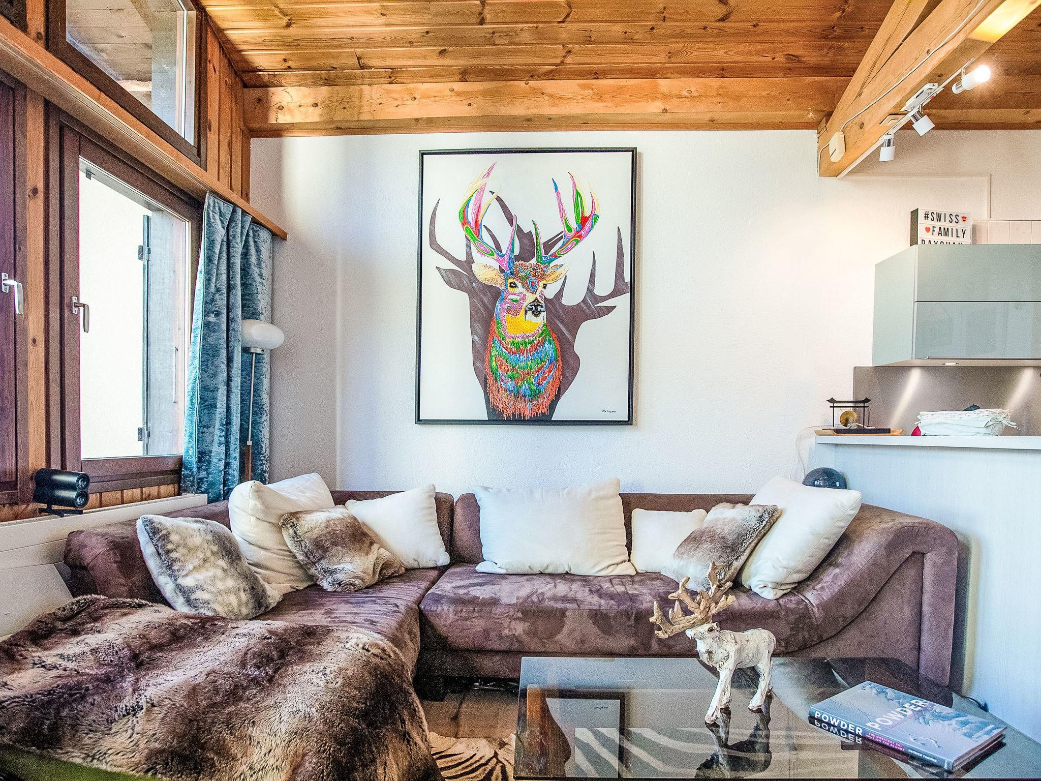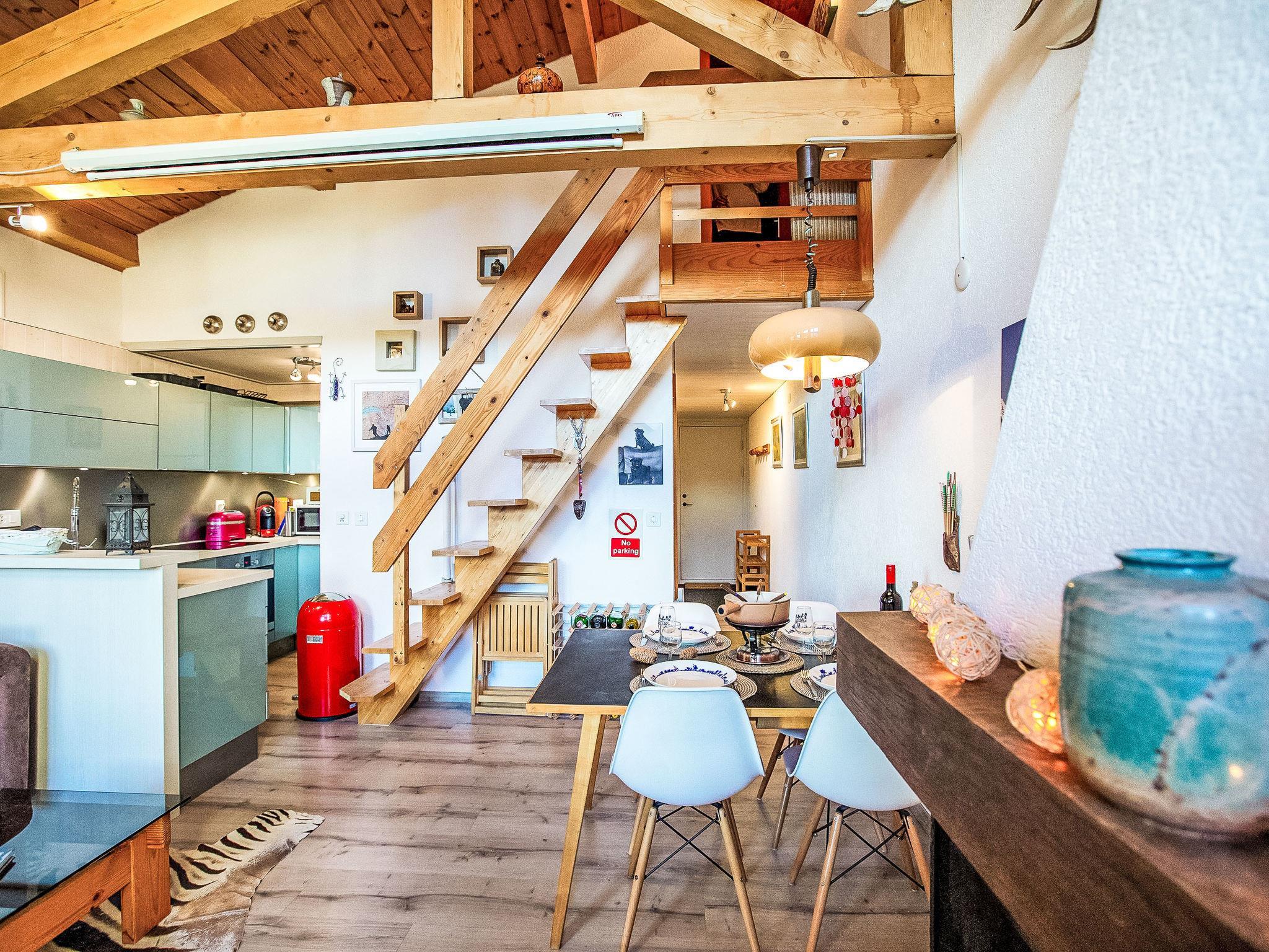 "Les Arsets 308/15", 3-Zimmer-Attikawohnung 65 m2 auf 2 Stockwerken, im Erdgeschoss, Südlage. Renoviert, zweckmässig und schön eingerichtet: Wohn-/Esszimmer mit offenem Kamin und Esstisch. Ausgang zum Balkon, Richtung Süden. 1 Zimmer mit 1 franz. Bett (1 x 160 cm). Kleine, offene Küche (Backofen, Geschirrspüler, 4 Induktionskochplatten, Toaster, Wasserkocher, Mikrowelle, elektrische Kaffeemaschine, Kapseln für die Kaffeemaschine (Chicco D'Oro) extra, Racletteofen, Fondue Set (Käse)). Dusche/WC. Obergeschoss: (steile Treppe) 1 Zimmer mit 1 Doppelbett (1 x 160 cm), Bad/WC. Balkon, Südlage. Terrassenmöbel. Sehr schöne Sicht auf die Berge. Zur Verfügung: Internet (WLAN, gratis). Parkplatz Nr. 308/15 (überdacht, 1 Auto). Bitte beachten: Kühlschrank ohne Gefrierfach, Nichtraucher-Unterkunft. Kein Fahrstuhl.