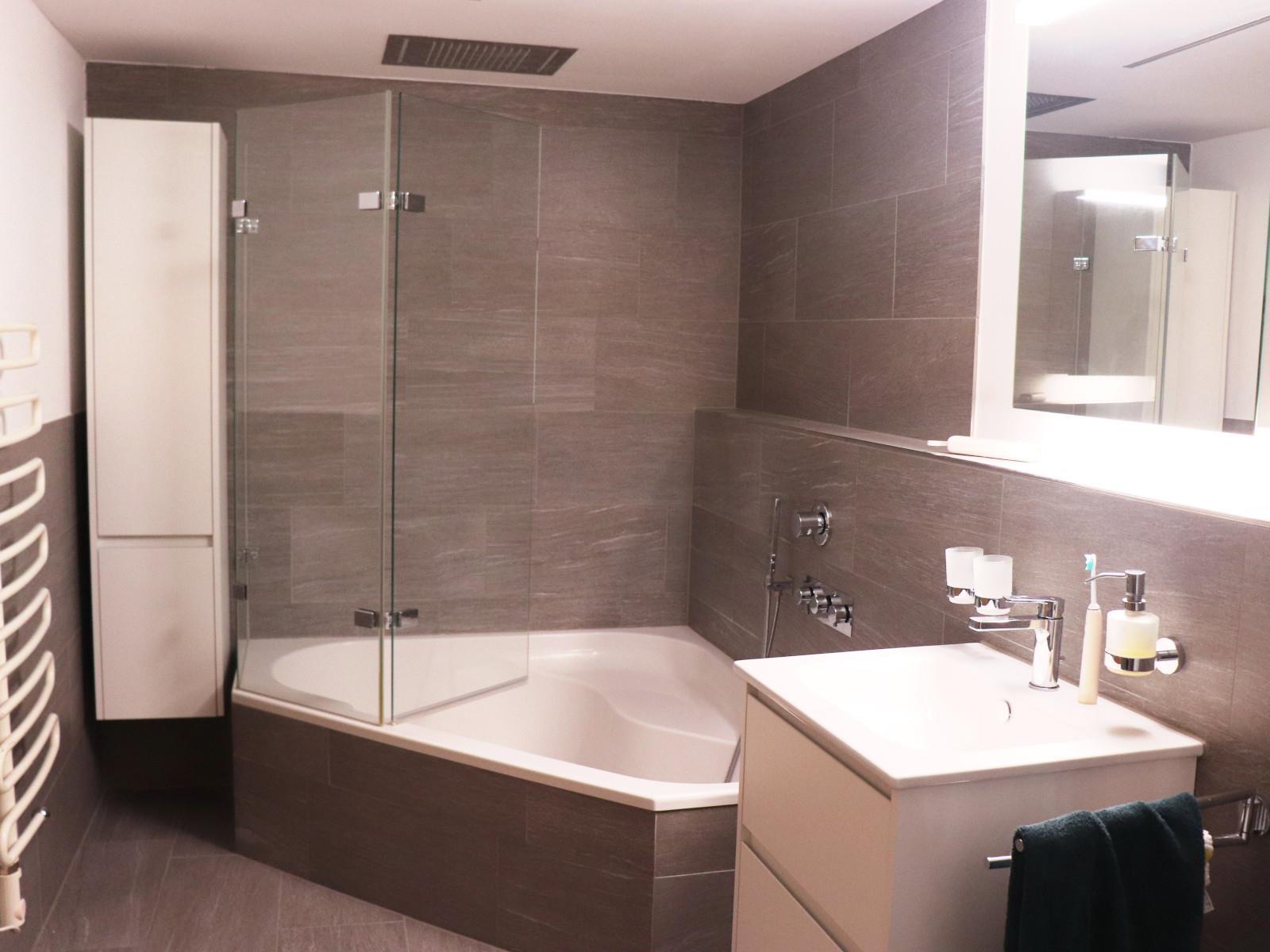 Neues und modernes Badezimmer mit Eckbadewanne. Das Badezimmer und das Schlafzimmer befinden sich auf der unteren Etage.