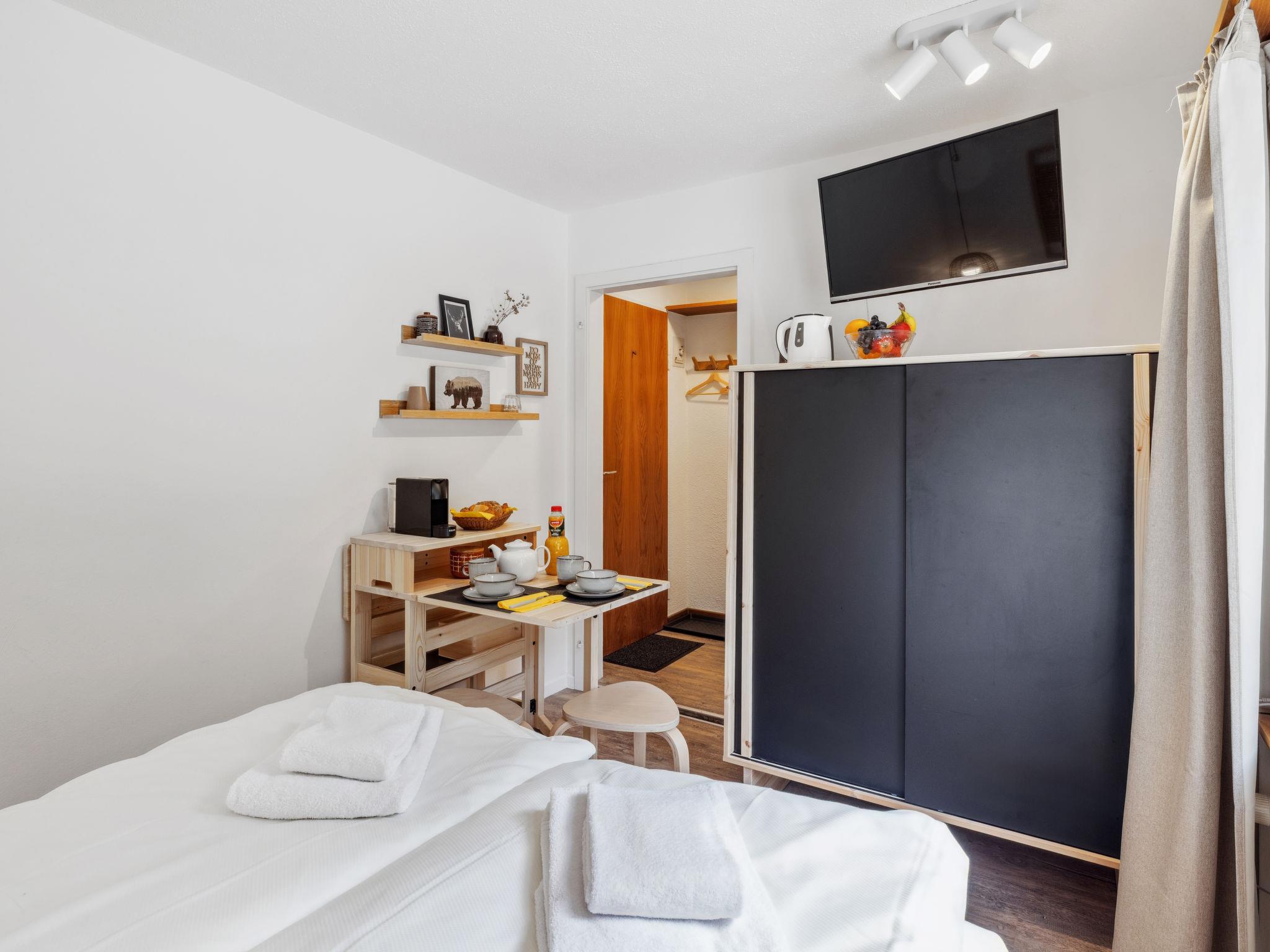 1-Zimmer-Wohnung 16 m2, im Erdgeschoss. Renoviert im Jahre 2024, komfortabel und gemütlich eingerichtet: Wohn-/Schlafzimmer mit 1 franz. Bett (140 cm, Länge 200 cm), Sat-TV (Flachbildschirm). (Toaster, Wasserkocher, elektrische Kaffeemaschine) mit Esstisch. Dusche/WC. Zur Verfügung: Internet (WLAN, gratis). Bitte beachten: Nichtraucher-Unterkunft. ohne Kochgelegenheit, mit Kühlschrank. Rückwärtige Lage.