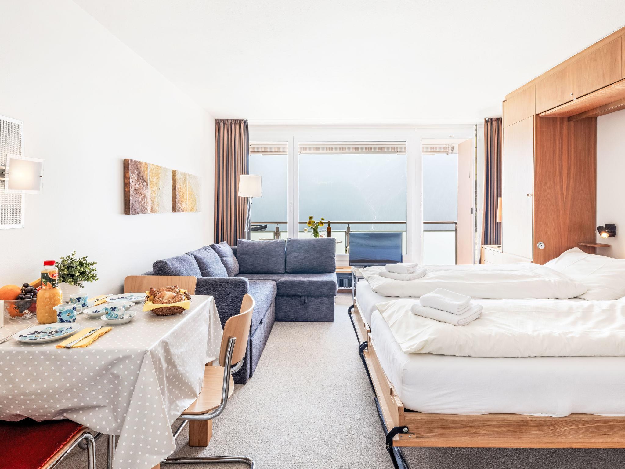 1-Zimmer-Wohnung 28 m2 im 1. Stock, Ostlage. Teilweise renoviert, gemütlich eingerichtet: Wohn-/Esszimmer mit 2 Wandschrankbetten und Sat-TV (Flachbildschirm), Radio. Ausgang zum Balkon. Kochnische (Geschirrspüler, 2 Glaskeramikplatten). Sitzbad/WC. Balkon, Ostlage. Balkonmöbel. Schöne Sicht auf die Berge, die Landschaft und die Ortschaft. Zur Verfügung: Internet (Wireless LAN, gratis). Bitte beachten: Nichtraucher-Unterkunft.