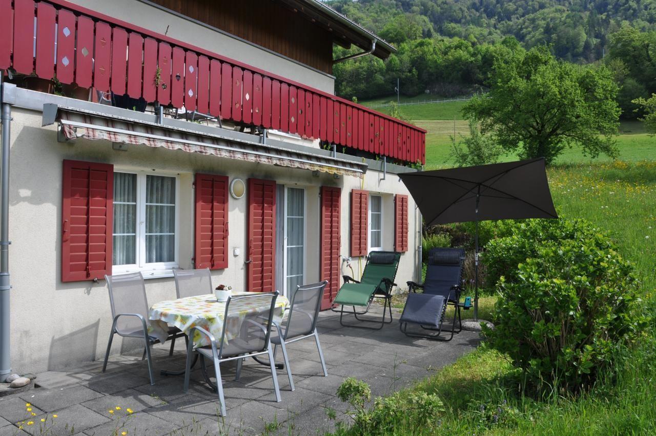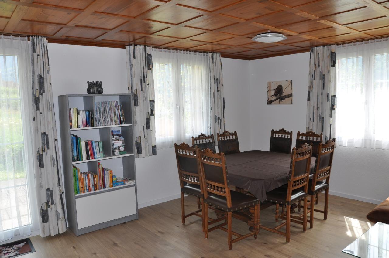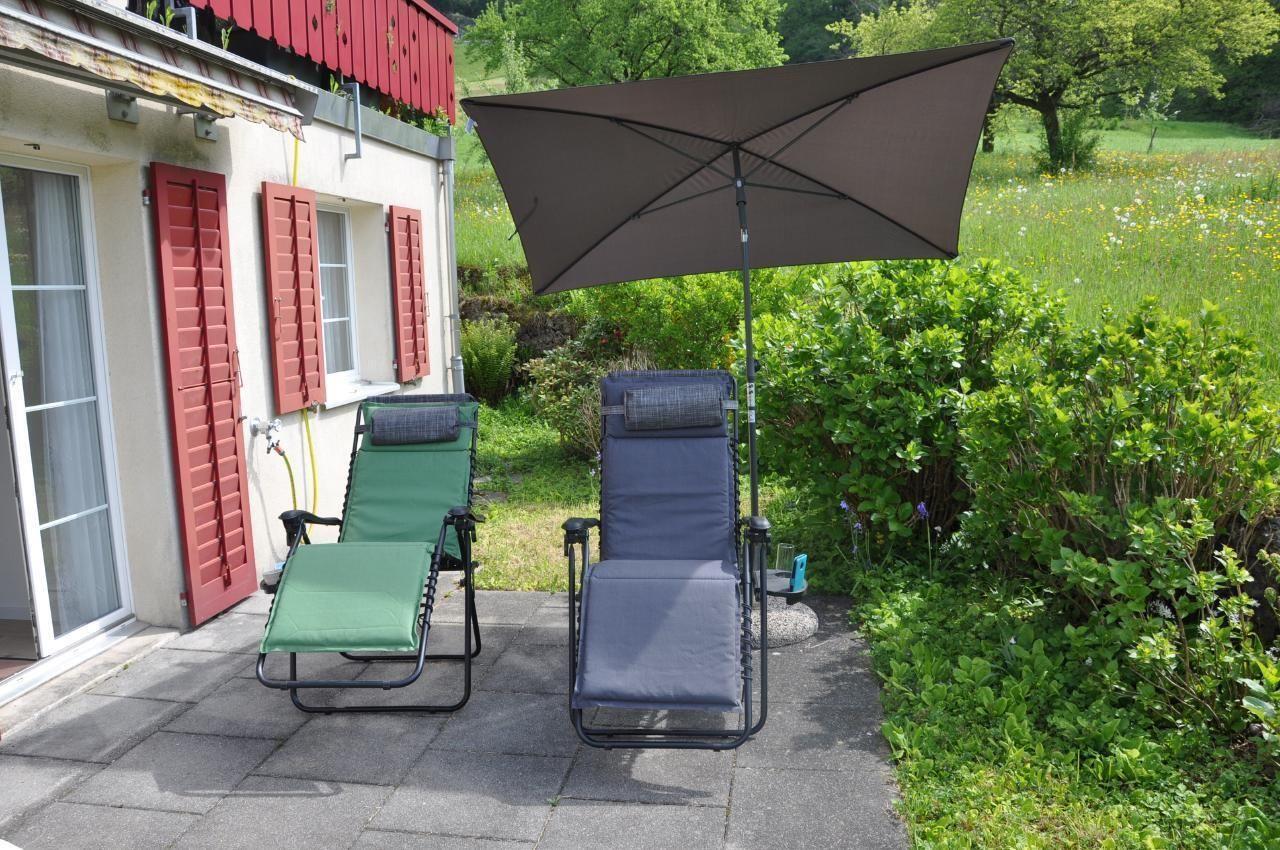 Ausserhalb der Wohnung steht Ihnen ein privater Sitzplatz zur Verfügung, der mit einem Tisch, Sitzgelegenheiten und zwei Liegestühlen zur Entspannung einlädt. Geniessen Sie das ruhige Landleben und lassen Sie den Blick über die malerischen Landschaften schweifen.