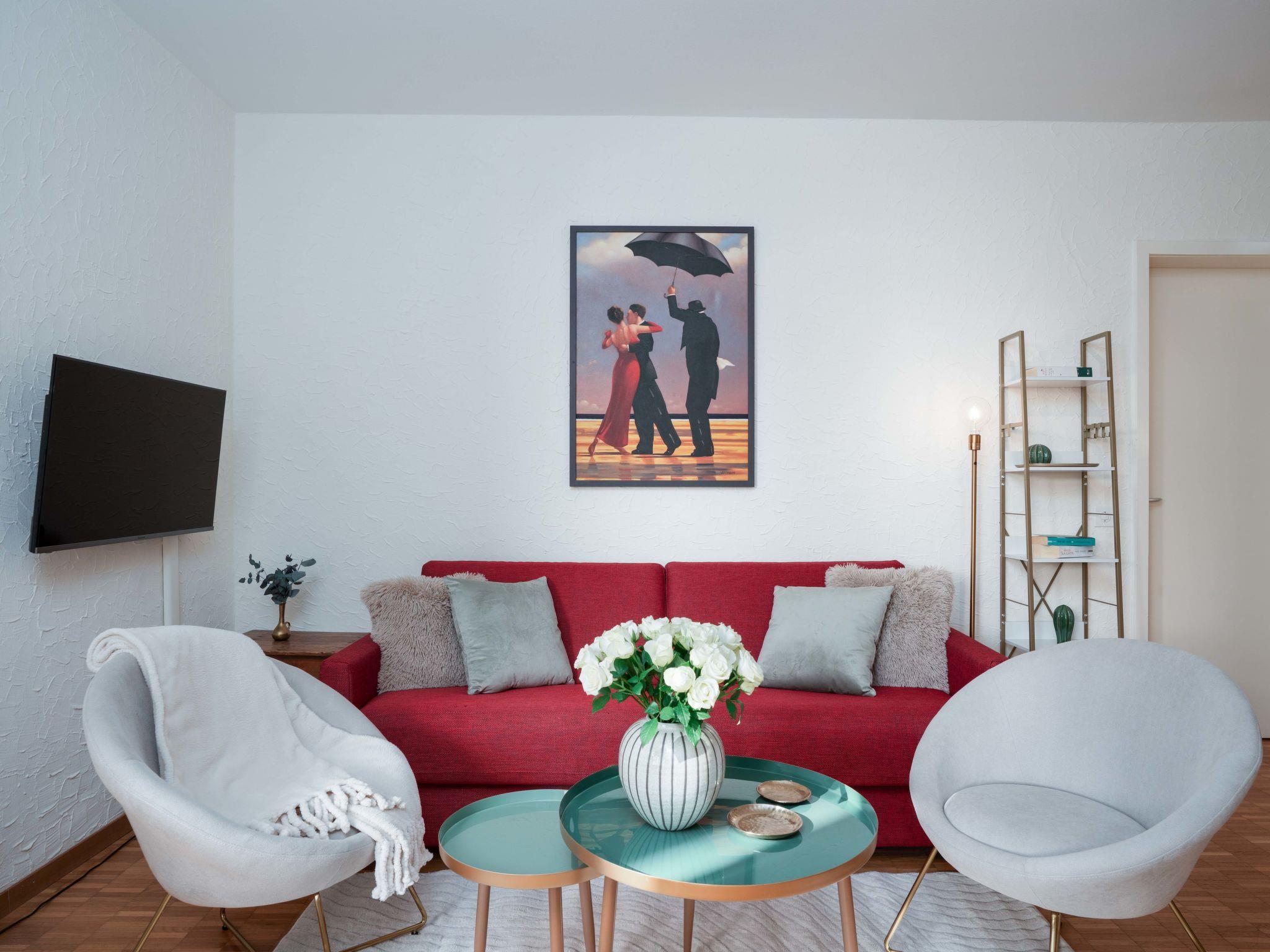 "Junior Suite Classic", 2-Zimmer-Wohnung 60 m2 im 1. Stock, Westlage. Wohn-/Schlafzimmer mit 1 Doppeldiwanbett (1 x 160 cm, Länge 200 cm), Sat-TV und Radio. 1 Zimmer mit 1 Doppelbett (1 x 200 cm, Länge 200 cm). Offene Küche (Backofen, elektrische Kaffeemaschine, Kapseln für die Kaffeemaschine (Nespresso) extra). Bad/WC. Ölheizung. Balkon. Eingeschränkte Sicht auf den See. Zur Verfügung: Internet (Wireless LAN, gratis). Bitte beachten: Nichtraucher-Unterkunft, Nichtraucher-Haus. Maximal 1 Haustier/Hund erlaubt. NL-00004941