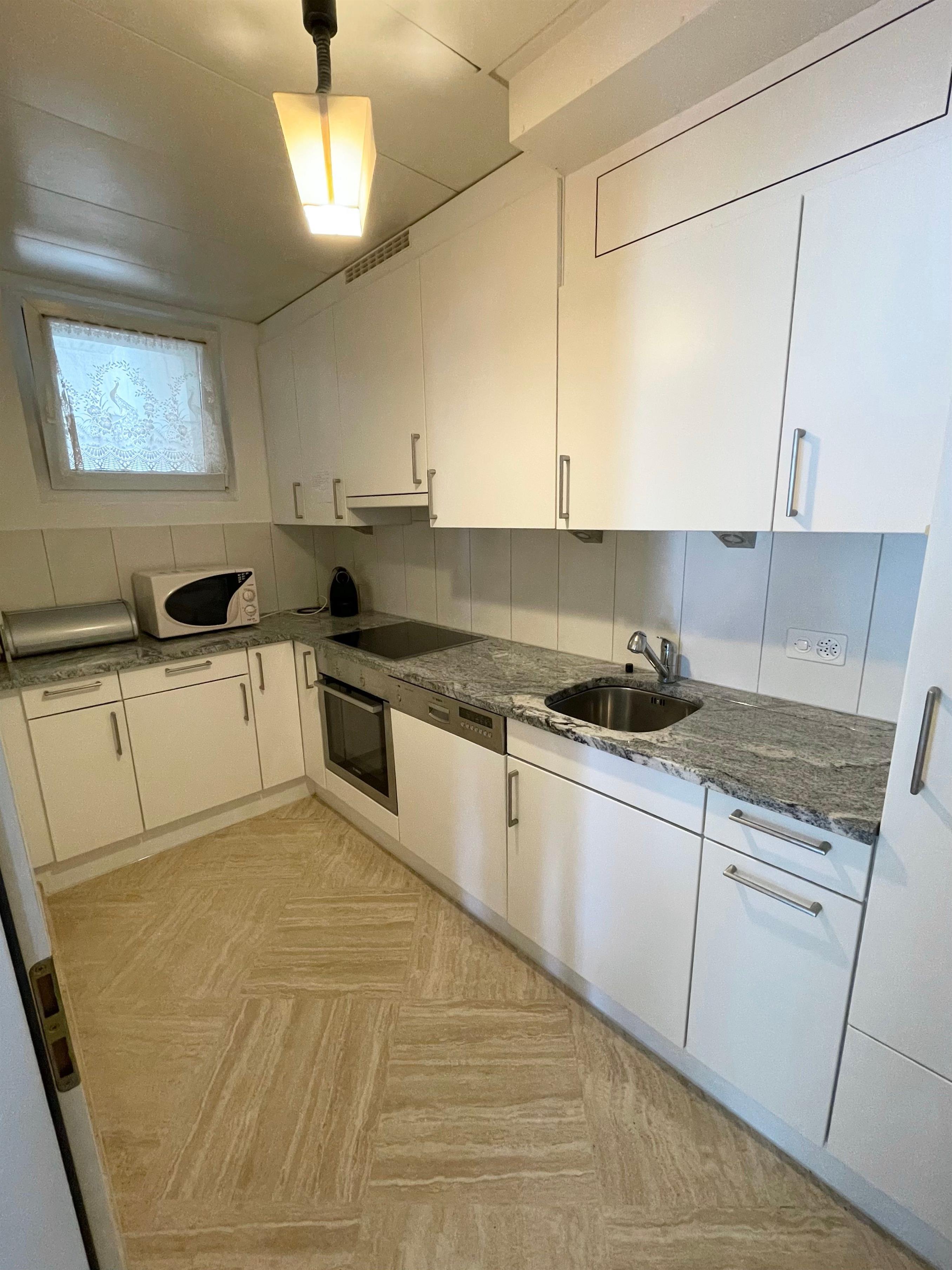 Der Innenbereich der nach Süden ausgerichteten Wohnung verwöhnt Sie mit geräumiger Gastfreundschaft und durchdachter Ausstattung: Vom einladenden Eingangsbereich mit Garderobe über das großzügige Wohnzimmer bis hin zur vollständig ausgestatteten Küche - hier finden Sie alles, was das Herz begehrt. Dazu gehören ein 220 Liter Kühlschrank, ein Keramikherd mit Sichtbackofen, Mikrowellenofen, Geschirrspüler und ausreichend Schränke für Ihre Vorräte. Zwei komfortable Schlafzimmer, jedes mit einem eigenen Bad, WC mit Doppellavabo bzw. Dusche-WC mit Lavabo sowie Waschmaschine und Tumbler, runden das Angebot ab.
