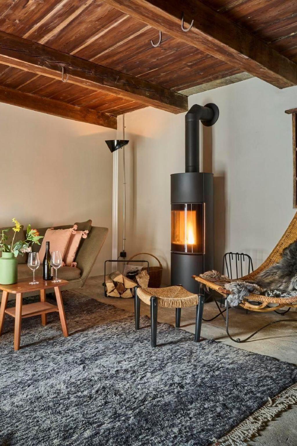 Heizung: Zwei moderne Kaminöfen - die Gäste heizen selbst mit Holz.