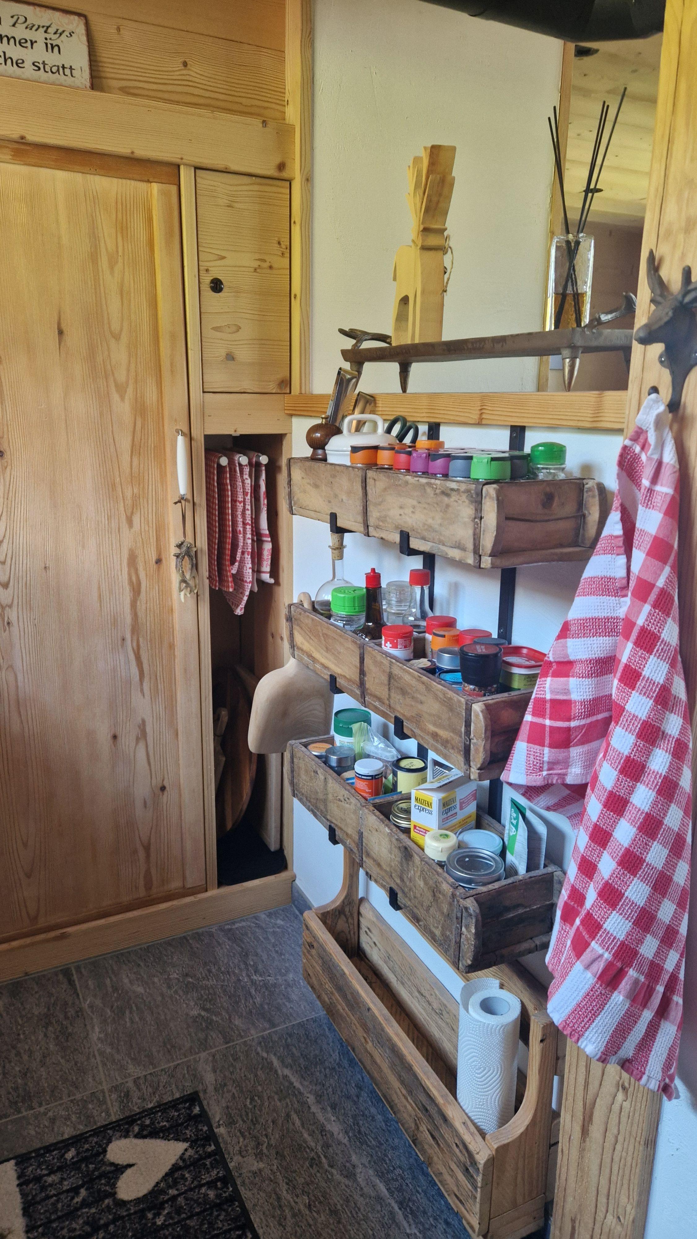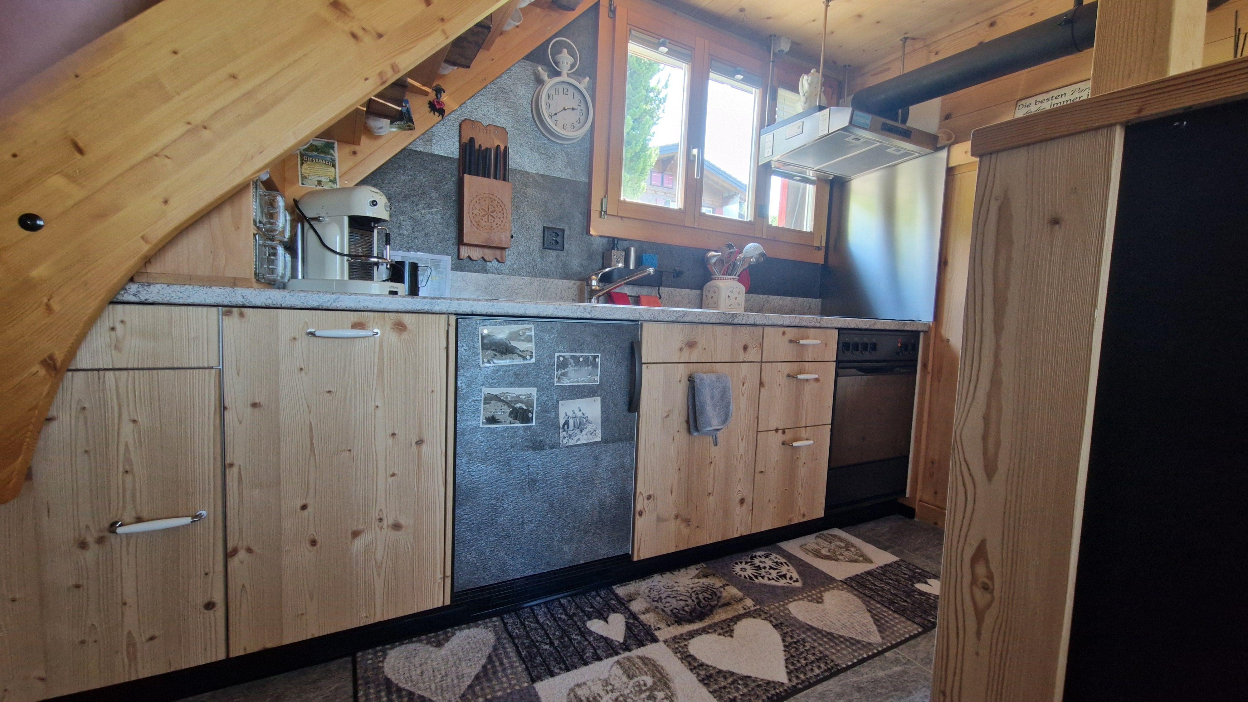 Sonstige Kücheneinrichtung (Küche1): Küche zum Wohnzimmer offen, inkl. Kaffeemaschine (Nespresso), Special-Tea Maschine, Milchschäumer, Toaster, Mixer, Stabmixer, Wasserkocher, Fondue-Caquelon, Racletteofen, Kühlschrank inkl. Gefrierfach, Glaskeramik-Kochfeld mit 4 Platten, Geschirr und Essbesteck für 8 Personen. Die gängigsten Gewürze sowie Spühlmittel sind vorhanden.