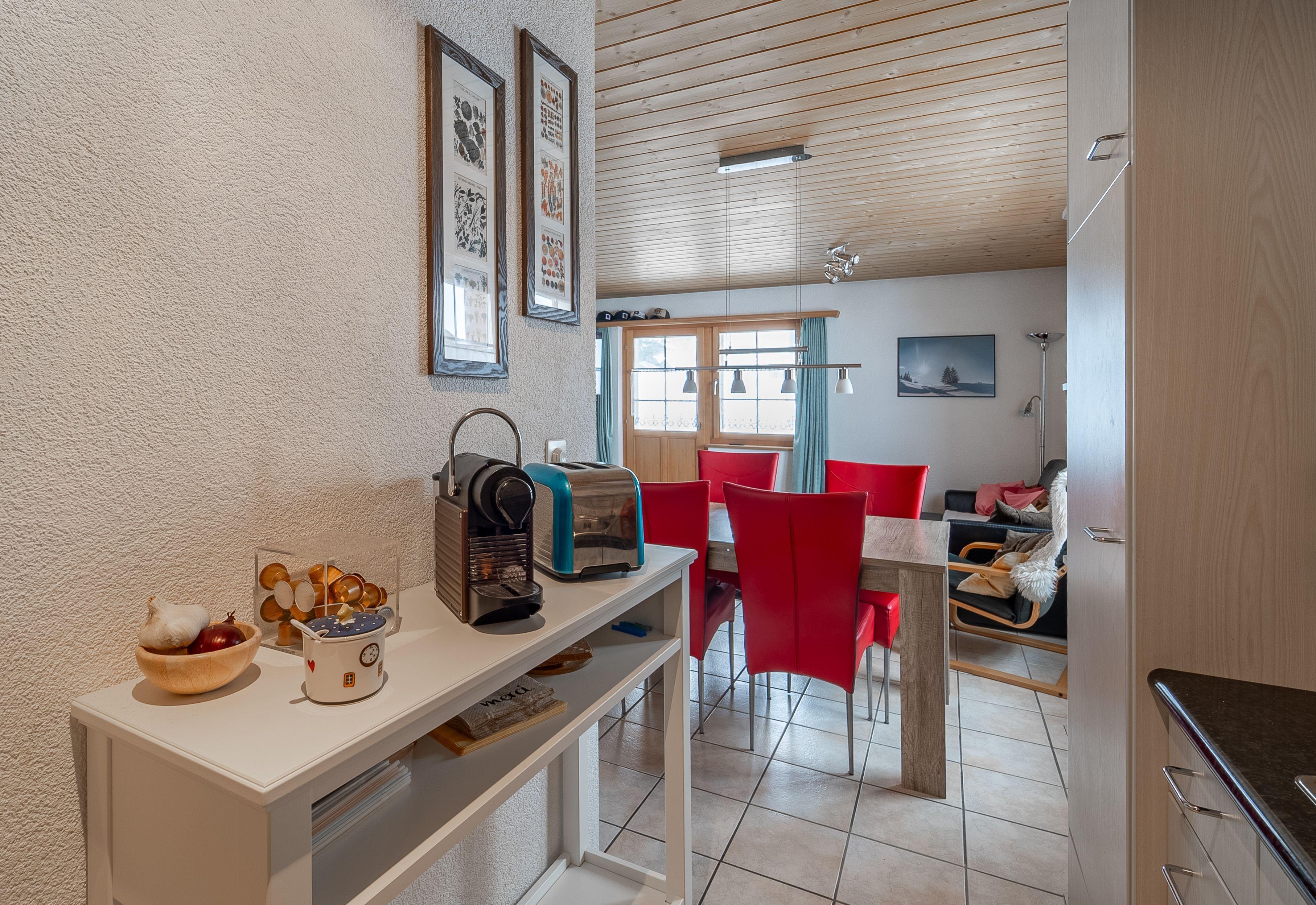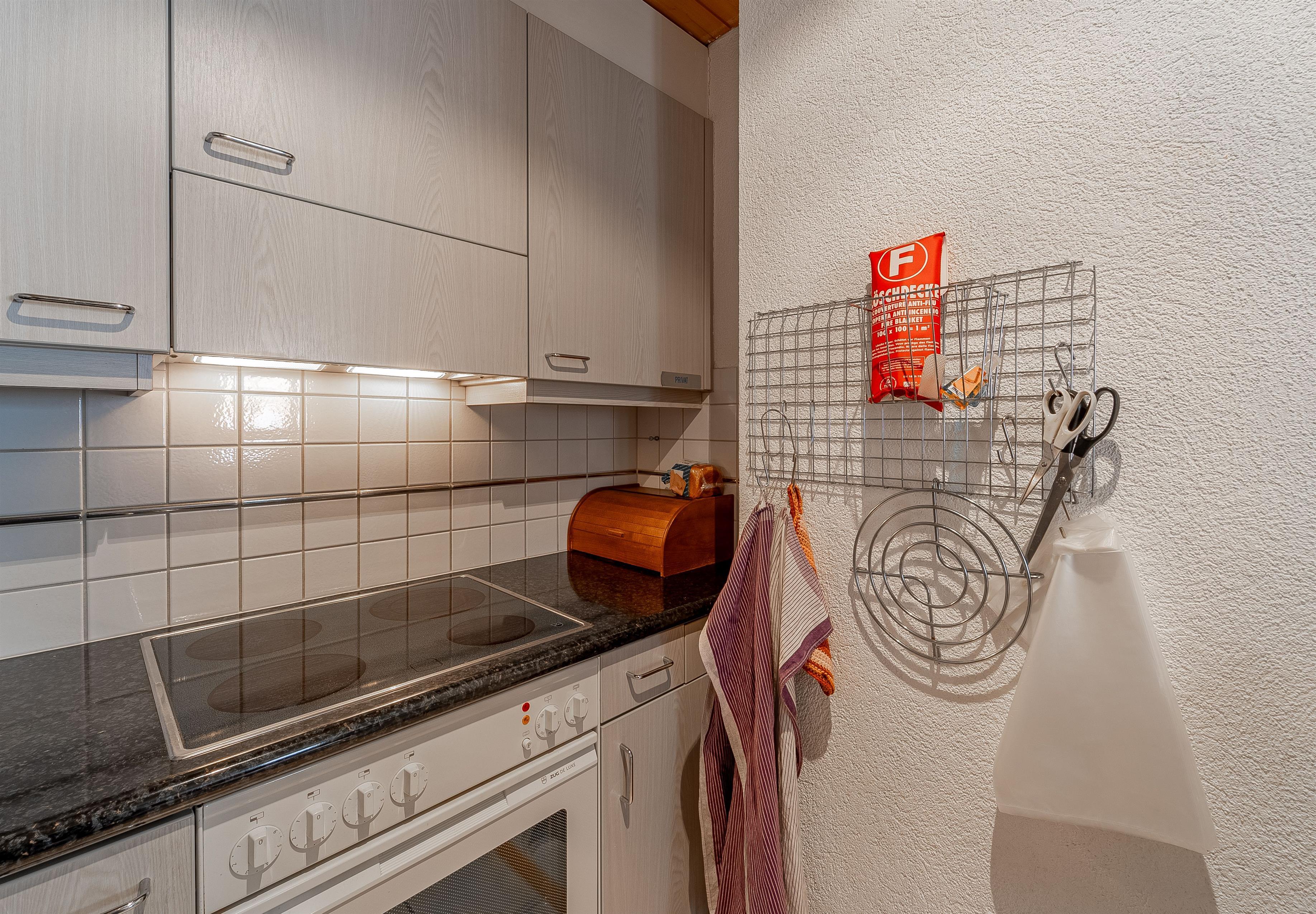 Die Küche ist komplett ausgestattet mit Mikrowelle, Kaffeemaschine (Nespresso), Toaster, Mixer, Wasserkocher, Fondue-Caquelon, Racletteofen, Kühlschrank inkl. Gefrierfach, Glaskeramik-Kochfeld mit 4 Platten, Geschirr und Essbesteck. Die gängigsten Gewürze sowie Spülmittel sind vorhanden. Bettwäsche, Duschtücher und Küchentücher sind vorhanden.