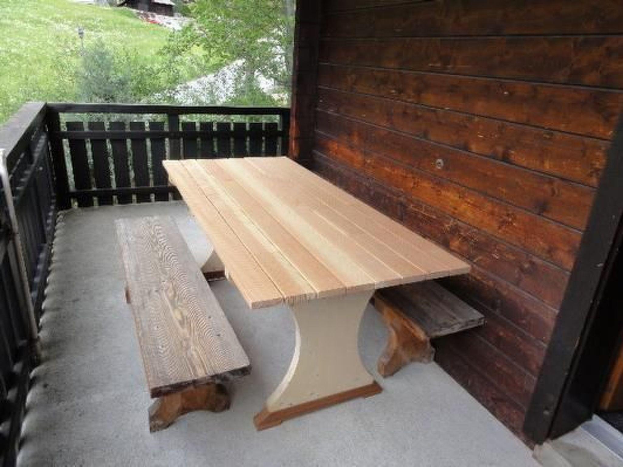 Im Außenbereich der Wohnung finden Sie einen Parkplatz direkt vor dem Haus. Die Lage am Eingang des Dorfes sorgt für eine ruhige Atmosphäre, während ein kleines Bächlein direkt zwischen Haus und Straße, die nach Blatten führt.