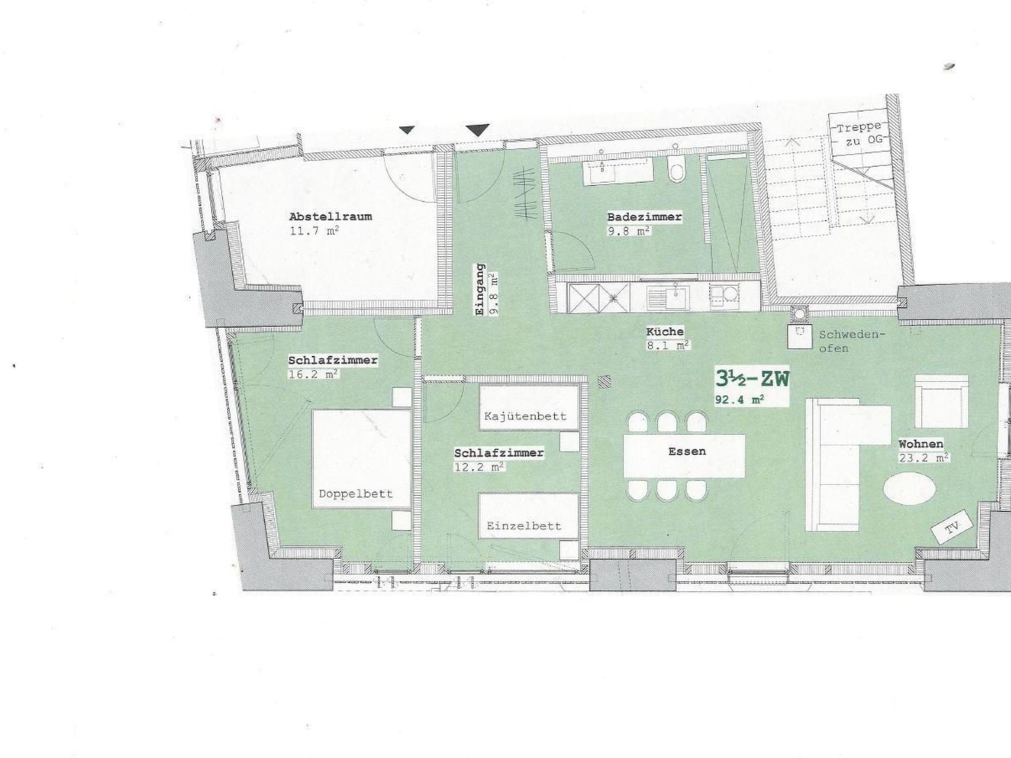 Die neue grosszügige Ferienwohnung (90m2) befindet sich im Erdgeschoss und bietet Platz für 2-5 Personen.Es eignet sich besonders für Familien. Für Kleinkinder gibt es einen Hochstuhl und ein Kinderbettt. Sportgeräte (Ski, Schlitten, Fahrrad) und Kinderwagen finden im Abstellraum im EG einen sicheren Platz. In der neuen modernen Küche gibt es einen Geschirrspüler. Fernseher und Internet sind vorhanden.