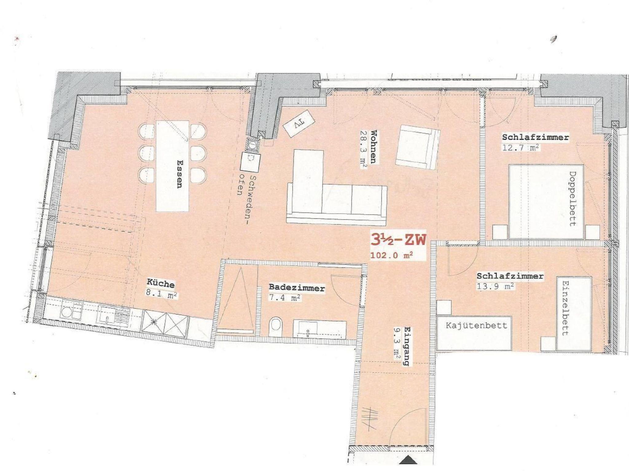Die neue grosszügige 3.5-Zimmer-Ferienwohnung (90m2) befindet sich im 1. Obergeschoss und bietet Platz für 2-5 Personen.
