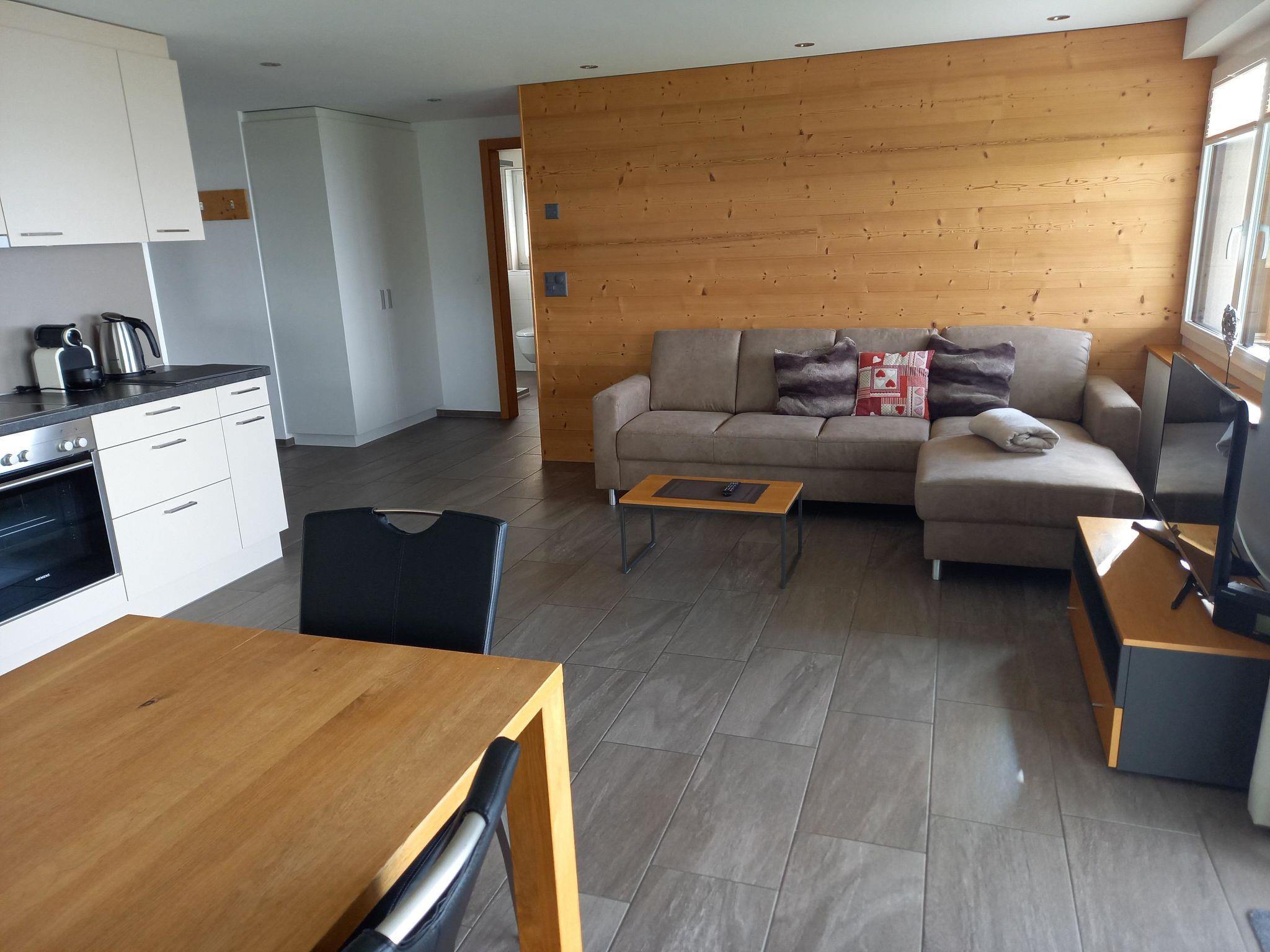 Die 3 1/2 Zimmerwohnung im Erdgeschoss bietet Platz für bis zu fünf Personen. Das Hauptschlafzimmer ist mit einem Doppelbett ausgestattet, während das zweite Schlafzimmer über zwei Einzelbetten sowie ein praktisches Ausziehbett verfügt. Die offene Wohnküche ist hell gestaltet und beinhaltet neben dem Esstisch auch einen Geschirrspüler sowie weitere Küchengeräte für den täglichen Bedarf. Direkt an die Küche schliesst der Wohnbereich mit einem Sofa und einem Fernseher an. Die Nasszelle ist mit einer Dusche, einem Lavabo und einer Toilette ausgestattet. Ein besonderes Highlight ist der nach Süden ausgerichtete Gartensitzplatz, der mit Gartenmöbeln ausgestattet ist und sowohl Sonne als auch Ausblick auf die umliegende Bergwelt bietet.