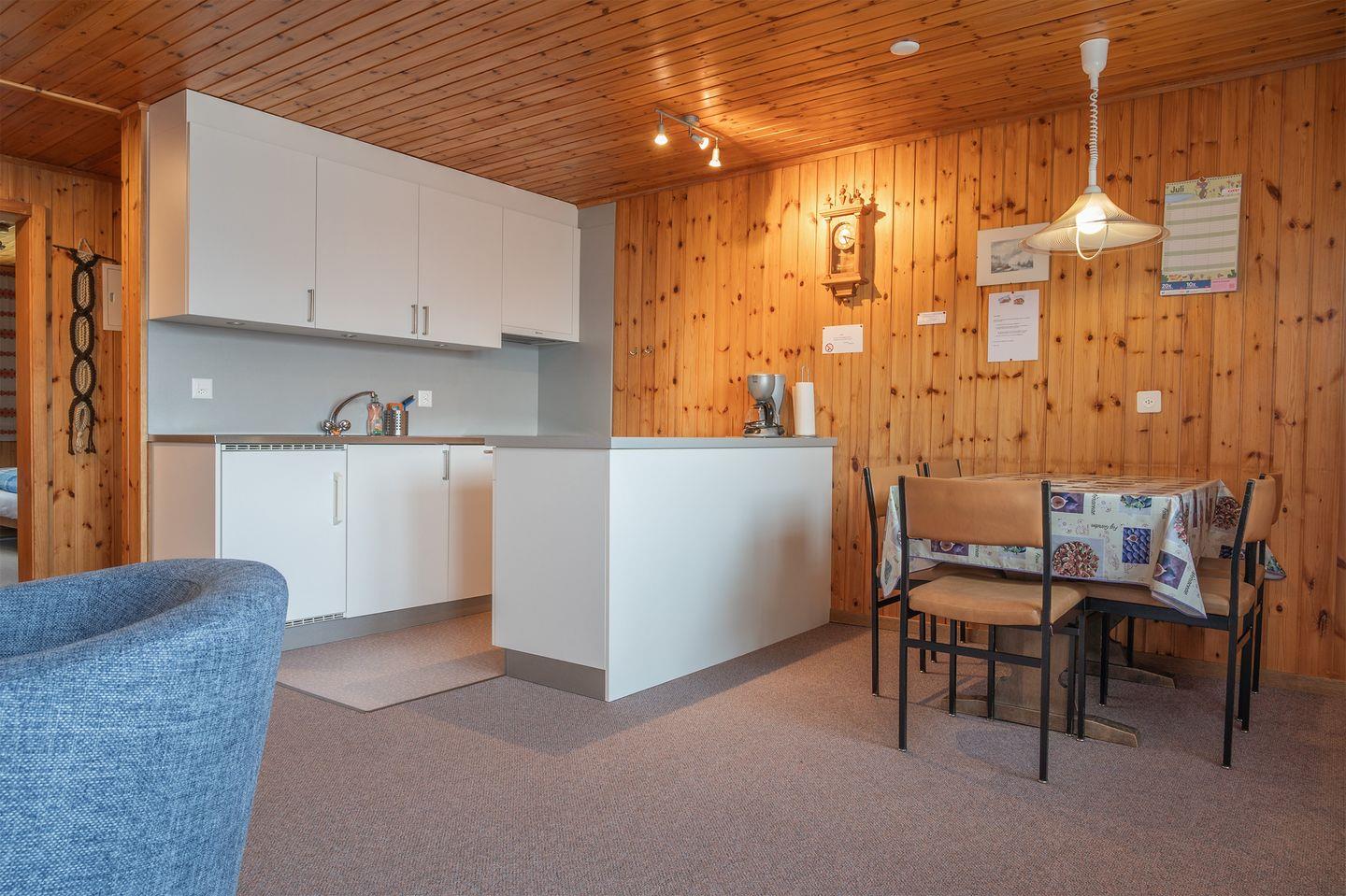 Wohn, Esszimmer mit offener Küche, 1 Doppelbettzimmer 1.60 x 2.00, ein Doppelbettzimmer mit 2 Einzelbetten, im Wohnzimmer 1 Auszugsofa / 1.40 breit geeignet für 1 Erwachsene oder 2 Kinder,1 Badezimmer mit Dusche, Lavabo und Toilette.