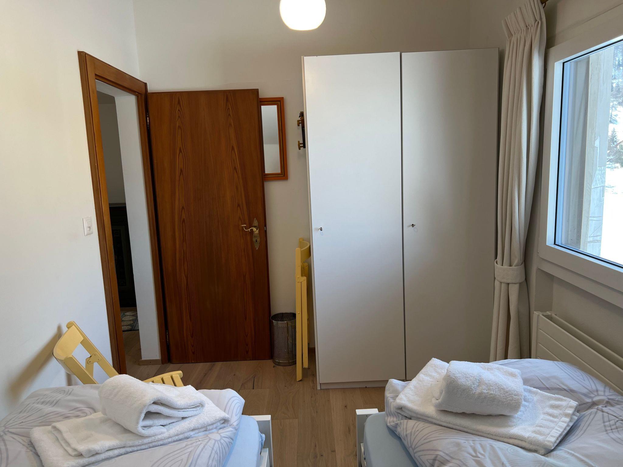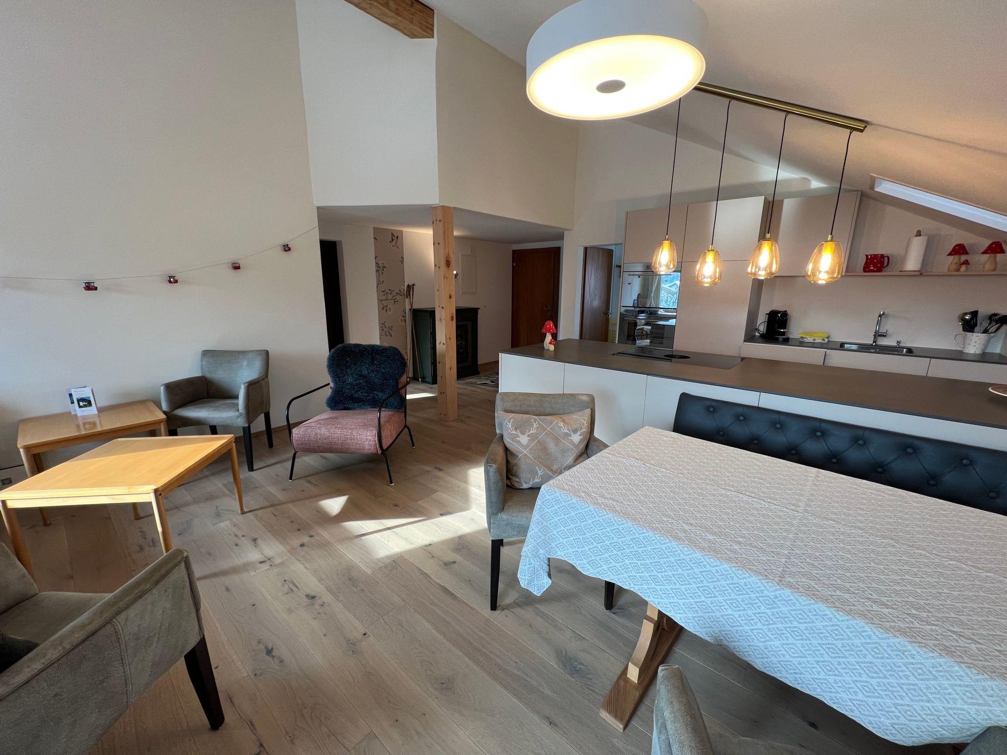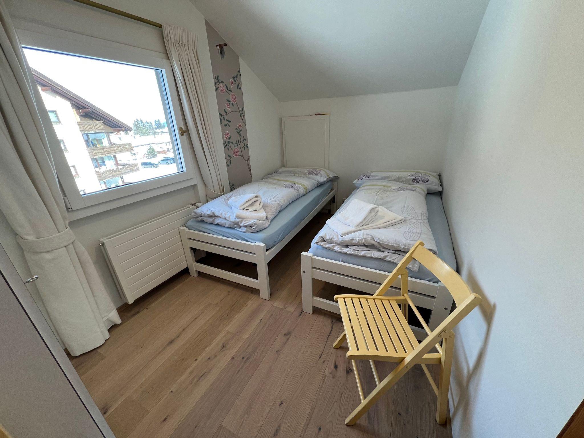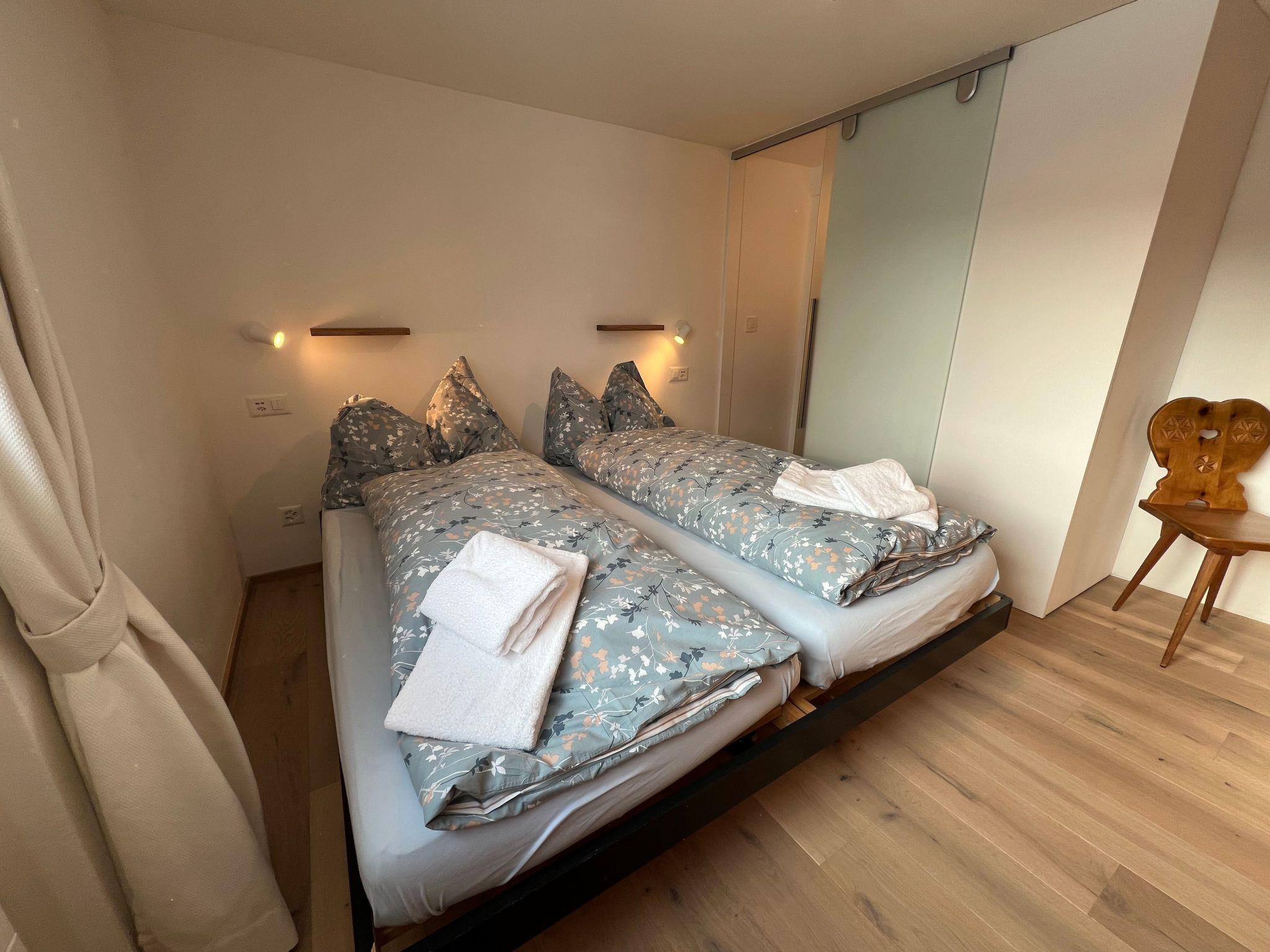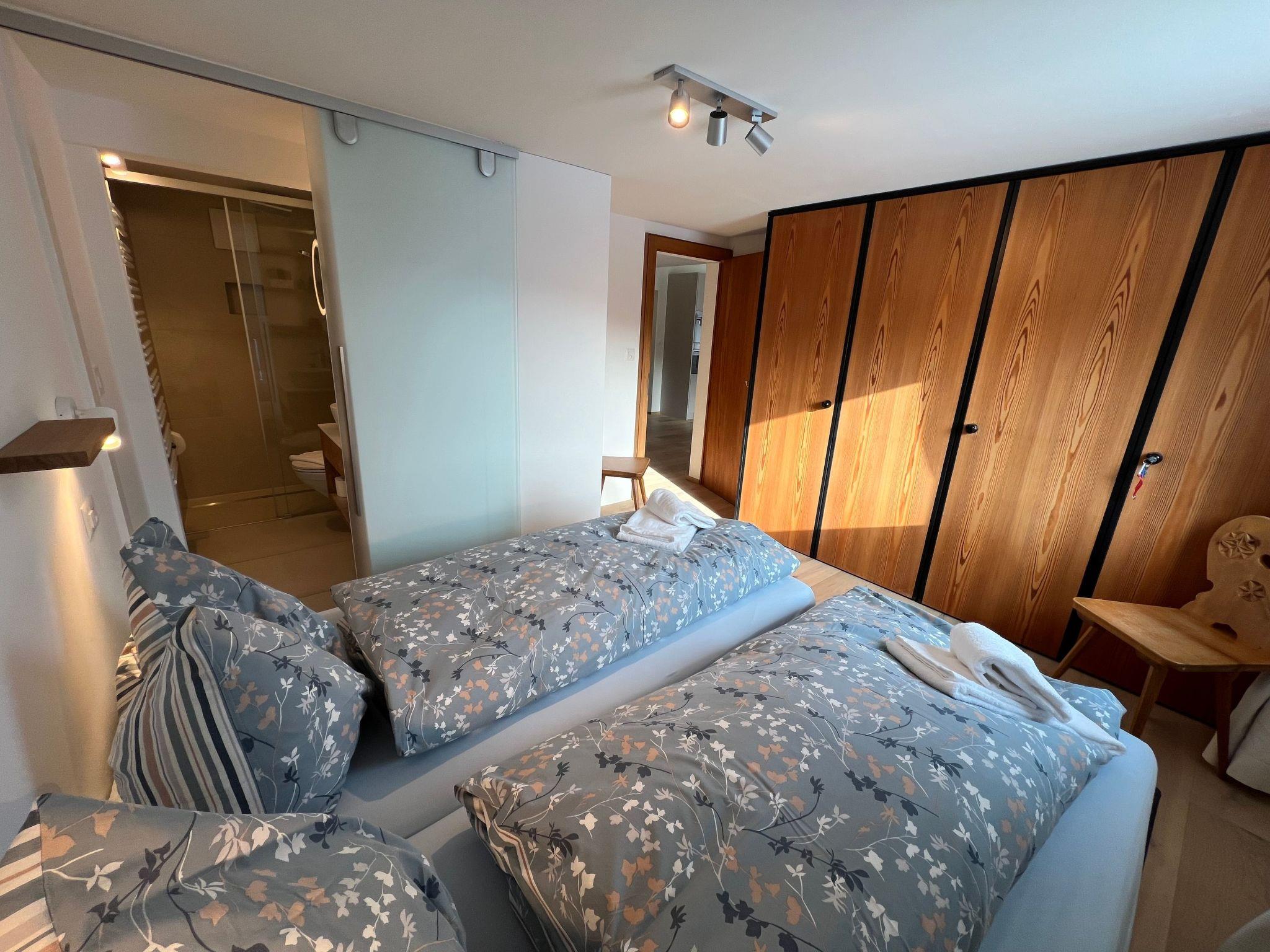 Innen bietet die Wohnung eine offene, voll ausgestattete Küche mit Backofen, Kühlschrank, Nespresso-Kaffeemaschine, Wasserkocher, Fondue- und Raclette-Set, Toaster, die für kulinarische Höhenflüge keine Wünsche offen lässt. Das gemütliche Wohnzimmer ist mit einem Sofa, einem Esstisch und TV ausgestattet, während die zwei Schlafzimmer jeweils zwei Einzelbetten beherbergen. Das Badezimmer verfügt über eine Toilette, Badewanne, Ablage für Frottéewäsche, ein Lavabo mit Spiegel und einen Haartrockner.