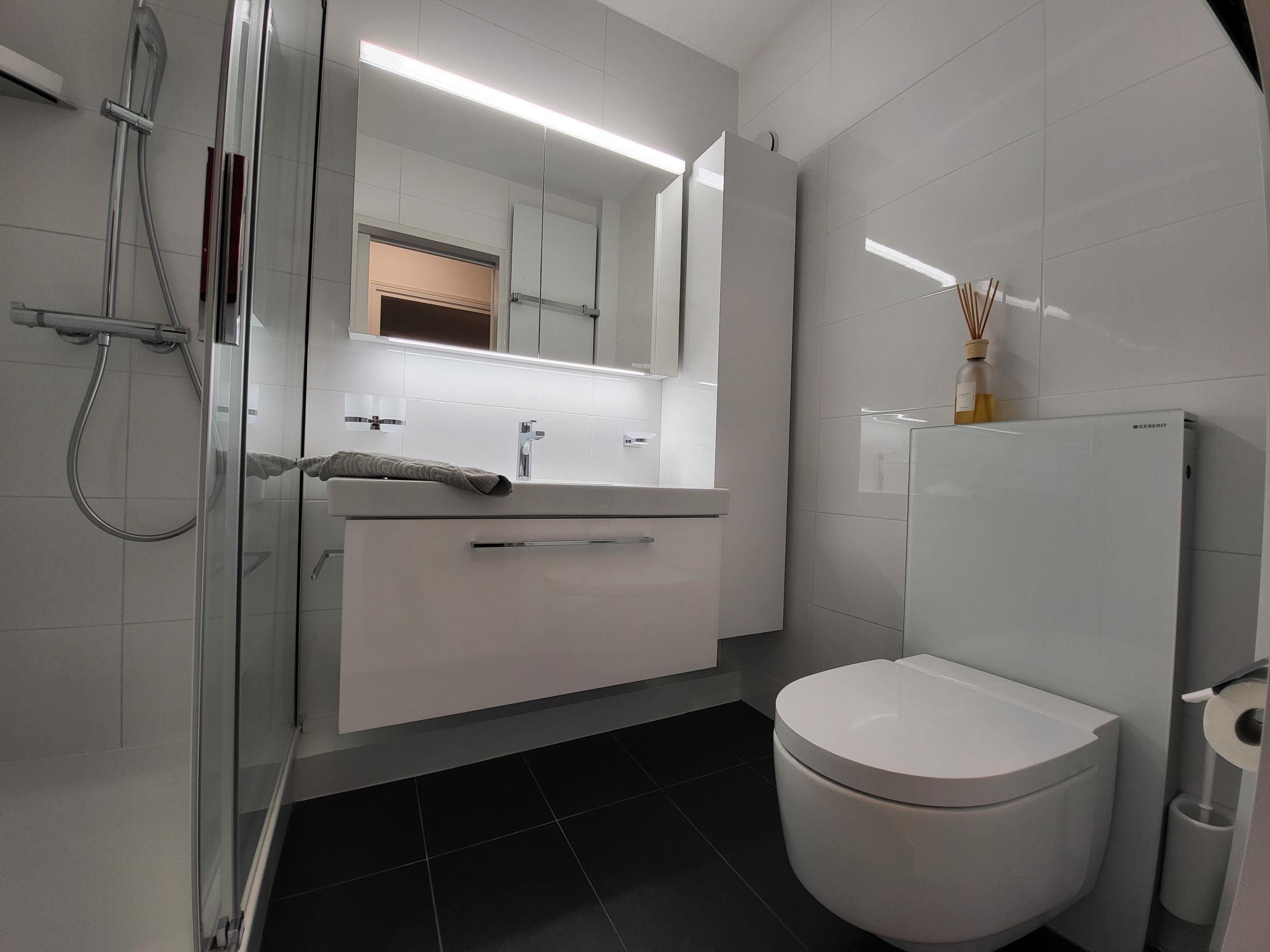 "App. 511", 2-Zimmer-Wohnung 50 m2 im 5. Stock, Nordostlage. Geräumig und hell, vollständig renoviert im Jahre 2021, modern und stilvoll eingerichtet: offenes Wohn-/Esszimmer mit Panoramafenster mit 1 Diwanbett (160 cm, Länge 200 cm), Kabel-TV (Flachbildschirm), Radio und Klimaanlage. Ausgang zum Balkon. 1 kleines Doppelzimmer, ohne Fenster mit 1 Doppelbett (160 cm, Länge 200 cm). Grosse, offene Küche (Backofen, Geschirrspüler, 4 Induktionskochplatten, Toaster, Tiefkühler, elektrische Kaffeemaschine, Kapseln für die Kaffeemaschine (Nespresso) extra, Dampfgarer) mit Esstisch. Dusche/WC, Doppelwaschbecken. Heizung, Klimaanlage. Grosser Balkon, Nordlage. Balkonmöbel. Herrliche Panoramasicht auf den See, die Berge und die Landschaft. Zur Verfügung: Waschmaschine (extra). Bügeleisen, Kinderhochstuhl, Babybett bis 2 Jahre (extra), Haartrockner. Internet (Wireless LAN, gratis). Parkplatz beim Haus. Bitte beachten: Nichtraucher-Unterkunft. Rauchmelder. Achtung: Fenster im Schlafzimmer geht in den Lüftungsschacht. NL-00004557