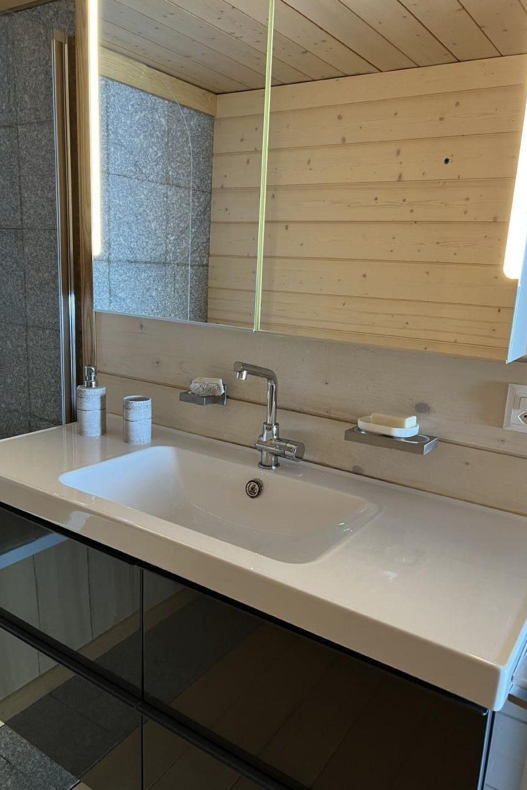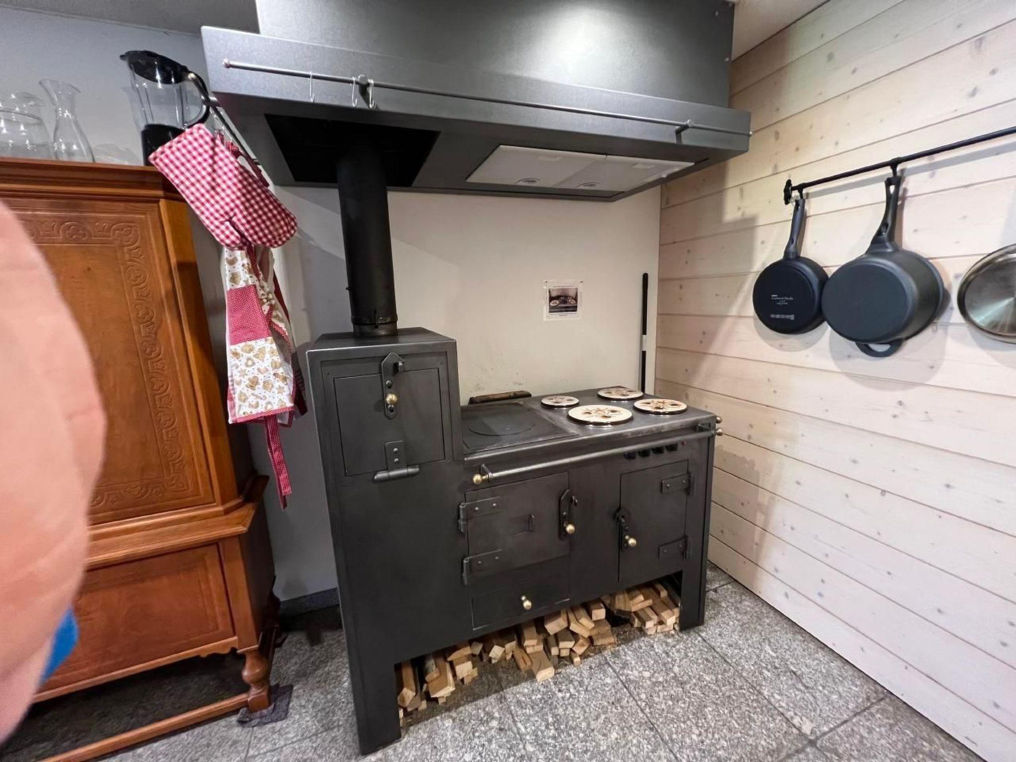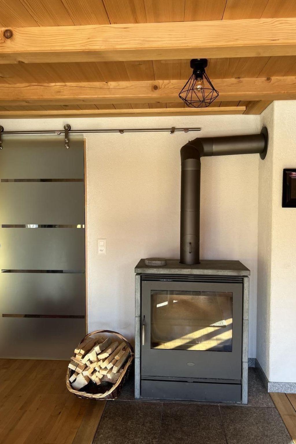 Das Innere der Wohnung ist eine perfekte Mischung aus Tradition und Moderne. Ein gemütlicher Schwedenofen in der Stube und ein nostalgischer Holzofen in der Küche spenden in den Wintermonaten Wärme und sorgen für ein heimeliges Ambiente. Für kulinarische Erlebnisse bietet die Küche neben dem Holzofen auch einen Elektroherd, einen modernen Backofen, eine Mikrowelle sowie eine Geschirrspülmaschine und eine Nespresso Kapselmaschine. Im Badezimmer lädt eine große Badewanne zur Entspannung ein, und das Ambiente erinnert dezent an eine Saunalandschaft.