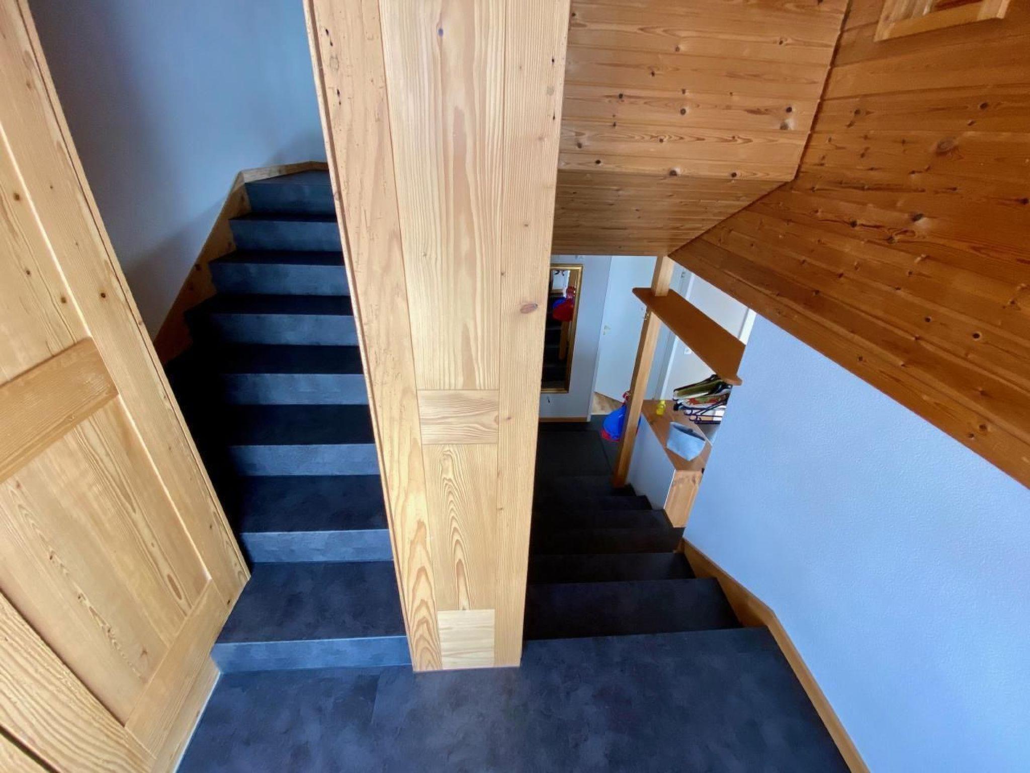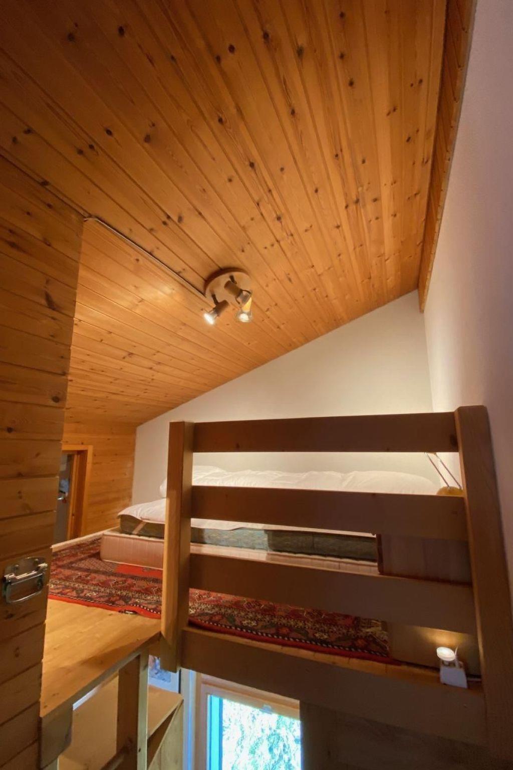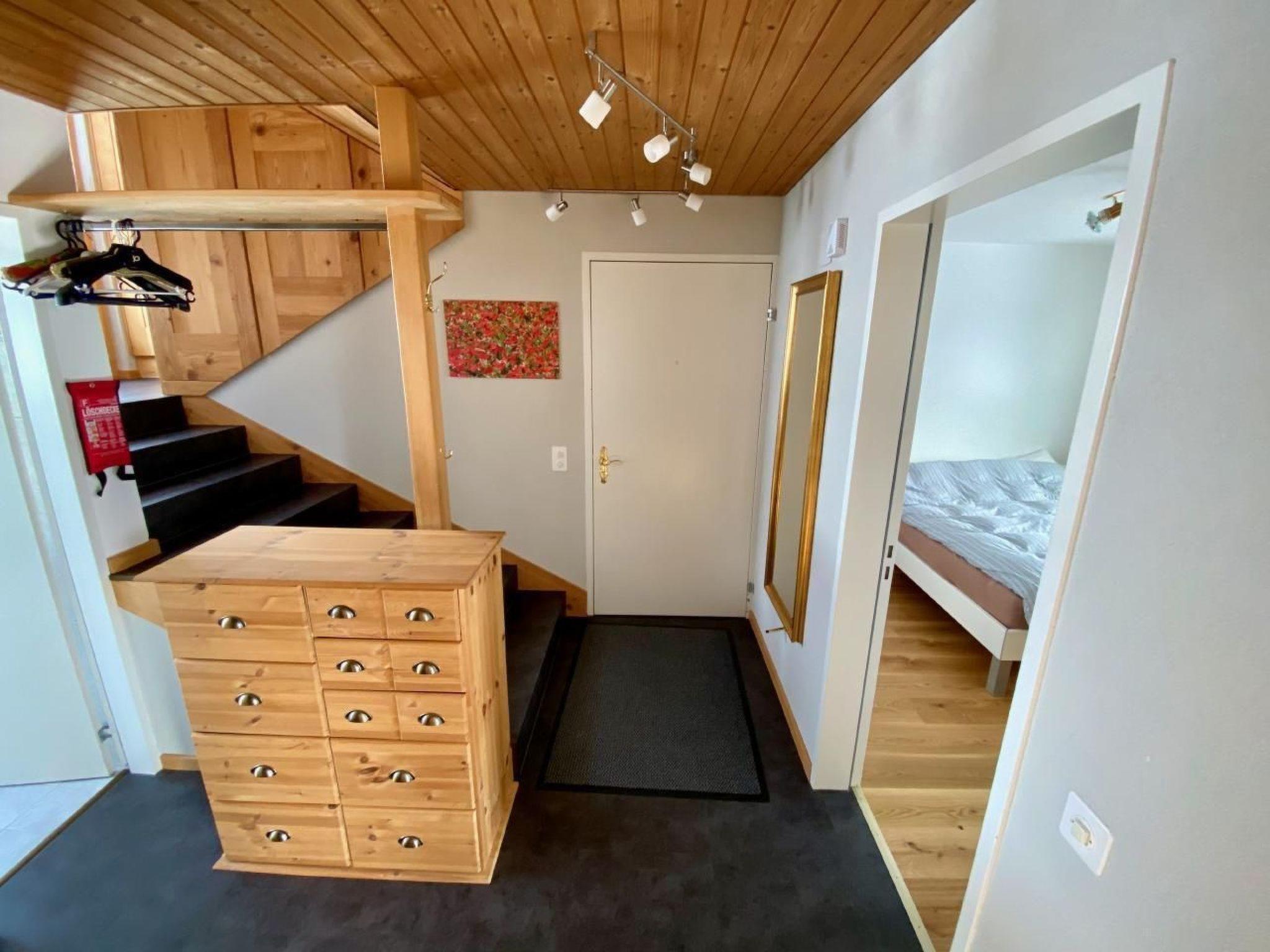 Die Wohnung ist über zwei Stockwerke verteilt. Im unteren Stock befindet sich der Eingang mit Garderobe, einer Nasszelle und zwei WCs. Ebenfalls im unteren Stock befindet sich ein geräumiges Zimmer mit komfortablen Doppelbett (160x200cm) und grossem Wandschrank.