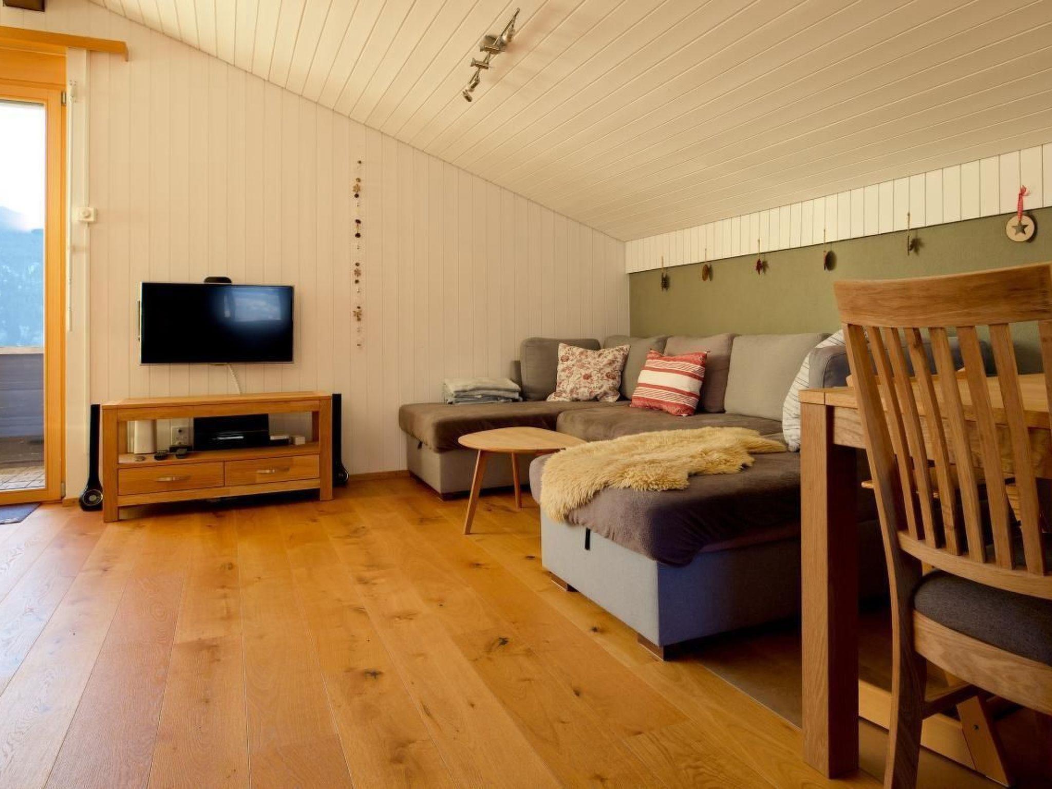 Vom Eingangsbereich gelangt man in das grosse Wohn- und Esszimmer mit offener Küche. Das Sofa im Wohnzimmer kann zu einem grossen Doppelbett (180x220 cm) ausgezogen werden. Die Wohnung besitzt viele Spielsachen, ein Tripp Trapp mit Schutz, ein Kindersitz und ein Babybett.
