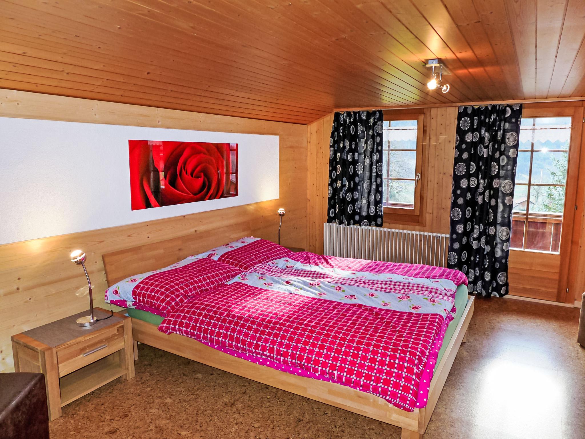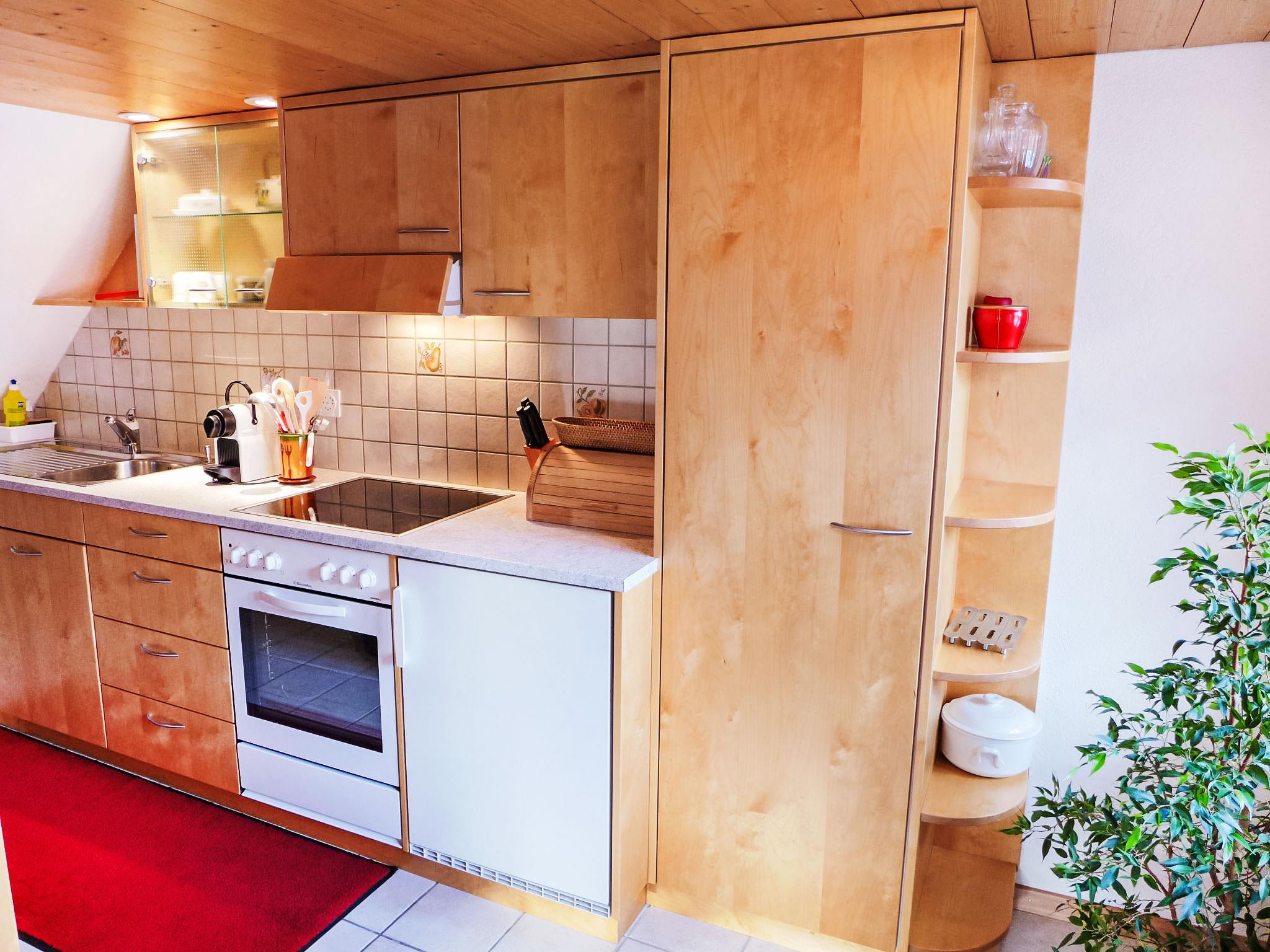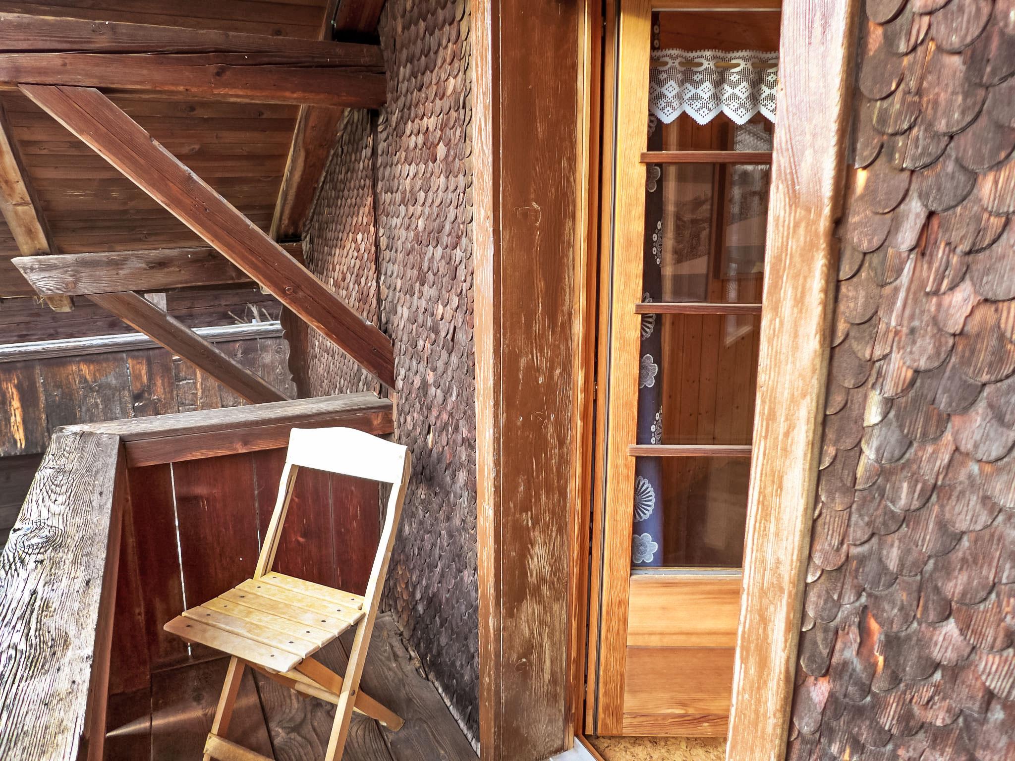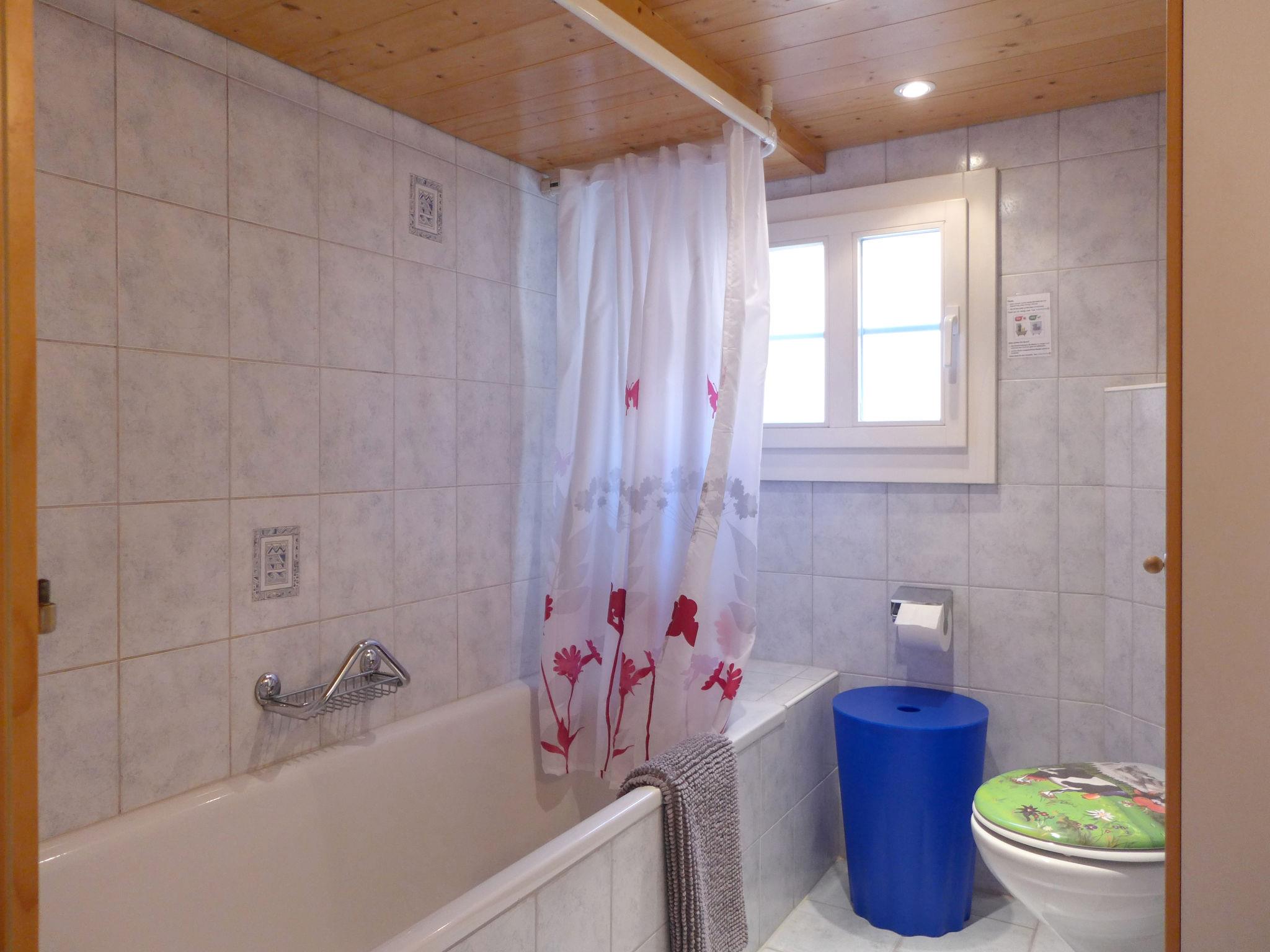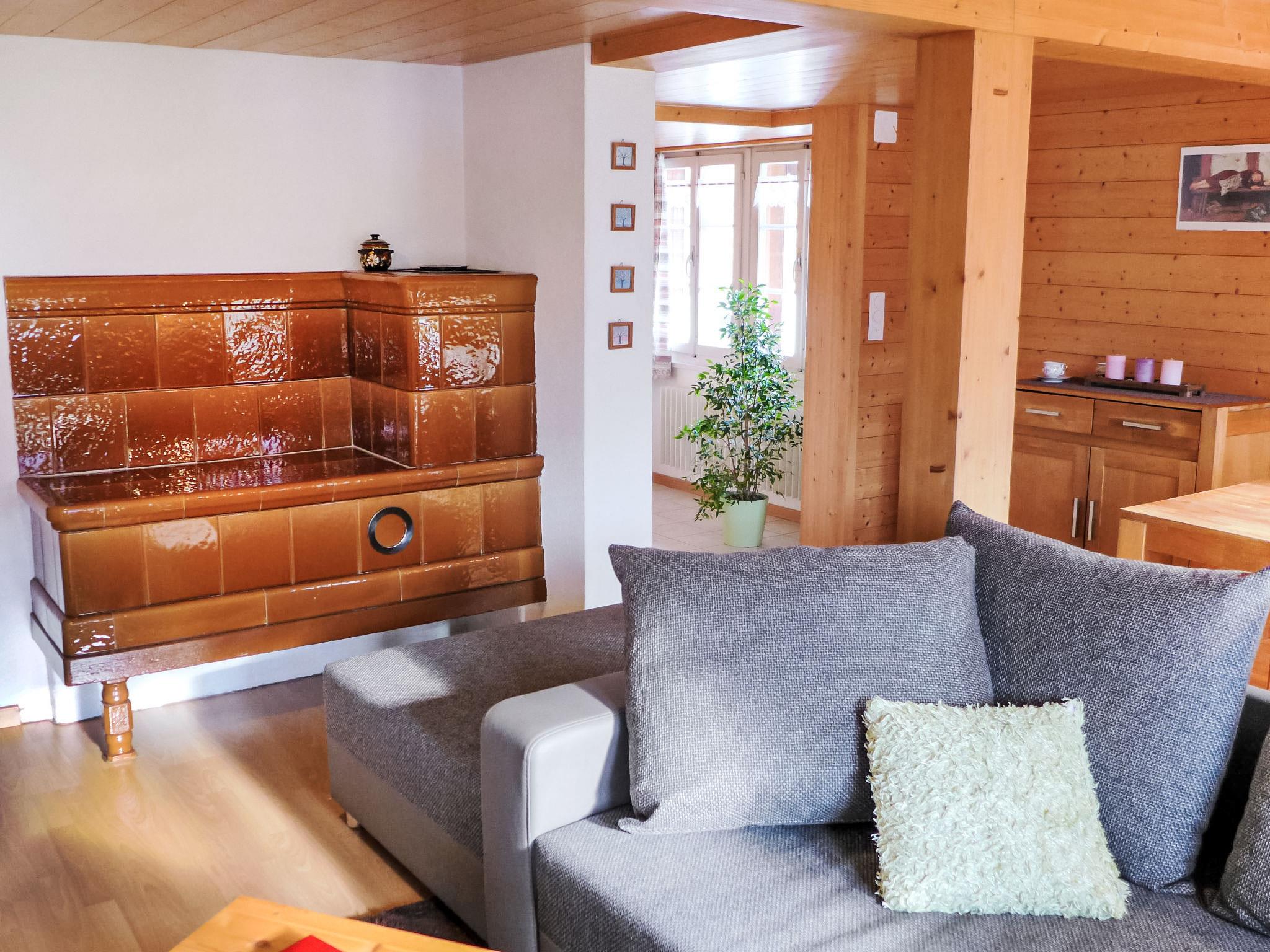 2-Zimmer-Chalet 50 m2 auf 2 Stockwerken, Südlage. Sehr gemütlich und mit viel Holz eingerichtet: offenes Wohn-/Schlafzimmer 17 m2, Deckenhöhe 190 cm mit 1 Doppeldiwanbett (140 cm), Essecke, Kabel-TV, Internationale TV-Sender, Radio, CD und DVD. Offene Küche 8 m2 (Backofen, Geschirrspüler, 4 Glaskeramikplatten, Toaster, Wasserkocher, elektrische Kaffeemaschine, Kapseln für die Kaffeemaschine (Nespresso) extra, Racletteofen, Fondue Set (Käse)). Bad/Dusche/WC. Obergeschoss: (steile Treppe) 1 Zimmer 12 m2, Deckenhöhe 190 cm mit 1 franz. Bett (160 cm, Länge 200 cm). Ausgang zum Balkon. Kleiner Balkon 5 m2, Südlage, kleine Terrasse. Terrassenmöbel, Gartengrill (mobil), Liegestühle (2), Abstellkammer. Herrliche Sicht auf die Berge und die Ortschaft. Zur Verfügung: Kinderhochstuhl, Babybett bis 2 Jahre, Haartrockner. Internet (WLAN, gratis). Parkplatz beim Haus. Bitte beachten: Nichtraucher-Unterkunft. Schöner alter Kachelofen im Wohnzimmer.
