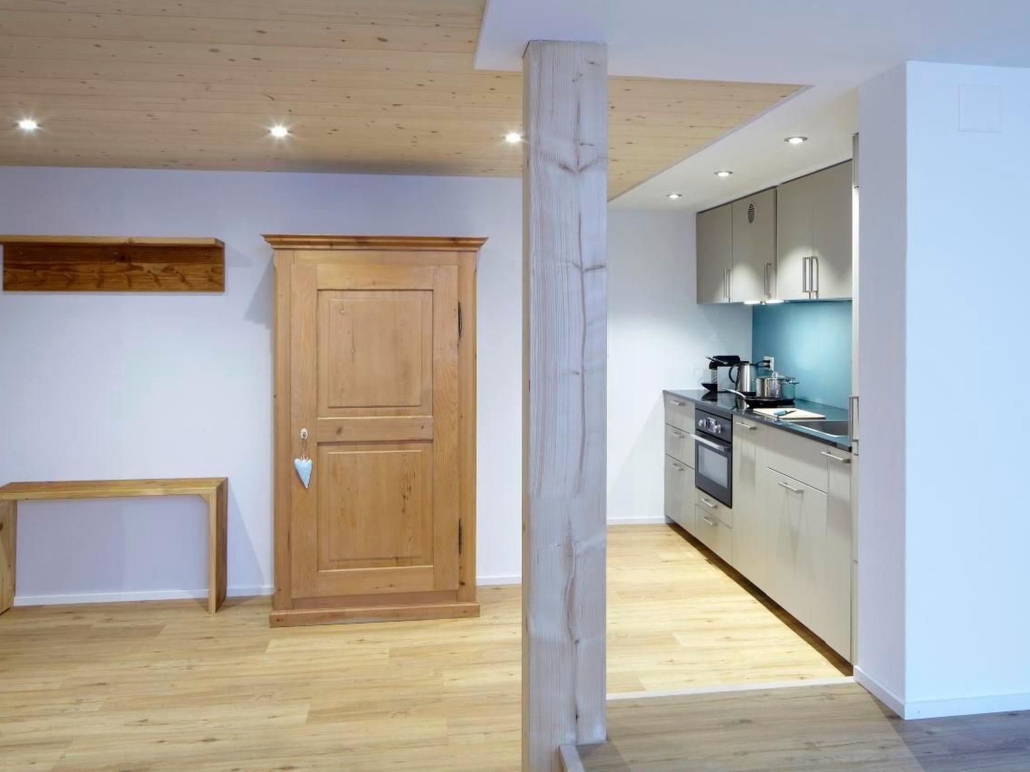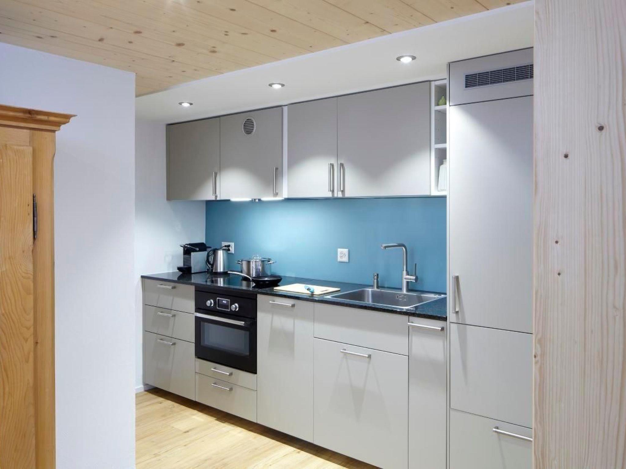 Die Küche ist ausgestattet mit einem modernen Heissluft/Mikrowellenofen, einem 4-er Induktionsherd, einem grossen Kühlschrank mit Gefrierfach sowie einem Geschirrspüler. Pfannen, Töpfe, ausreichend Geschirr sowie eine Nespresso-Kaffeemaschine inkl. Kaffeekapseln stehen zur Verfügung, ebenso Gewürze, Öl, Pasta und das Notwendigste zum Kochen. Racletteofen und Käse-Fondue-Caquelon stehen ebenfalls zum Benützen bereit.