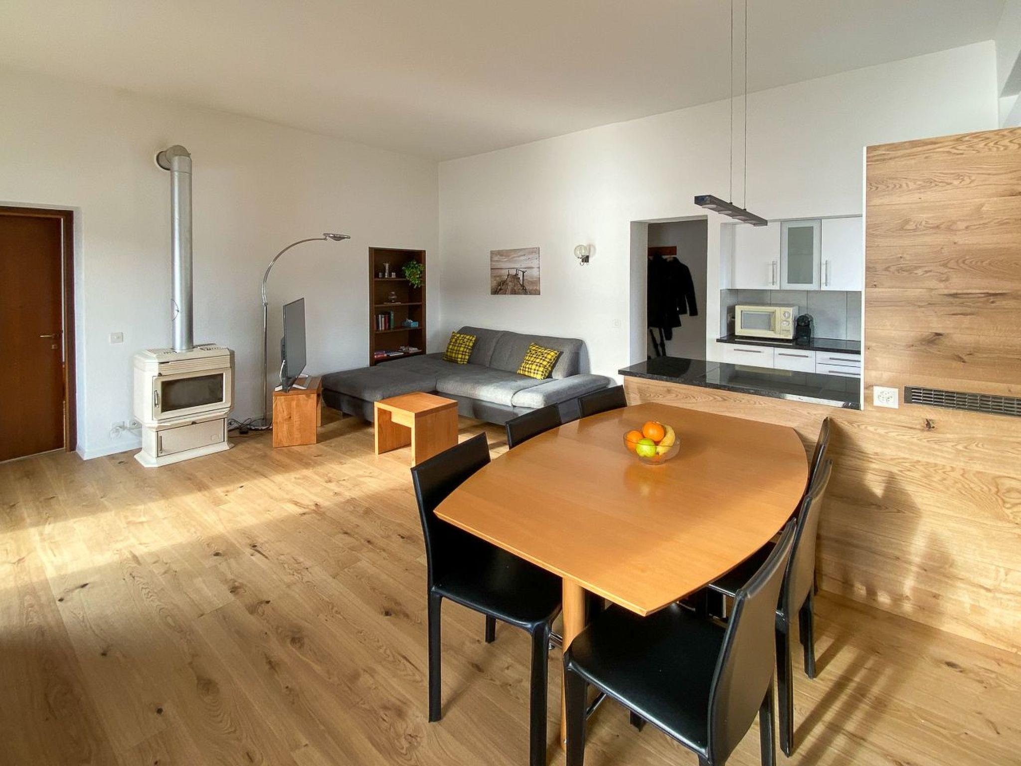 Die grosszügige Dreizimmerwohnung liegt im zweiten Stock und ist über Treppe oder Lift erreichbar. Ein geräumiges Wohnzimmer mit offener Küche sowie zwei separate Schlafzimmer bieten Platz für vier Personen.