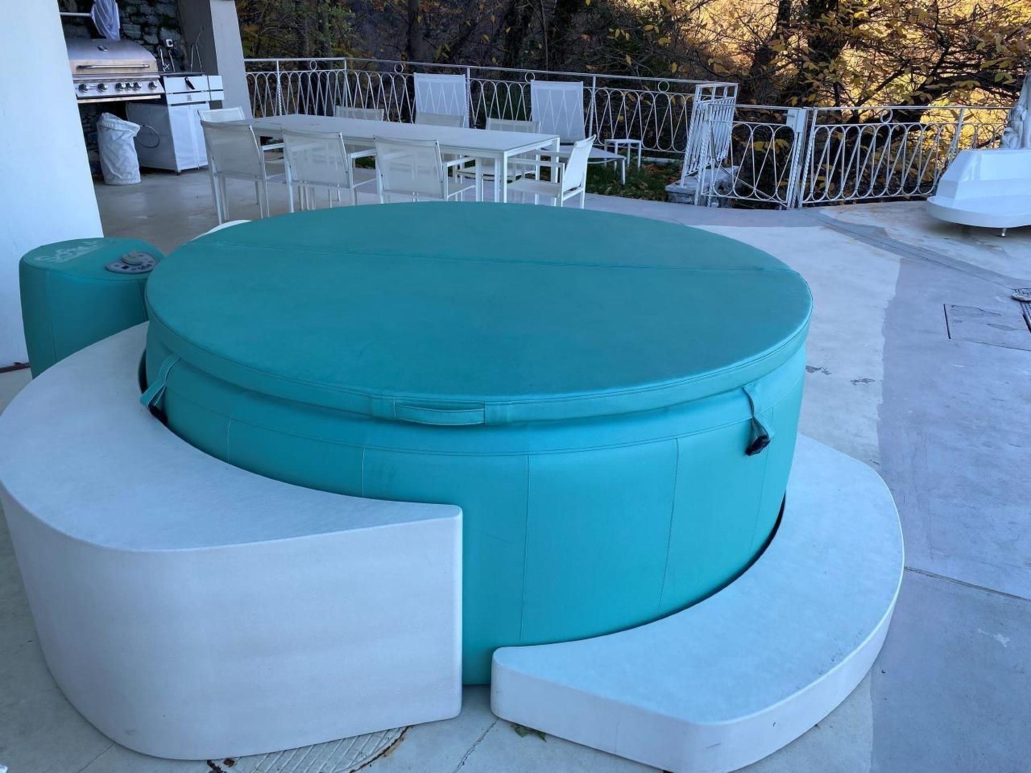 Der Außenbereich steckt voller Lebensfreude mit einem großen Pool von 5 x 10 m mit Whirlpool und Dampfdusche, umgeben von einem Garten mit Palmen und vielen mediterranen Pflanzen. Eine große Außenküche mit Plancha, Gasgrill, Wasseranschluss und BBQ Smoker lädt zu geselligen Abenden ein. Verschiedene Sitzgelegenheiten wie der Garten-Esstisch für 8 Personen, eine Apero- / Frühstücksbar für 6 Personen und luxuriöse Rausch Außensofas am Pool offerieren Komfort im Freien. Die automatische Rasen- & Blumensprinkleranlage sowie ein Roboter für die Schwimmbadreinigung halten den Außenbereich makellos.