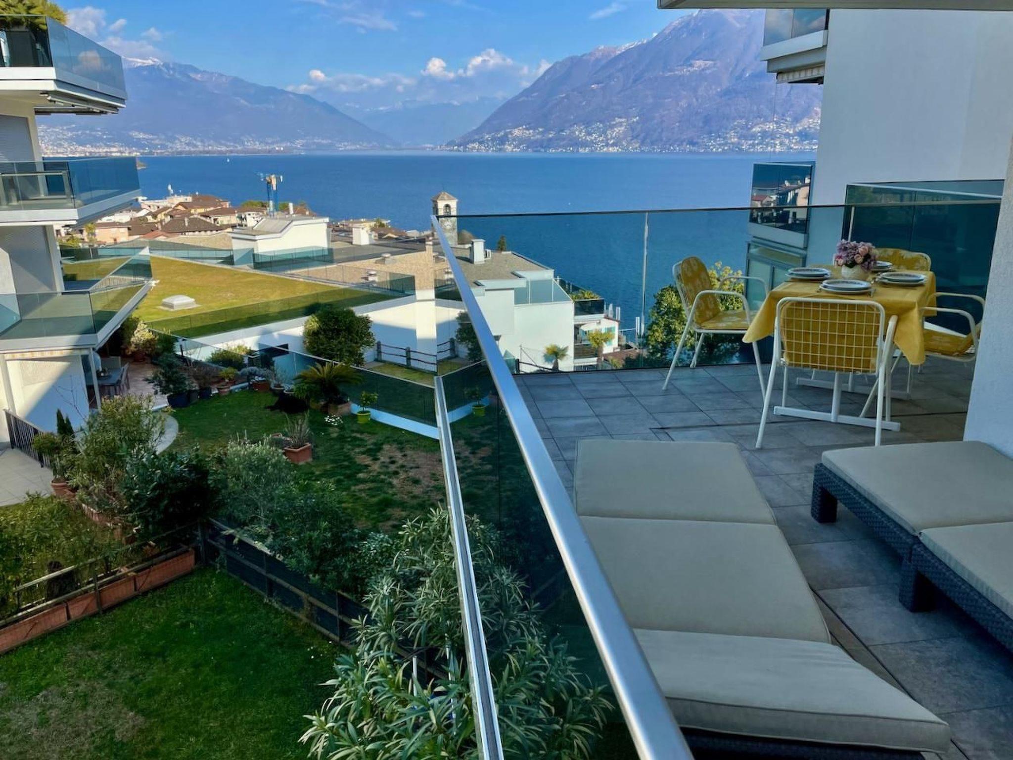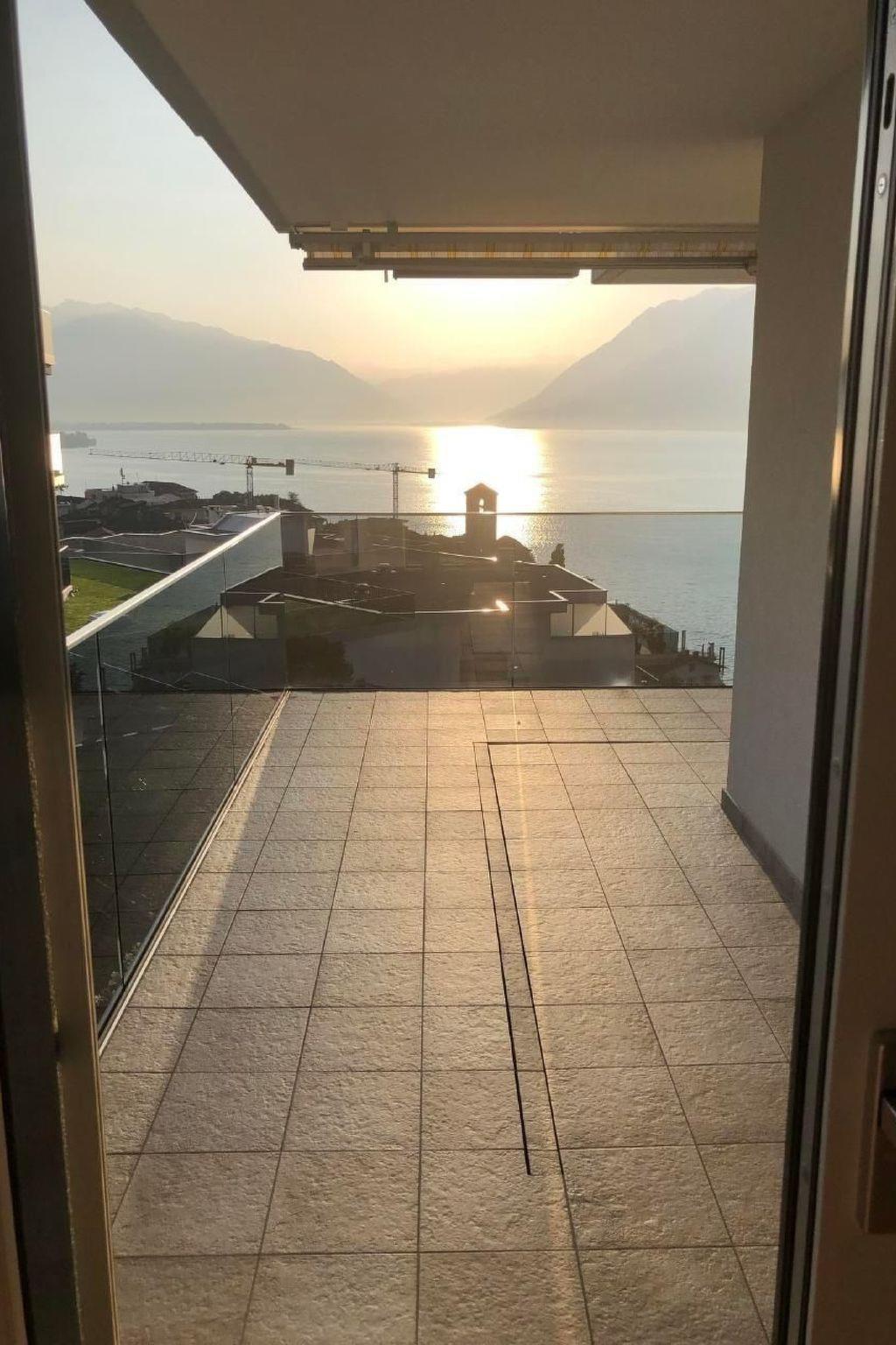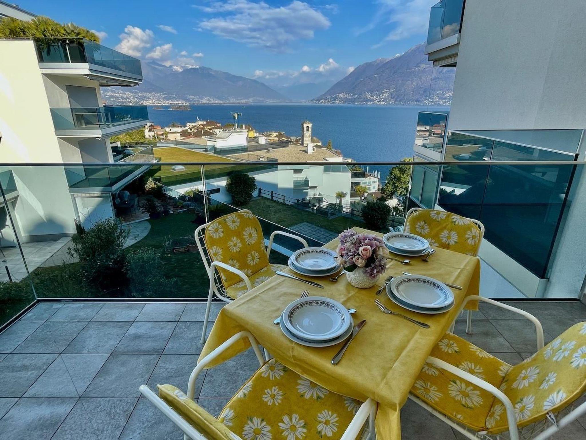 Direkt vom Wohnzimmer gelangt man auf den grossen Balkon, welcher eine spektakuläre Panorama-Aussicht auf Brissago, die Isola di Brissago sowie den Lago Maggiore bietet. Die Blickrichtung ist Nord-Ost, d.h. die Sonne bescheint den Balkon von frühmorgens bis am späten Nachmittag. Ein Vorteil, speziell im Hochsommer, weil man am Abend bei lauen Temperaturen bis spätabends sitzen bleiben kann und die Hitze erträglicher ist. Geniessen Sie die Aussicht und die Abendlichter von Brissago, Ascona, Locarno. Zwei Sonnenliegen laden zum gemütlichen Verweilen ein. Ein Gartentisch mit vier Plätzen steht zur Verfügung.