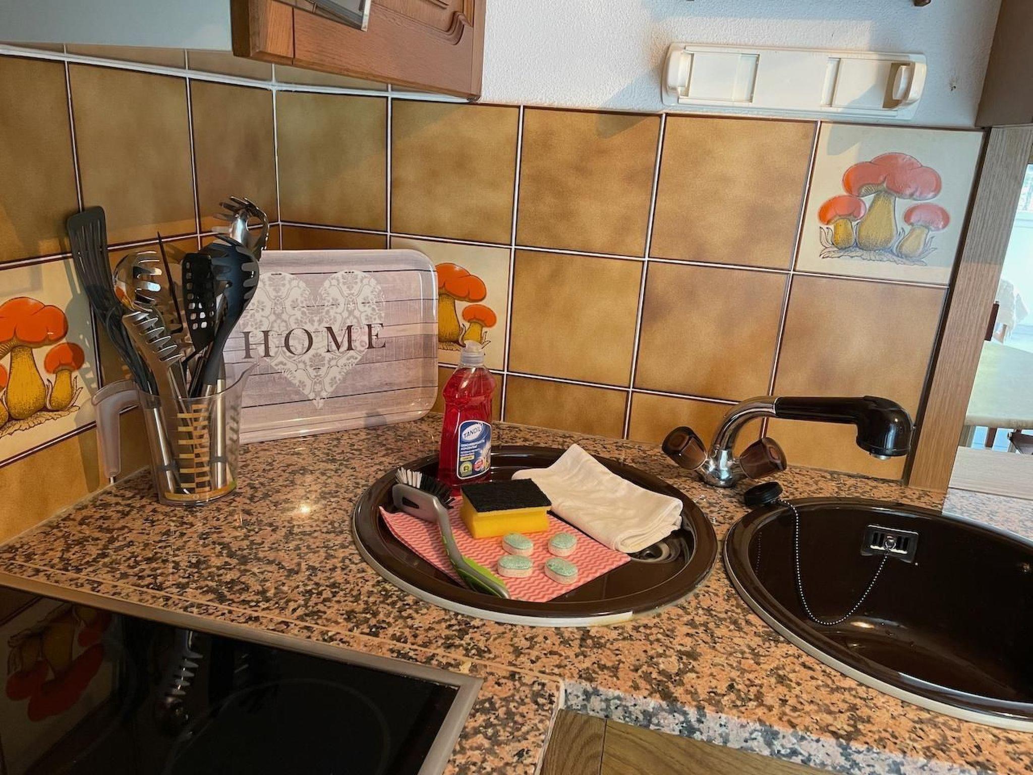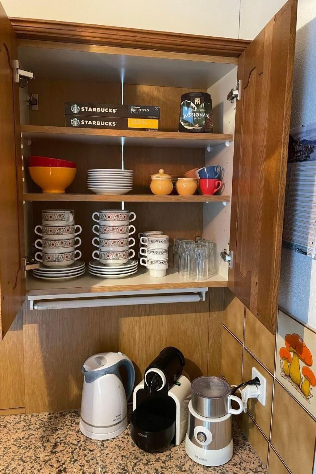 Die volleingerichtete Küche (Geschirr, Besteck, Pfannen, Geschirrspüler, Backofen, 3 Herdplatten etc.) bietet zusätzlich eine Nespresso Kaffeemaschine (Kapseln), einen Milchschäumer, einen Teekocher sowie einen Toaster.