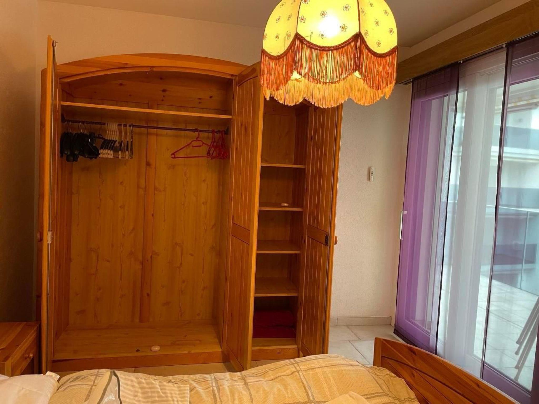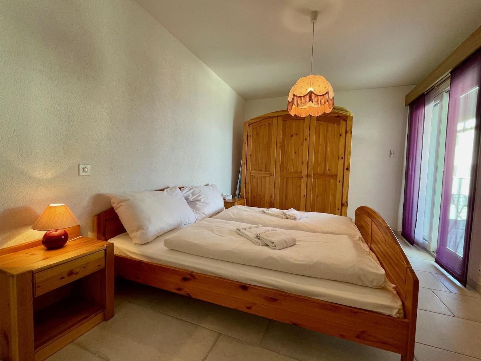 Das gemütlich eingerichtete Schlafzimmer bietet zwei Personen im 1.80m breiten Bett (2 Matratzen) Platz und genügend Stauraum im mittelgrossen Kleiderschrank für längere Aufenthalte. Der Balkon ist ebenso direkt über das Schlafzimmer erreichbar.