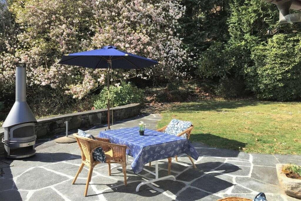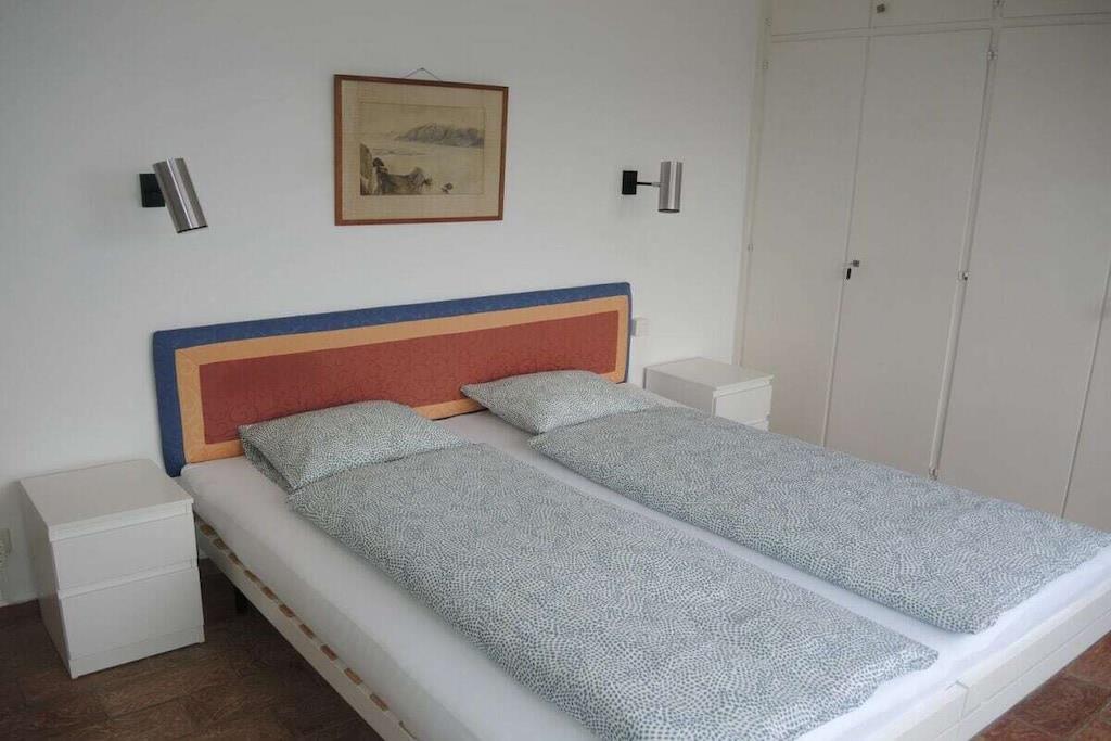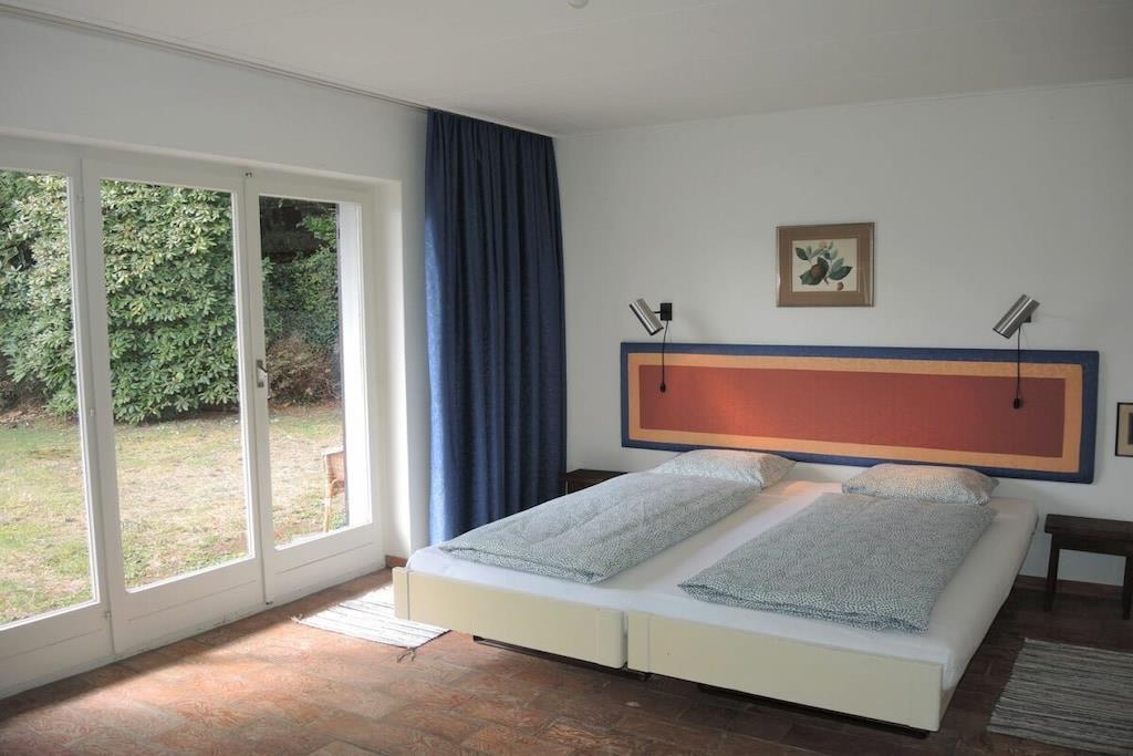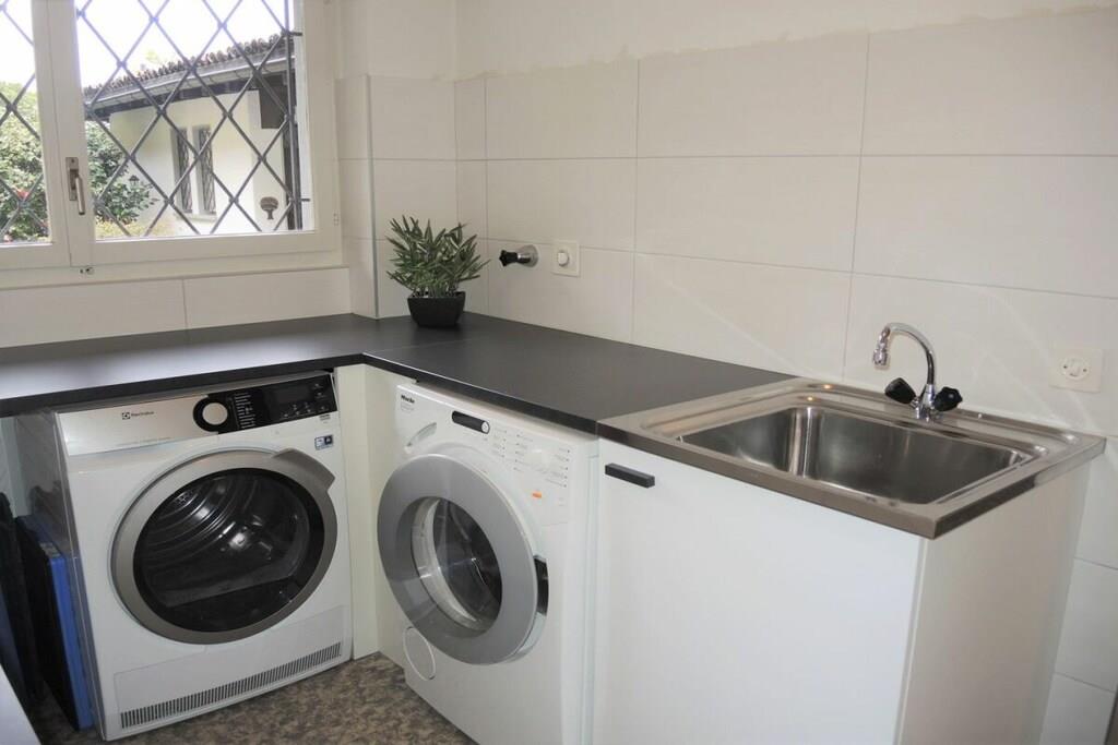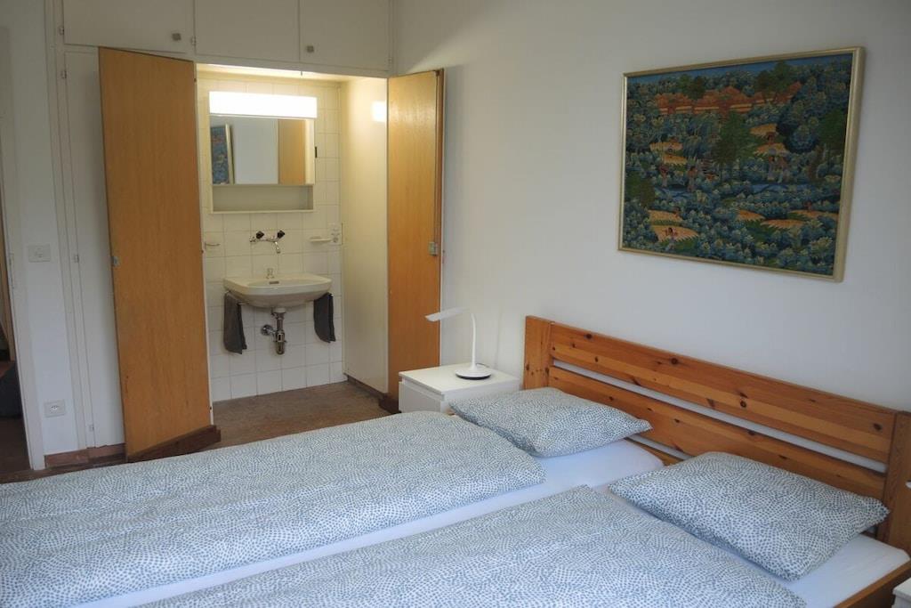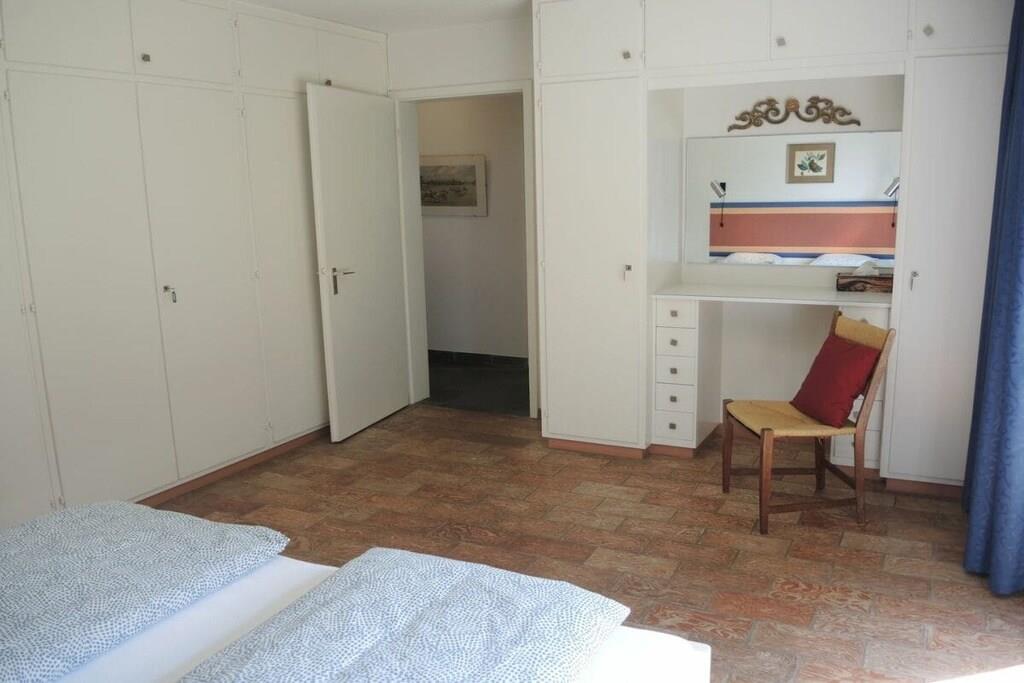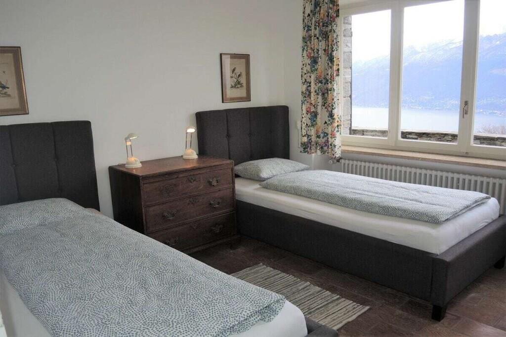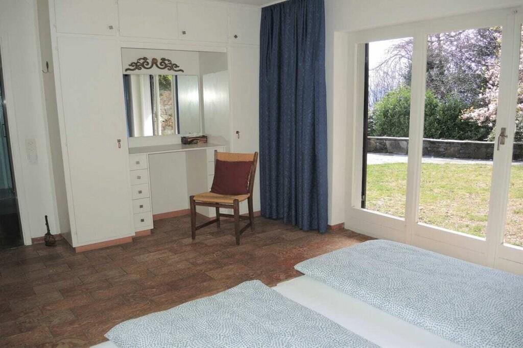 • 7 Zimmer Ferienhaus, alleinstehend, auf 2 Etagen • Wohnfläche ca. 210 m2 • Grundstück ca. 2500 m2 • 8 Personen • Ruhige, sonnige Hanglage (ca. 600 m Seehöhe) • Panoramasicht auf den See • geschmackvolle Innenausstattung . Obere Etage (Eingangsbereich) • Grosszügiges Entrée mit Einbauschränken und Gäste-WC • Geräumiges Wohn- , Esszimmer mit offenem Kamin • Esstisch und Stühle • Gemütliche Sofas und Sessel, Salontische • Flachbildschirm TV, WLAN • Ausgang zur Terrasse und Garten (Natursteintreppe zur unteren Gartenebene (Pool) • Überdachter Sitzplatz mit Esstisch und Korbstühlen, Gartenstühle, Sonnenschirm • Beweglicher Holzkohle-Grill • Lesezimmer (Büro) mit Schreibtisch, Bibliothek, Sofa • 1 Doppelschlafzimmer (2 Matratzen) mit Ausgang zum Garten, • grosse Einbauschränke, Schreib-, Schminktisch mit Spiegel und Stuhl • Badezimmer mit Dusche, Badewanne, WC, Haarfön • Grosszügige, komplett eingerichtete separate Küche • Wirtschaftsraum (Waschmaschine, Tumbler) • Ceranfeld Kochherd, Backofen, Geschirrspüler, Mikrowelle • Grosser, freistehender Kühlschrank mit Tiefkühler • Espressomaschine, Nespresso (bitte Kapseln mitbringen) • Filterkaffeemaschine, Wasserkocher, Toaster . Untere Etage (Schlafbereich) • 1 Schlafzimmer mit zwei Einzelbetten 90 cm, Kommode, Einbauschrank • 1 Schlafzimmer mit Doppelbett, 2 Matratzen à 90 cm, Einbauschrank, Schreibtisch • 1 Doppelschlafzimmer, 2 Matratzen à 80 cm, Einbauschrank • Jedes Schlafzimmer hat ein eigenes Lavabo mit Spiegel (im Schrank integriert) • 1 Badezimmer mit Dusche / WC, Haarfön • 1 separate Gästetoilette • Ausgang zum unteren Garten- und Schwimmbadbereich • Überdachter Aussenplatz mit Tischtennis-Tisch • Aussenpool zur alleinigen Benützung (ca. Mai bis September in Betrieb) • Poolgrösse ca. 22m2, Tiefe ca. 1.5 m . • Elektrische Rolläden im Wohnzimmer, Fensterläden in den Zimmern • 2 - 3 Parkplätze vor dem Haus • Für Kleinkinder nicht geeignet – niedrige Terrassenmauern! • Haustiere erlaubt • Nichtraucher, bitte nur im Aussenbereich rauchen • Zentralheizung • Kaution: CHF 800.00