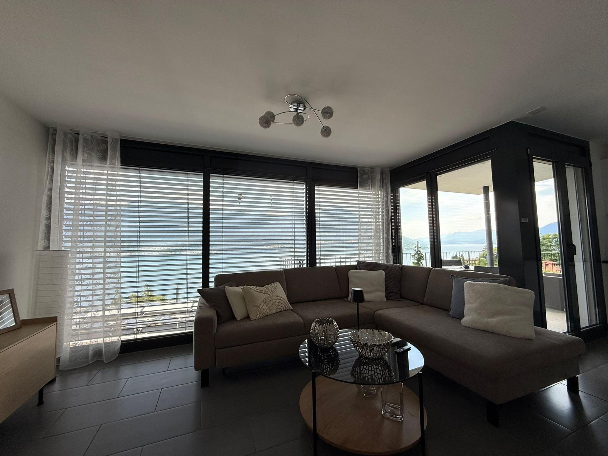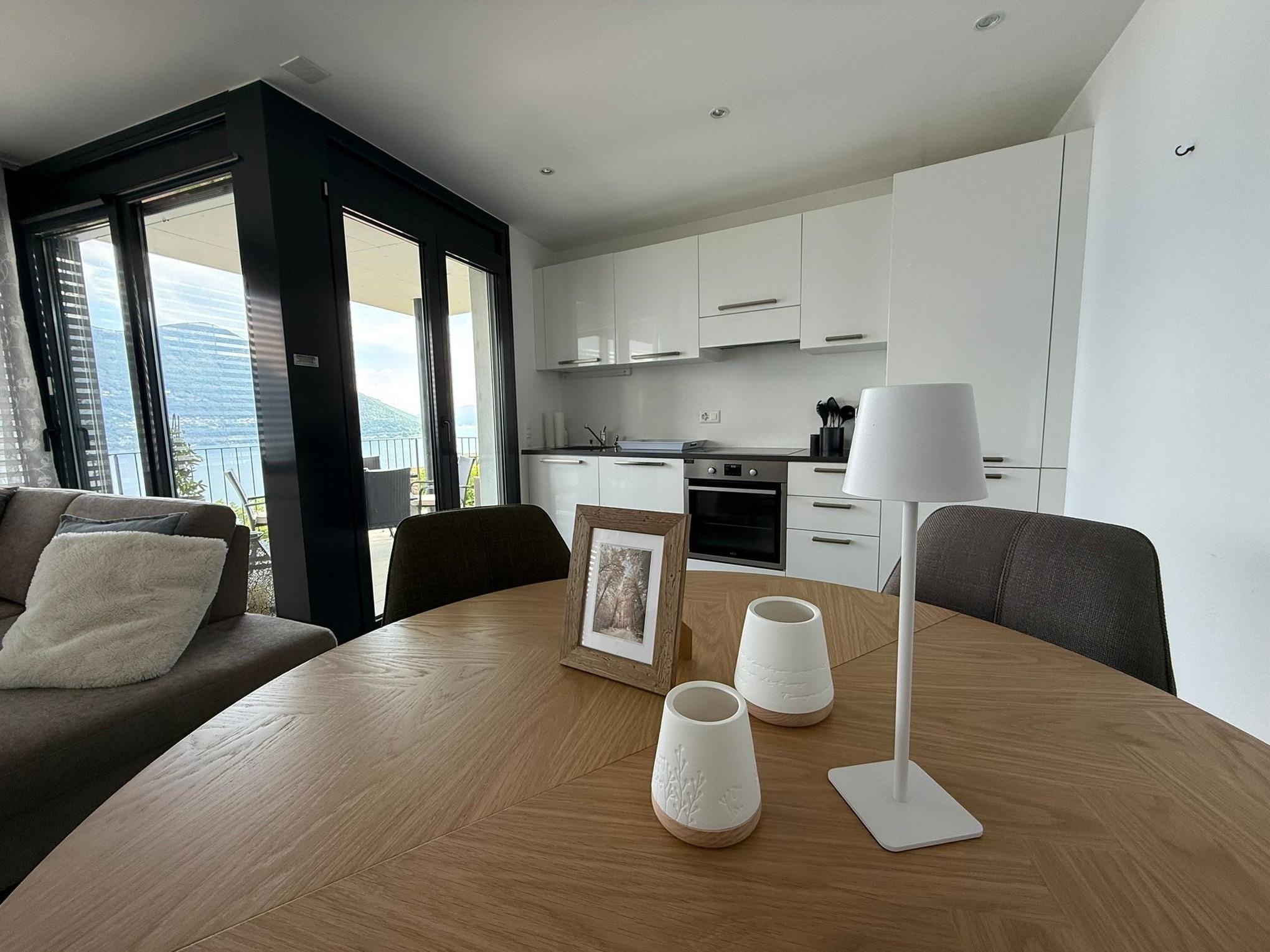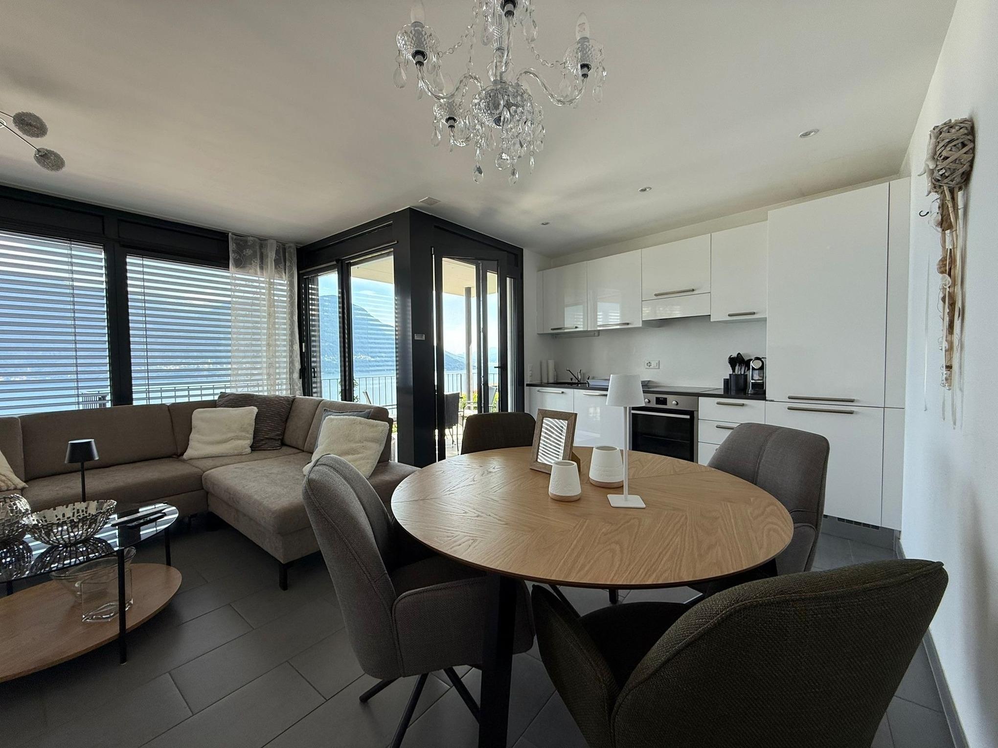 Egal, wo Sie sich in diesem elegant in Beige und Schwarz gestalteten Appartement befinden - ob Sie in der offenen Küche das Essen zubereiten, am Esstisch ein Glas Tessiner Wein genießen, den Abend in der anschließenden Sofaecke ausklingen lassen oder sich in eines der beiden Schlafzimmer zurückziehen - Sie haben immer einen atemberaubenden Blick auf den See und das gegenüberliegende Bergpanorama. Große bodentiefe Fenster gewähren Ihnen einmalige Ausblicke - aus jeder Perspektive. Und was gibt es Schöneres, als am nächsten Morgen auf der lichtdurchfluteten Terrasse in bequemen Rattan-Stühlen den Tag zu begrüßen.