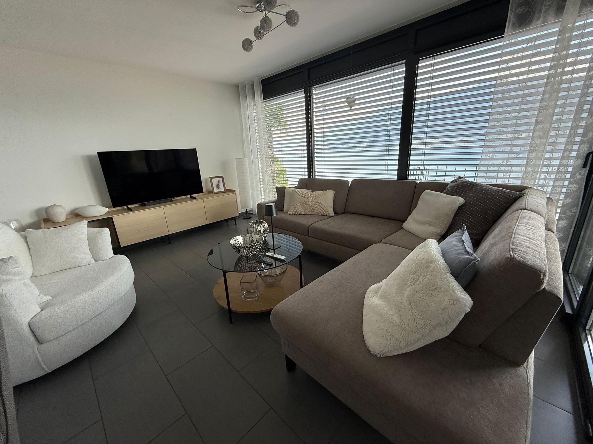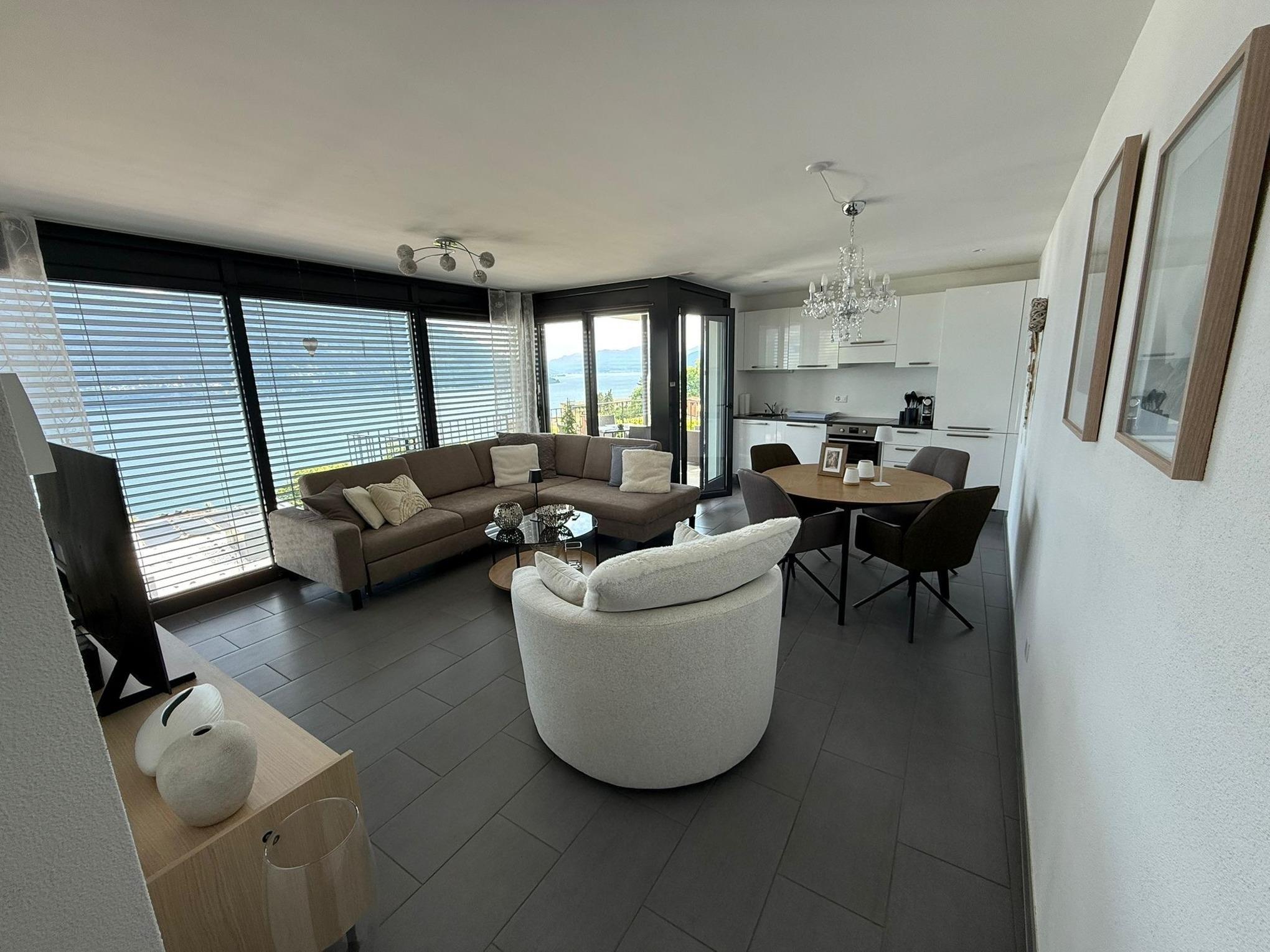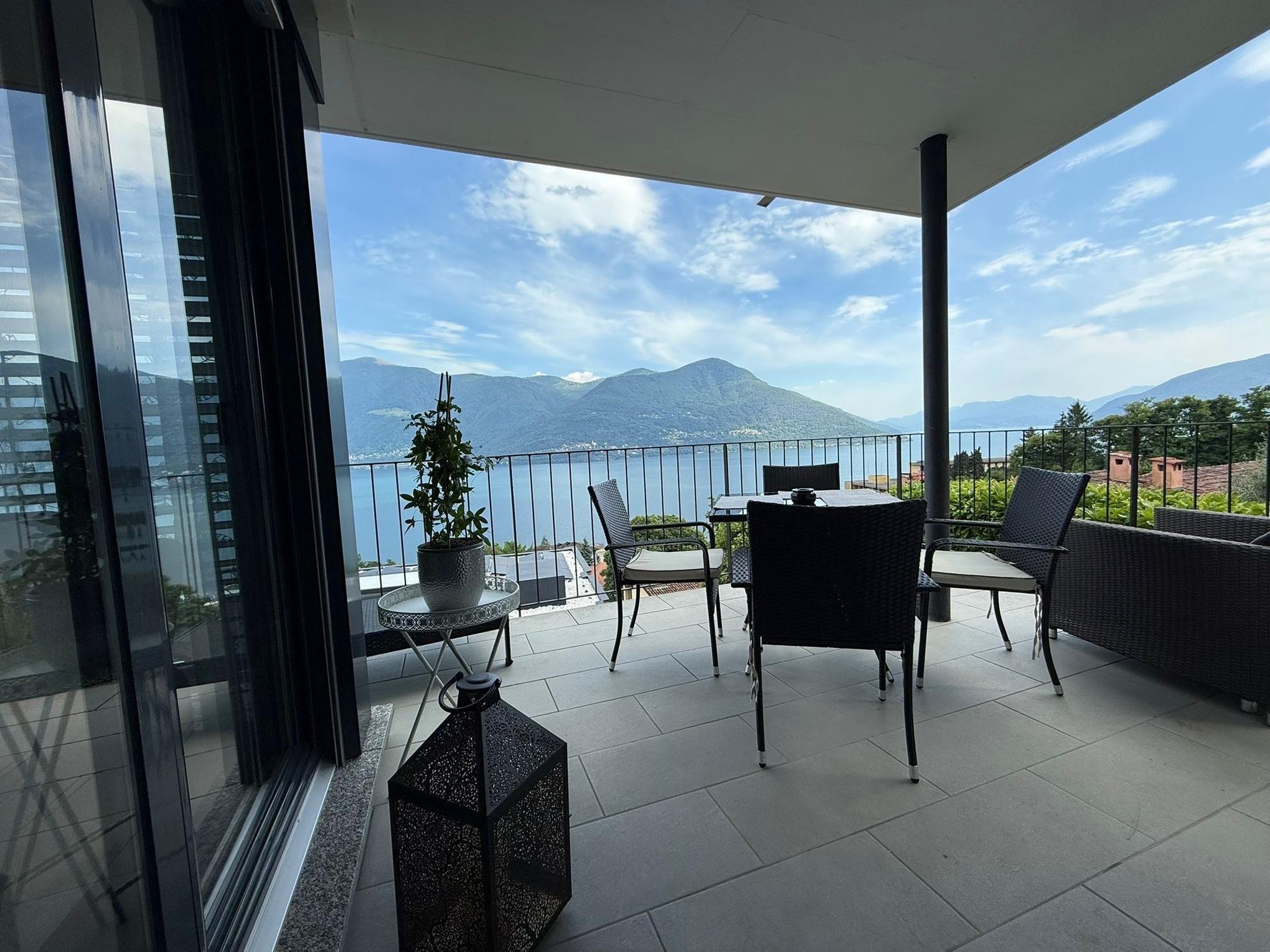 Egal, wo Sie sich in diesem elegant in Beige und Schwarz gestalteten Appartement befinden - ob Sie in der offenen Küche das Essen zubereiten, am Esstisch ein Glas Tessiner Wein genießen, den Abend in der anschließenden Sofaecke ausklingen lassen oder sich in eines der beiden Schlafzimmer zurückziehen - Sie haben immer einen atemberaubenden Blick auf den See und das gegenüberliegende Bergpanorama. Große bodentiefe Fenster gewähren Ihnen einmalige Ausblicke - aus jeder Perspektive. Und was gibt es Schöneres, als am nächsten Morgen auf der lichtdurchfluteten Terrasse in bequemen Rattan-Stühlen den Tag zu begrüßen.