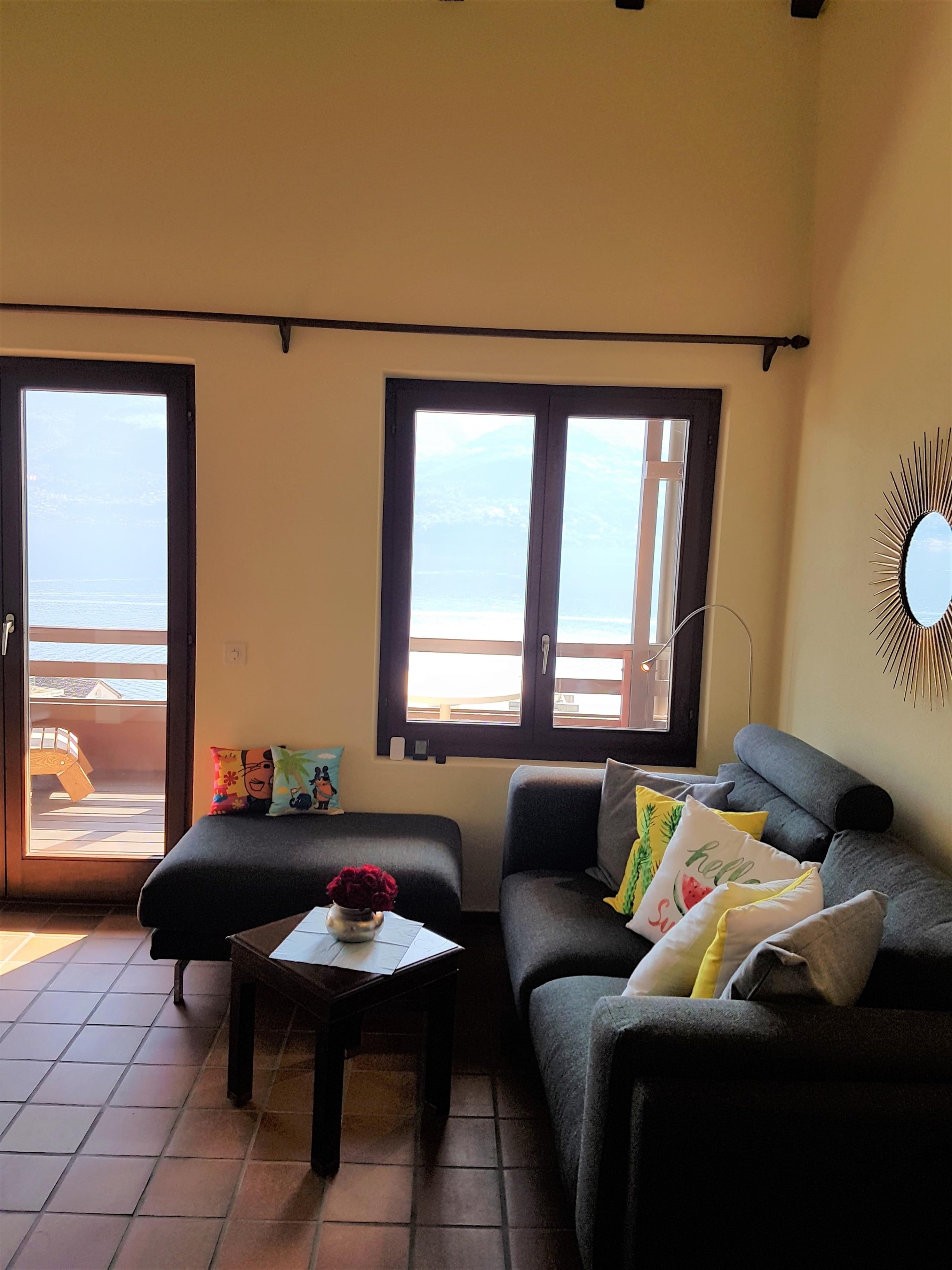 Die Maisonette-Wohnung mit den beiden Terrassen liegt ganz in der Nähe der Seepromenade und eröffnet wunderbare Blicke auf den Lago Maggiore. An der wunderschönen Seepromenade laden mehrere Restaurants zur Entspannung ein, weiterhin ist eine Anlegestation der Seeschiffahrtsgesellschaft Navigatione Lago Maggiore vorhanden. So können Sie per Boot nach Italien (z.B. Cannobbio oder Luino) oder auch nach Ascona, Locarno oder zu den reizvollen Brissago-Inseln fahren.