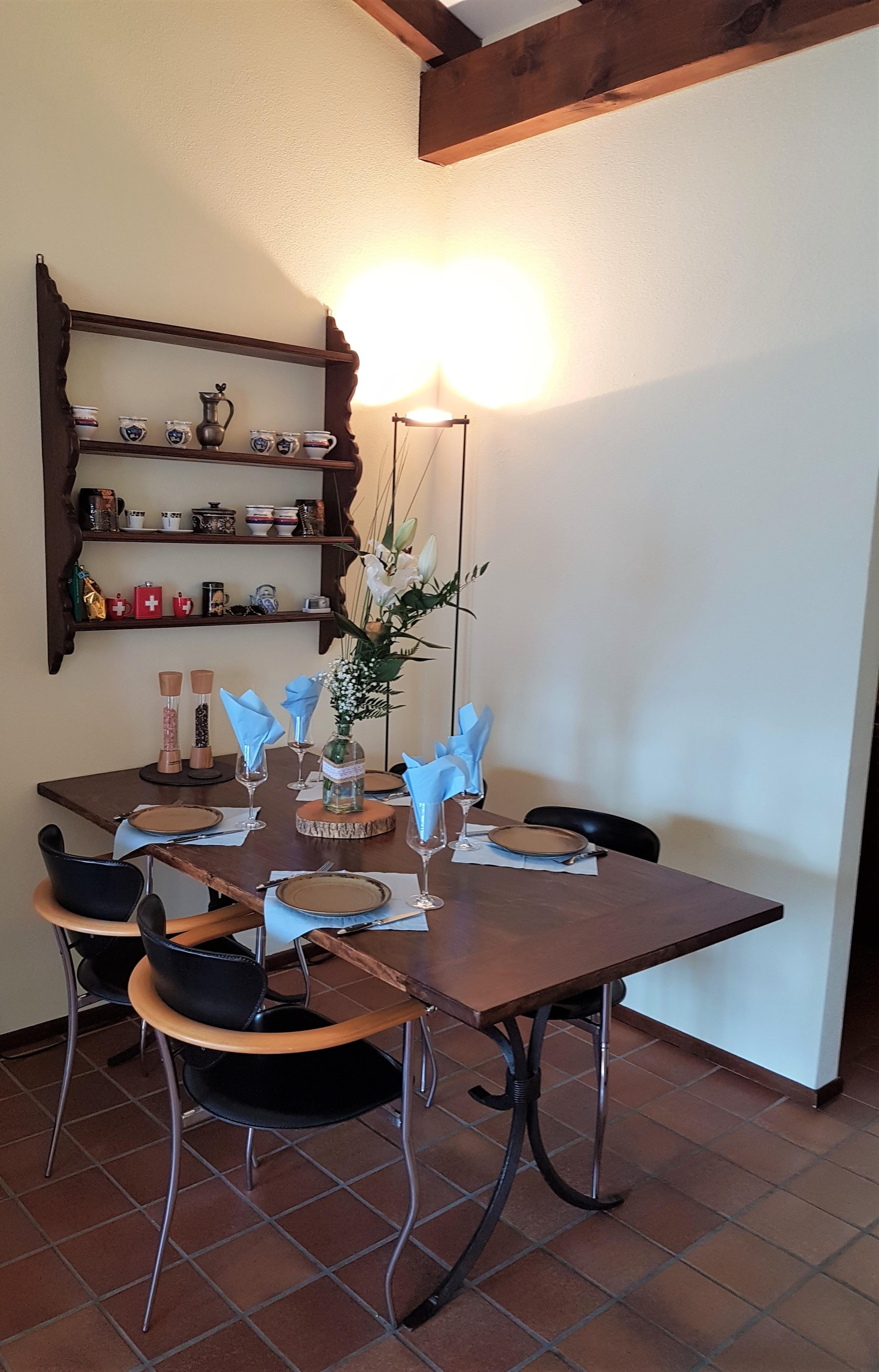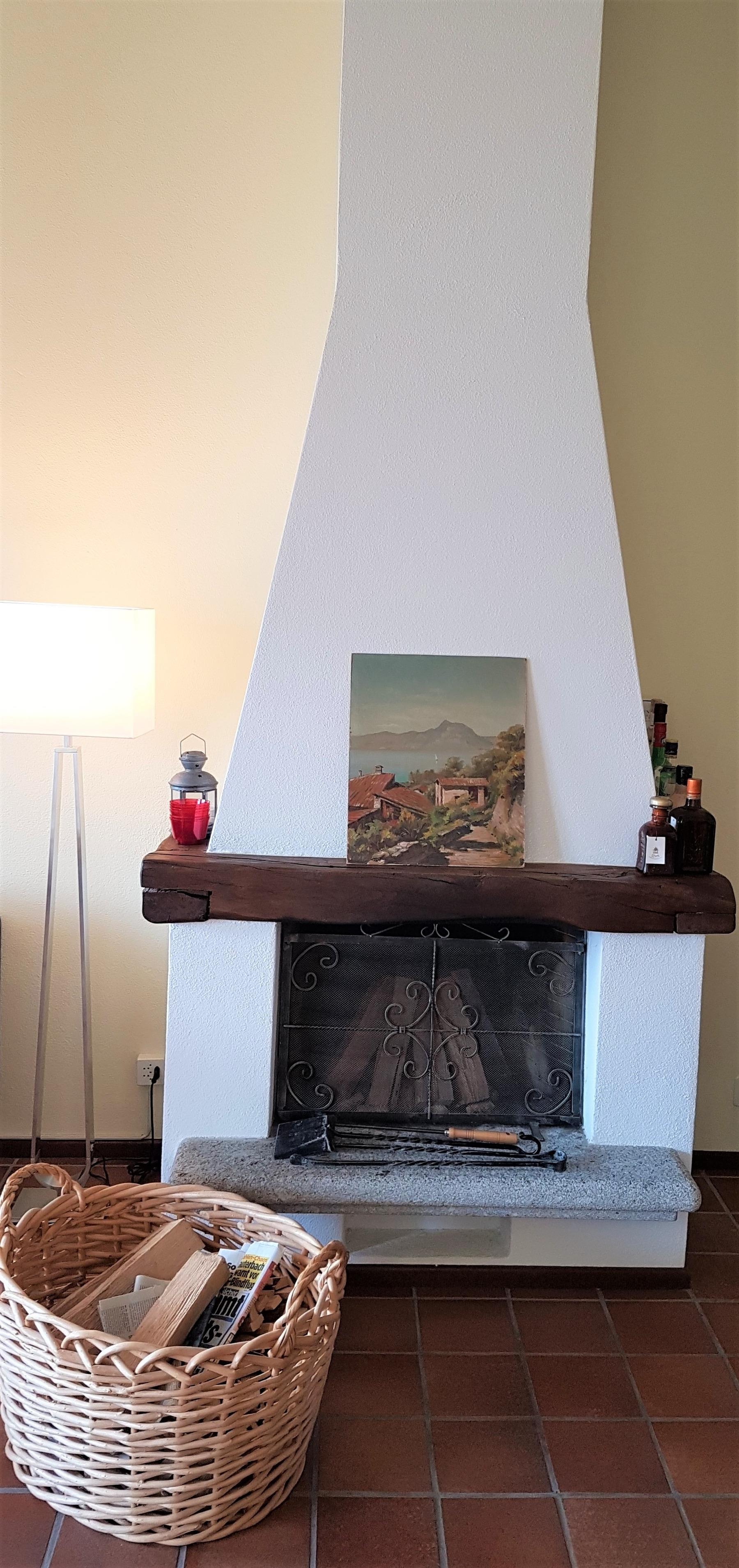 Über ein paar Stufen erreichen Sie die obere Ebene, wo Sie ein schön geschnittenes Wohnzimmer mit Essbereich sowie eine gut ausgestattete Küchenzeile sowie ein modernes Gäste-WC erwarten. Der großzügige Wohnraum überzeugt mit Tessiner Charme aufgrund der hohen Decke mit Holzbalken sowie einem offenen Kamin.