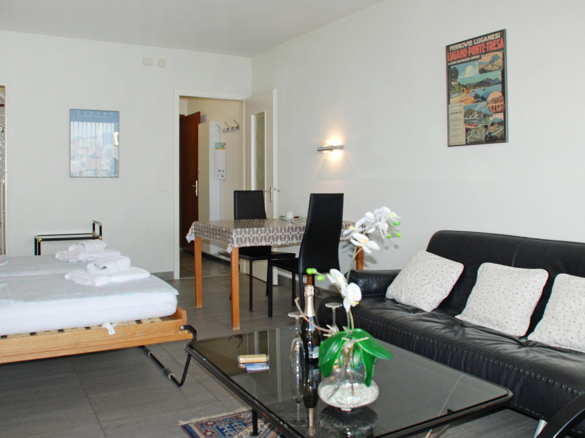 1-Zimmer-Wohnung 32 m2 im 5. Stock, Südlage. Hell, schön und geschmackvoll eingerichtet: offenes Wohn-/Esszimmer mit 2 Wandschrankbetten (90 cm, Länge 200 cm), Esstisch und Kabel-TV (Flachbildschirm), Radio. Ausgang zum Balkon. Kochnische im Eingang (3 Kochplatten, Backofen, Geschirrspüler, Mikrowelle, elektrische Kaffeemaschine, Kapseln für die Kaffeemaschine (Nespresso)). Bad/WC. Heizung. Balkon, Südlage. Balkonmöbel. Herrliche Panoramasicht auf den See, die Berge, die Landschaft und die Ortschaft. Zur Verfügung: Haartrockner. Internet (WLAN, gratis). Bitte beachten: für Kleinkinder nicht geeignet. Nichtraucher-Unterkunft. Küche mit Nespresso Kaffeemaschine (Kapseln müssen selber mitgebracht werden) und Toaster ausgerüstet. TIPP: Terrasse mit atemberaubender Sicht auf den San Salvatore und die Bucht von Lugano, Traumhaft! NL-00004457