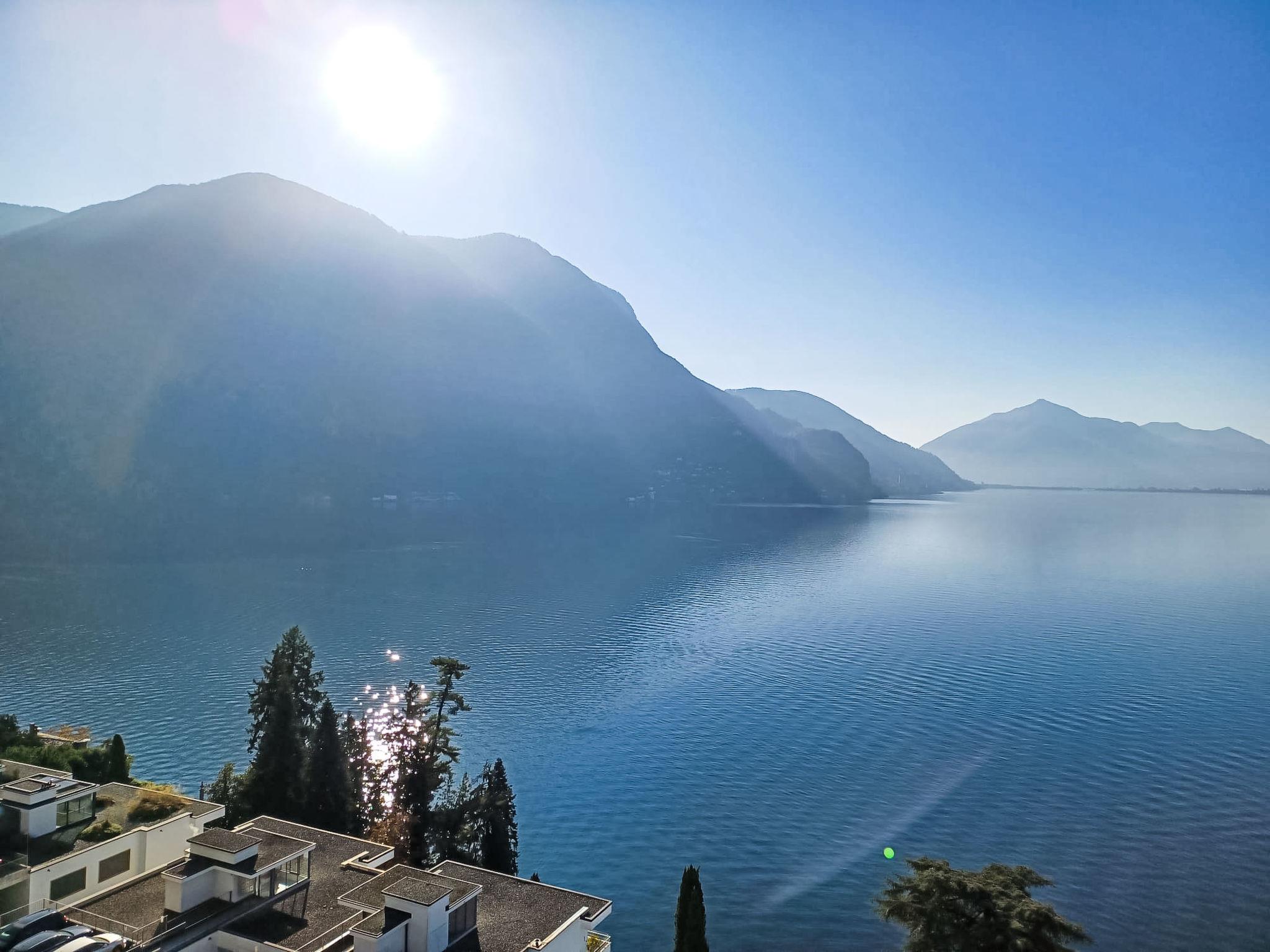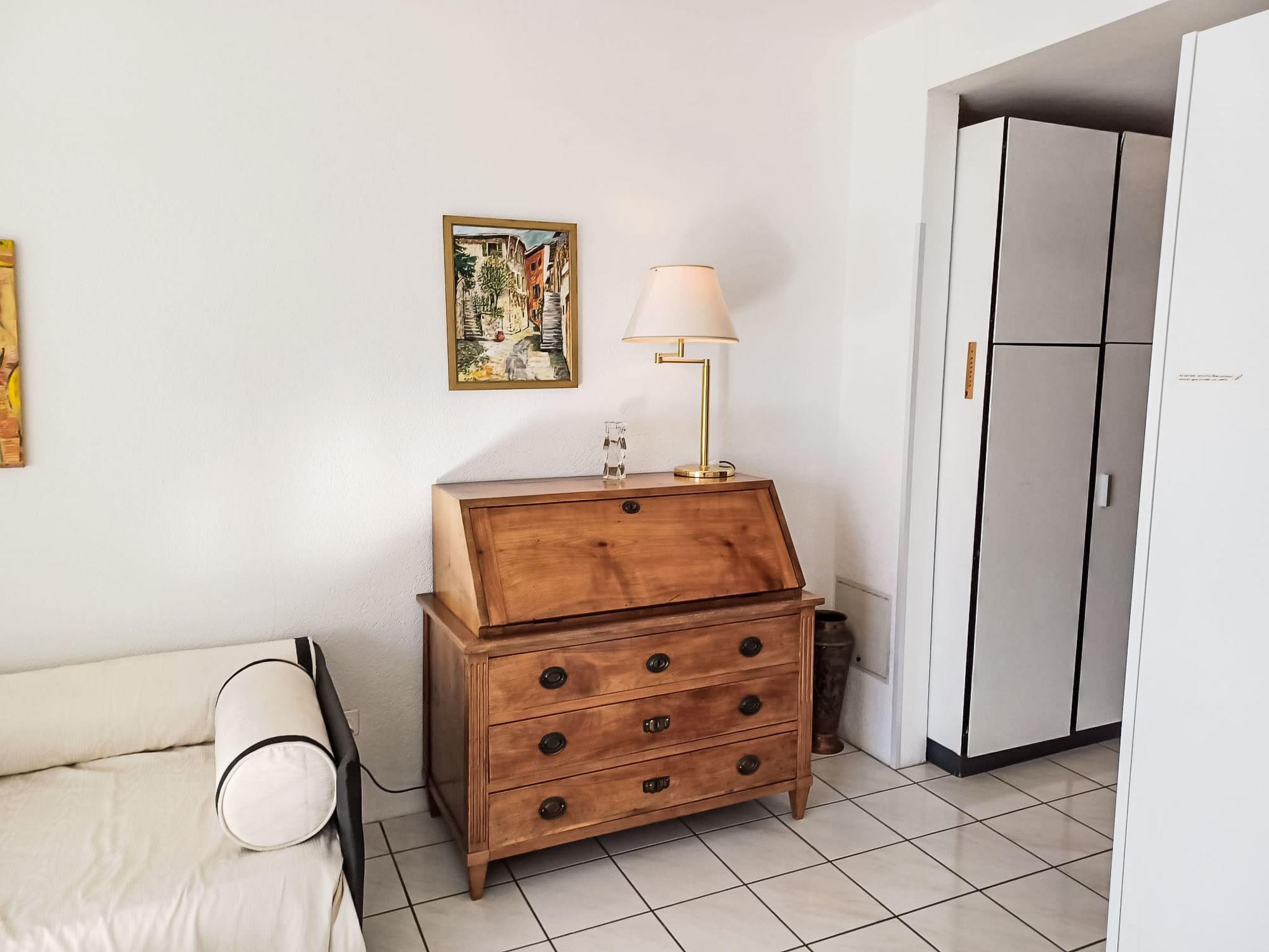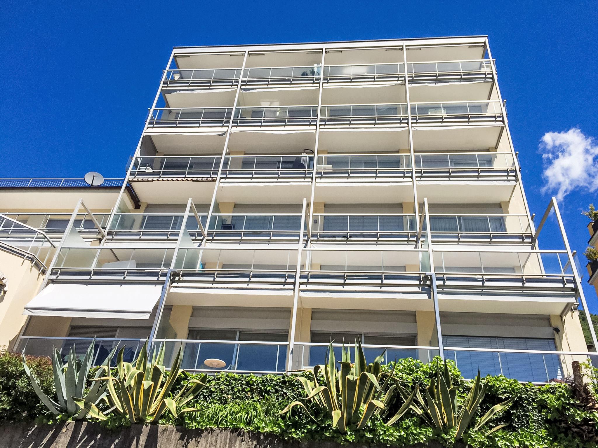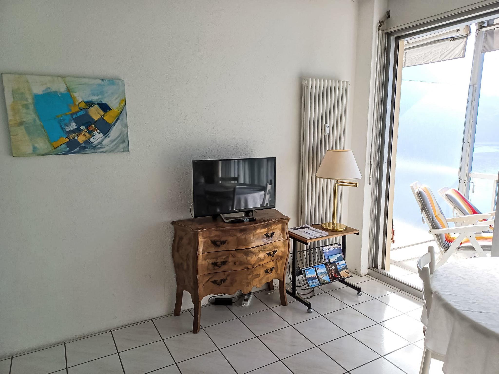 "Vista Lago", 1-Zimmer-Studio 35 m2 im 6. Stock, Südlage. Geräumig und hell, komfortabel und modern eingerichtet: offenes Wohn-/Schlafzimmer mit Panoramafenster mit 1 Doppelwandschrankbett (2 x 90 cm, Länge 200 cm), Esstisch und Sat-TV (Flachbildschirm). Ausgang zur Terrasse. Kleine Küche (4 Kochplatten, Backofen, Geschirrspüler). Dusche/WC. Terrasse 8 m2 teilweise überdacht, Südlage. Terrassenmöbel. Herrliche Panoramasicht auf den See, die Berge, die Landschaft und die Ortschaft. Zur Verfügung: Kinderhochstuhl, Babybett bis 2 Jahre (extra). Internet (Wireless LAN, gratis). Parkplatz Nr. 20 (überdacht), Höhe 290 cm, Breite 230 cm. Bitte beachten: Nichtraucher-Unterkunft. TV nur DE, EN, ES. NL-00009004