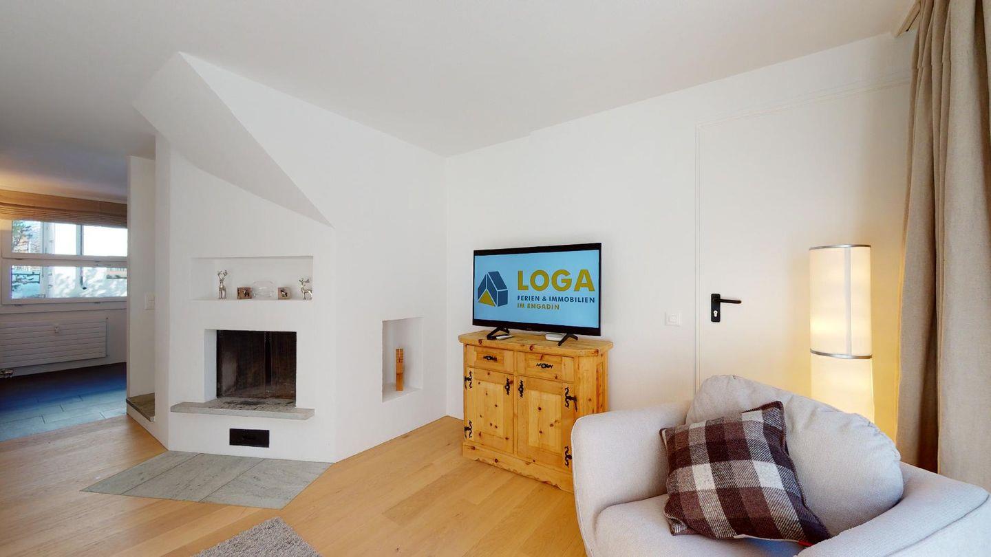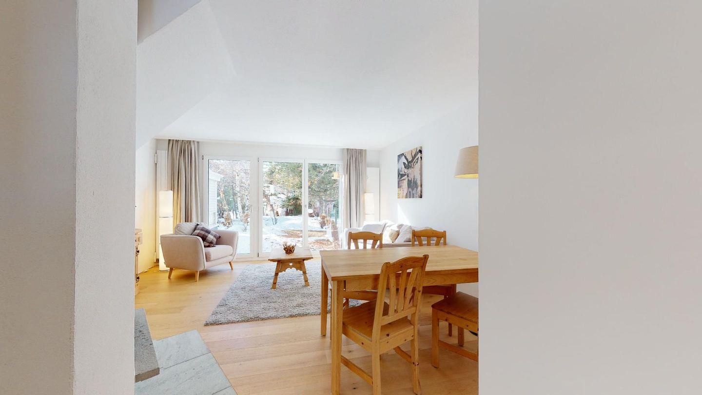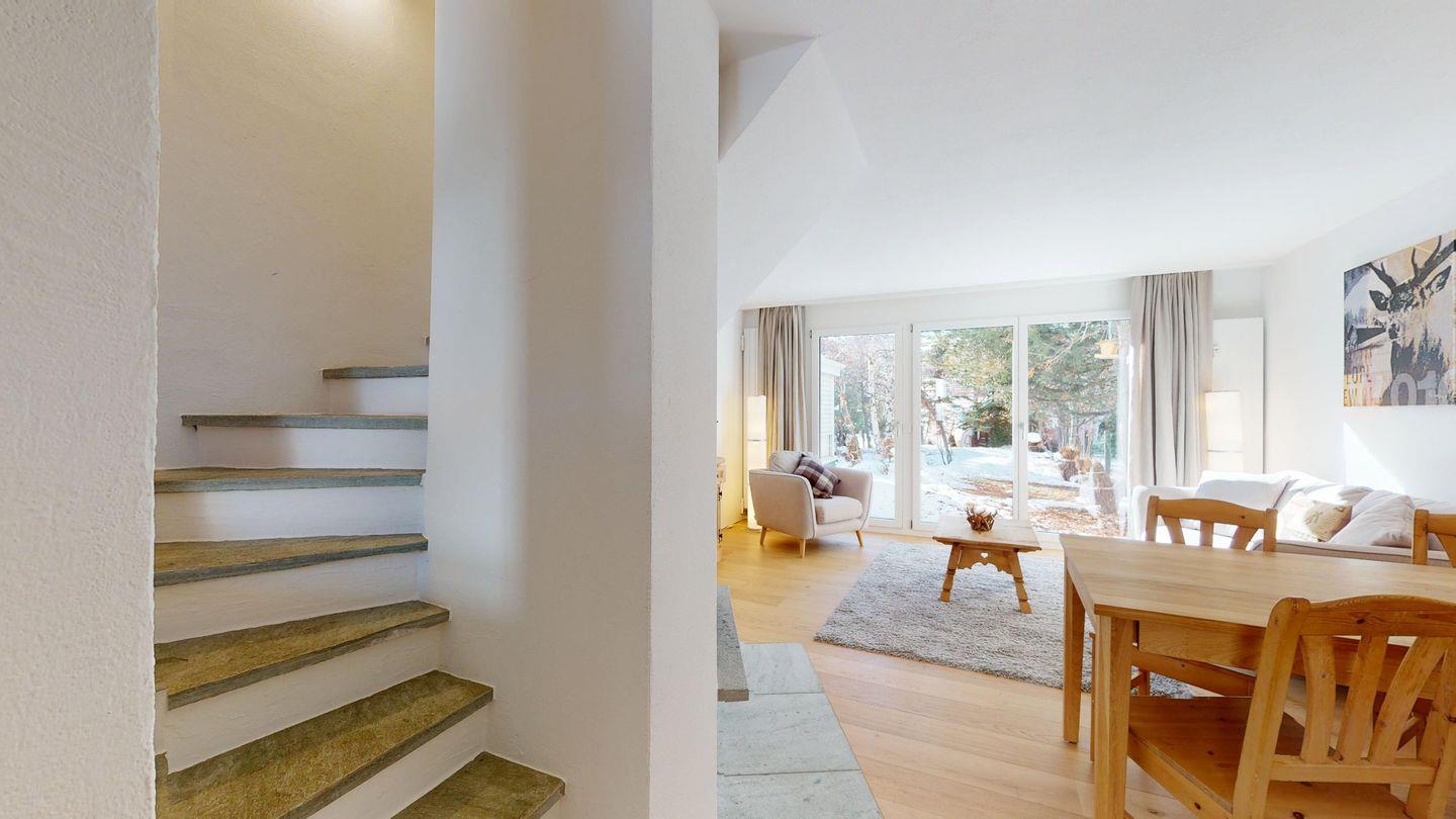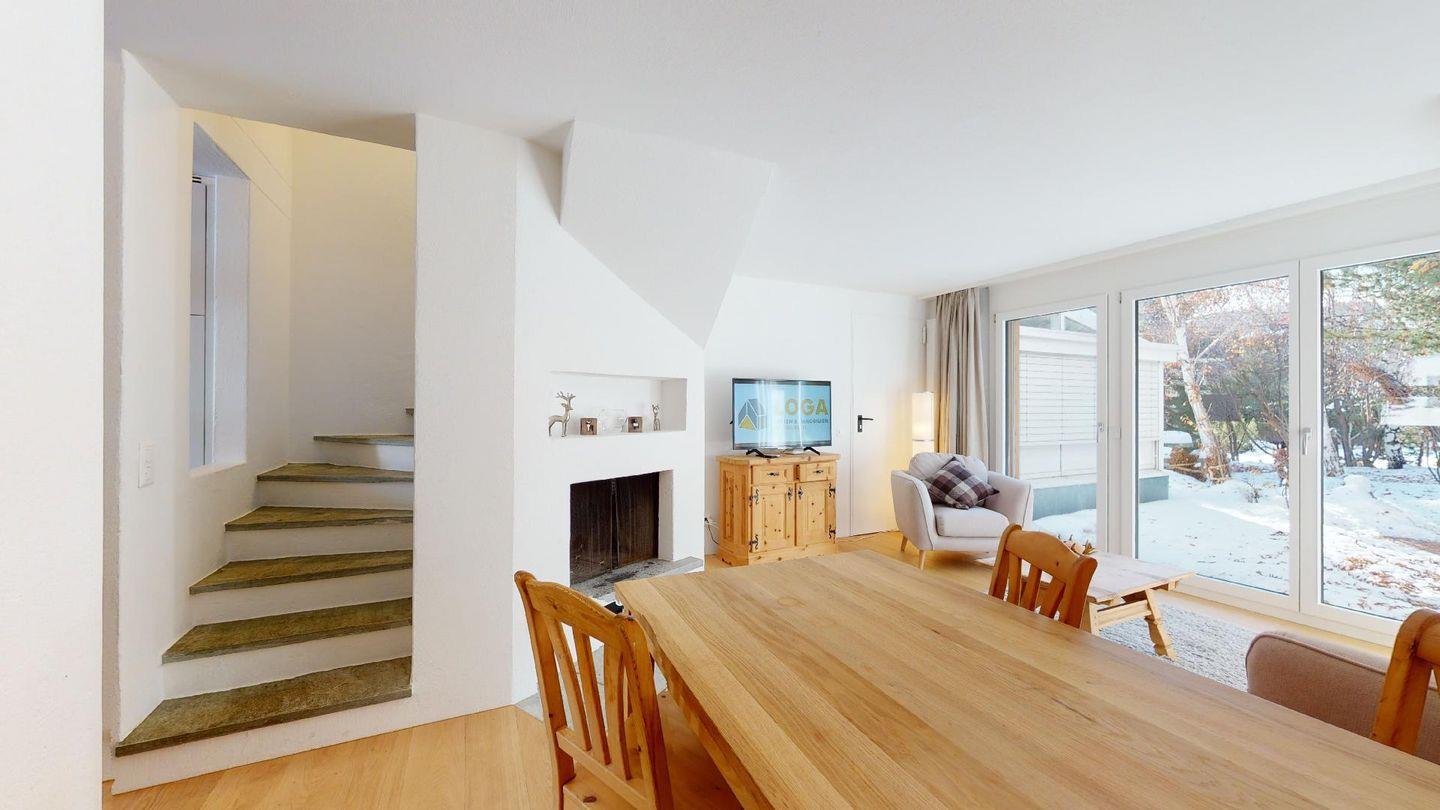 3½-Zimmerwohnung im Parterre auf 2 Etagen, ca. 80 m². Im Parterre: Entree mit Garderobe. Wohnzimmer mit Kamin und kleinem Garten, Sofa und Fernseher. Offene Wohnküche mit Essecke, Backofen, Geschirrspüler, Kühlschrank, Kaffeemaschine Chicco d'Oro und Fenster. Im 1. Stock: Zwei Doppelzimmer (Bett 180x200 cm). Dusche/Lavabo und ein separates WC mit Lavabo. Komfortable Einrichtung. Im UG eine gemeinschaftliche Sauna. Haustiere sind nicht erlaubt. Bei der Gemeinde Celerina bekommen Sie Wochenkarten für CHF 15.00 für den öffentlichen Parkplatz 50 Meter unter dem Haus. Kein Veloraum.