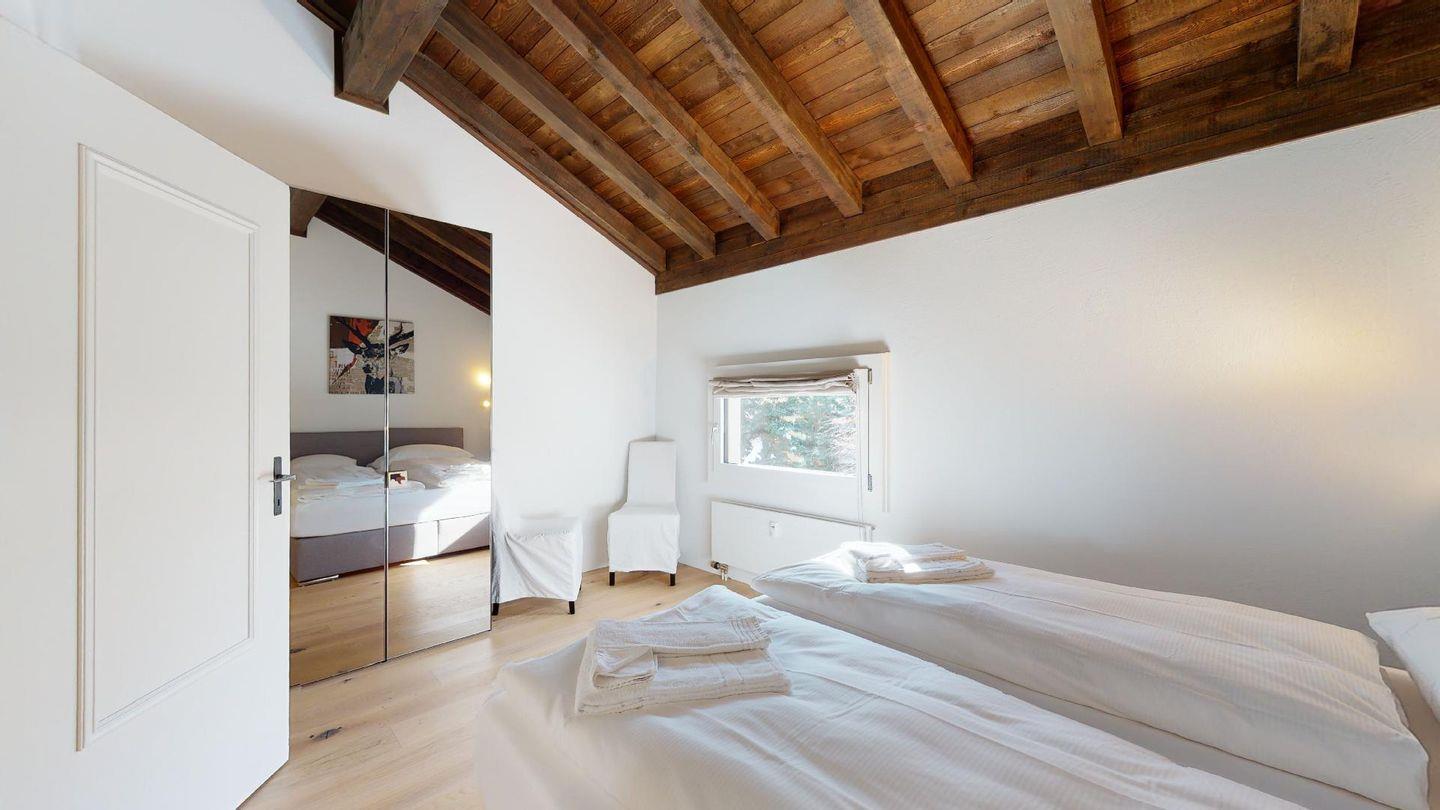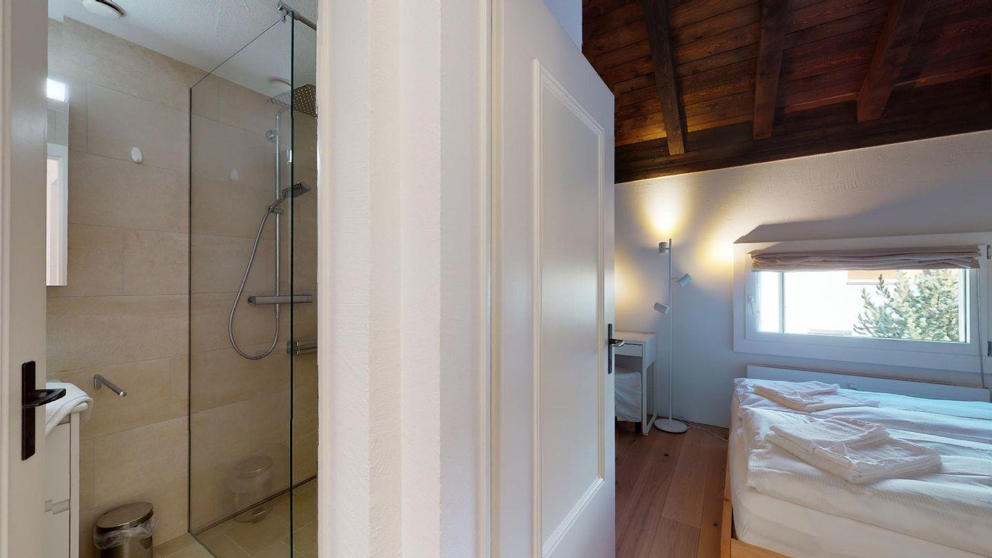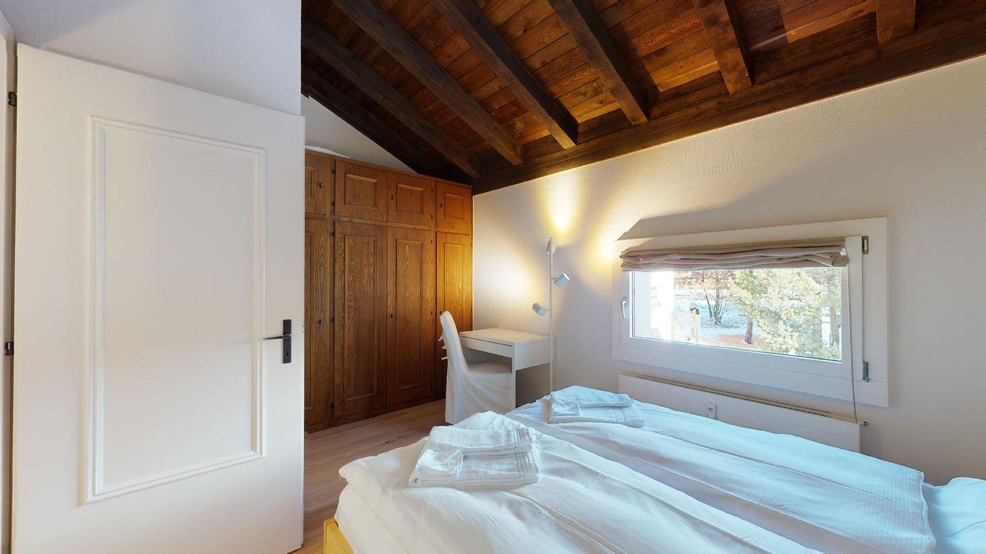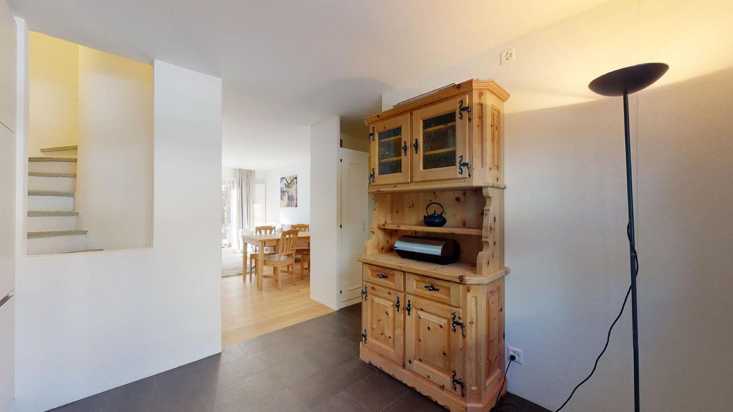 3½-Zimmerwohnung im Parterre auf 2 Etagen, ca. 80 m². Im Parterre: Entree mit Garderobe. Wohnzimmer mit Kamin und kleinem Garten, Sofa und Fernseher. Offene Wohnküche mit Essecke, Backofen, Geschirrspüler, Kühlschrank, Kaffeemaschine Chicco d'Oro und Fenster. Im 1. Stock: Zwei Doppelzimmer (Bett 180x200 cm). Dusche/Lavabo und ein separates WC mit Lavabo. Komfortable Einrichtung. Im UG eine gemeinschaftliche Sauna. Haustiere sind nicht erlaubt. Bei der Gemeinde Celerina bekommen Sie Wochenkarten für CHF 15.00 für den öffentlichen Parkplatz 50 Meter unter dem Haus. Kein Veloraum.