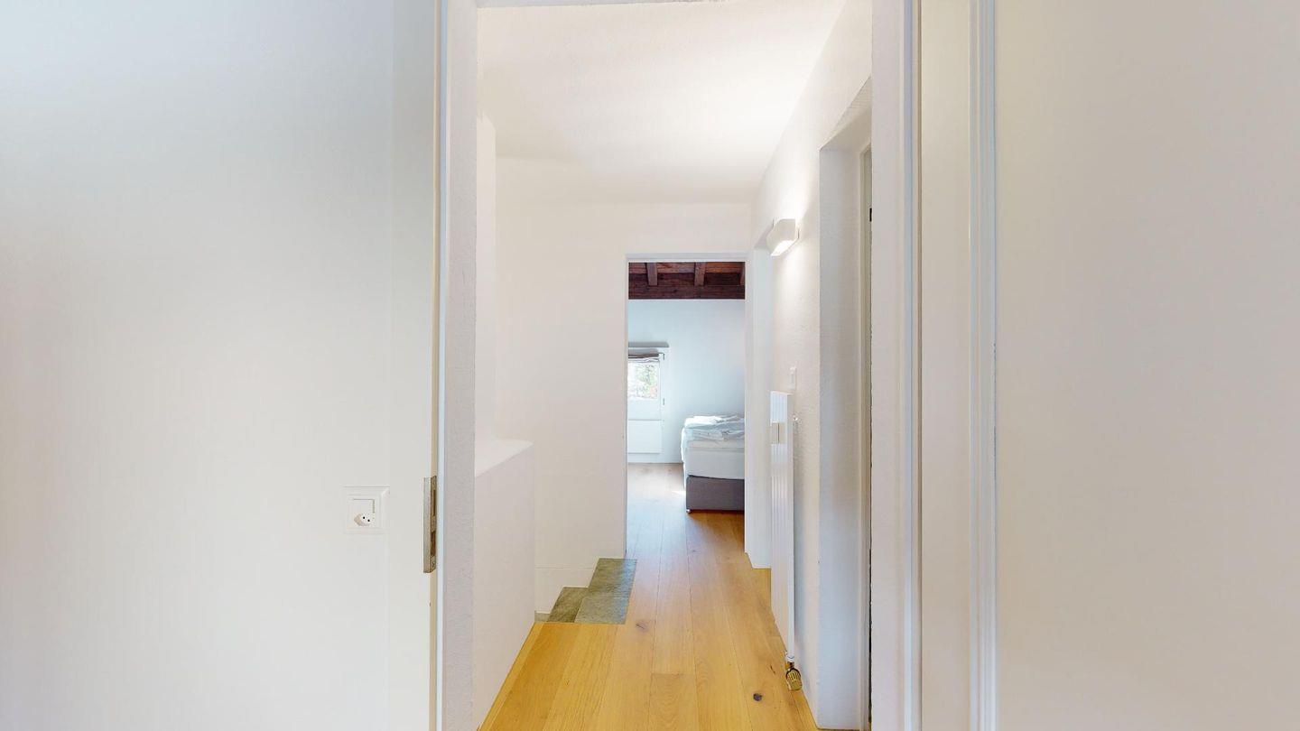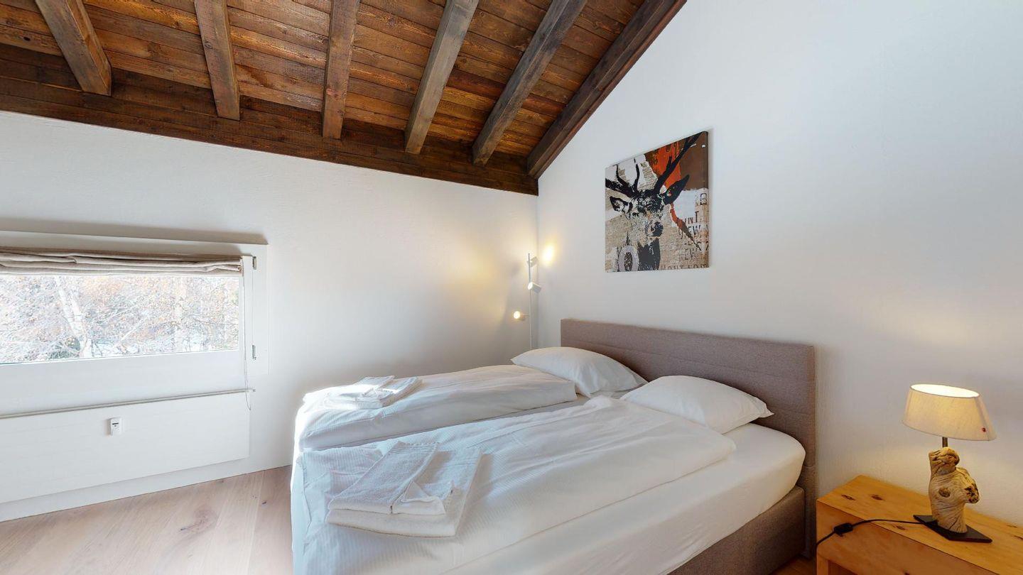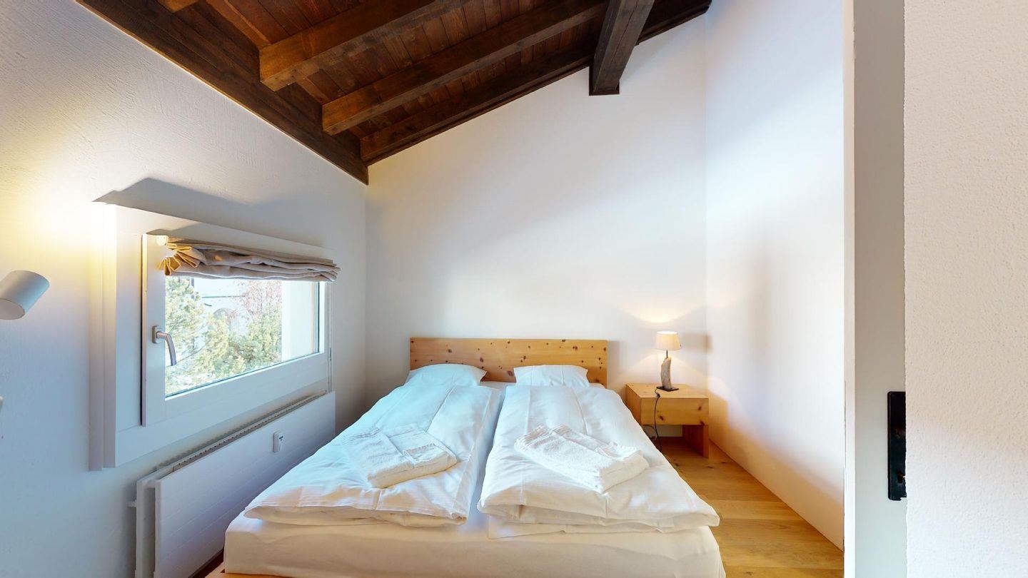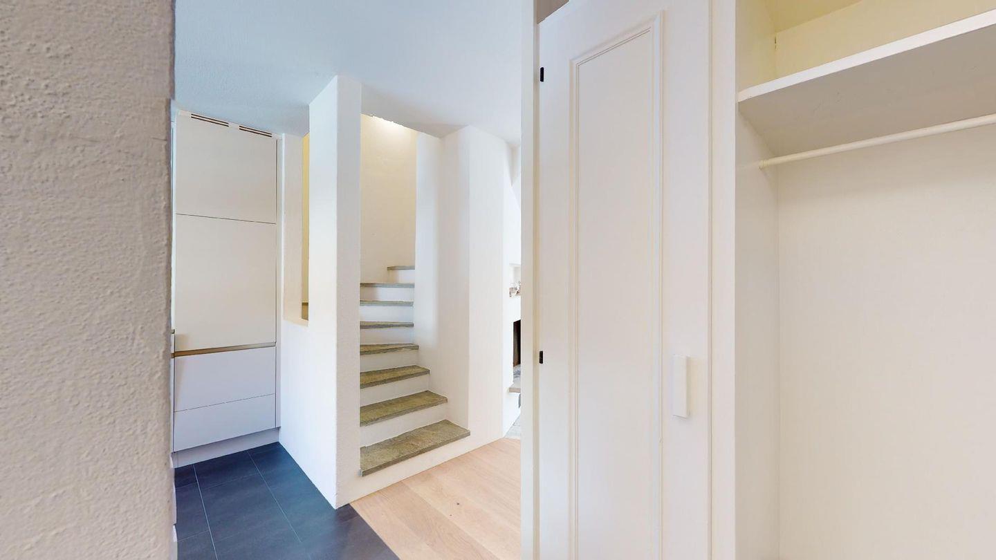 3½-Zimmerwohnung im Parterre auf 2 Etagen, ca. 80 m². Im Parterre: Entree mit Garderobe. Wohnzimmer mit Kamin und kleinem Garten, Sofa und Fernseher. Offene Wohnküche mit Essecke, Backofen, Geschirrspüler, Kühlschrank, Kaffeemaschine Chicco d'Oro und Fenster. Im 1. Stock: Zwei Doppelzimmer (Bett 180x200 cm). Dusche/Lavabo und ein separates WC mit Lavabo. Komfortable Einrichtung. Im UG eine gemeinschaftliche Sauna. Haustiere sind nicht erlaubt. Bei der Gemeinde Celerina bekommen Sie Wochenkarten für CHF 15.00 für den öffentlichen Parkplatz 50 Meter unter dem Haus. Kein Veloraum.