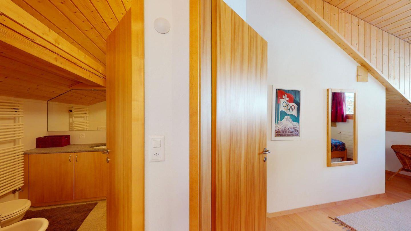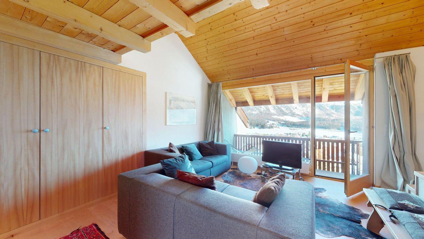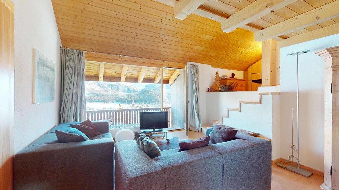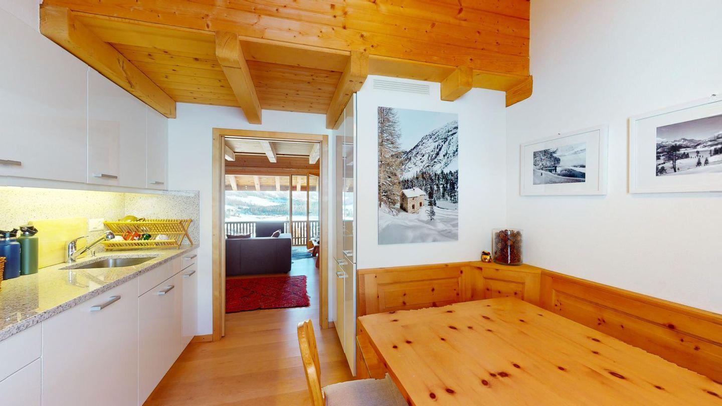 Sonnige 3-Zimmerwohnung in letzter Reihe über Celerina. Nach dem Wohnungseingang führt eine Treppe ins Wohnzimmer mit Balkon und herrlichem Blick in die Bergwelt. Geschlossene Küche mit Essbereich. Ein Schlafzimmer mit Doppelbett. Ein kleineres Schlafzimmer mit zwei Einzelbetten. Badezimmer mit Wanne, WC, Bidet und Lavabo. Ein Parkplatz in der Garage. Nichtraucherwohnung. Haustiere sind nicht gestattet.