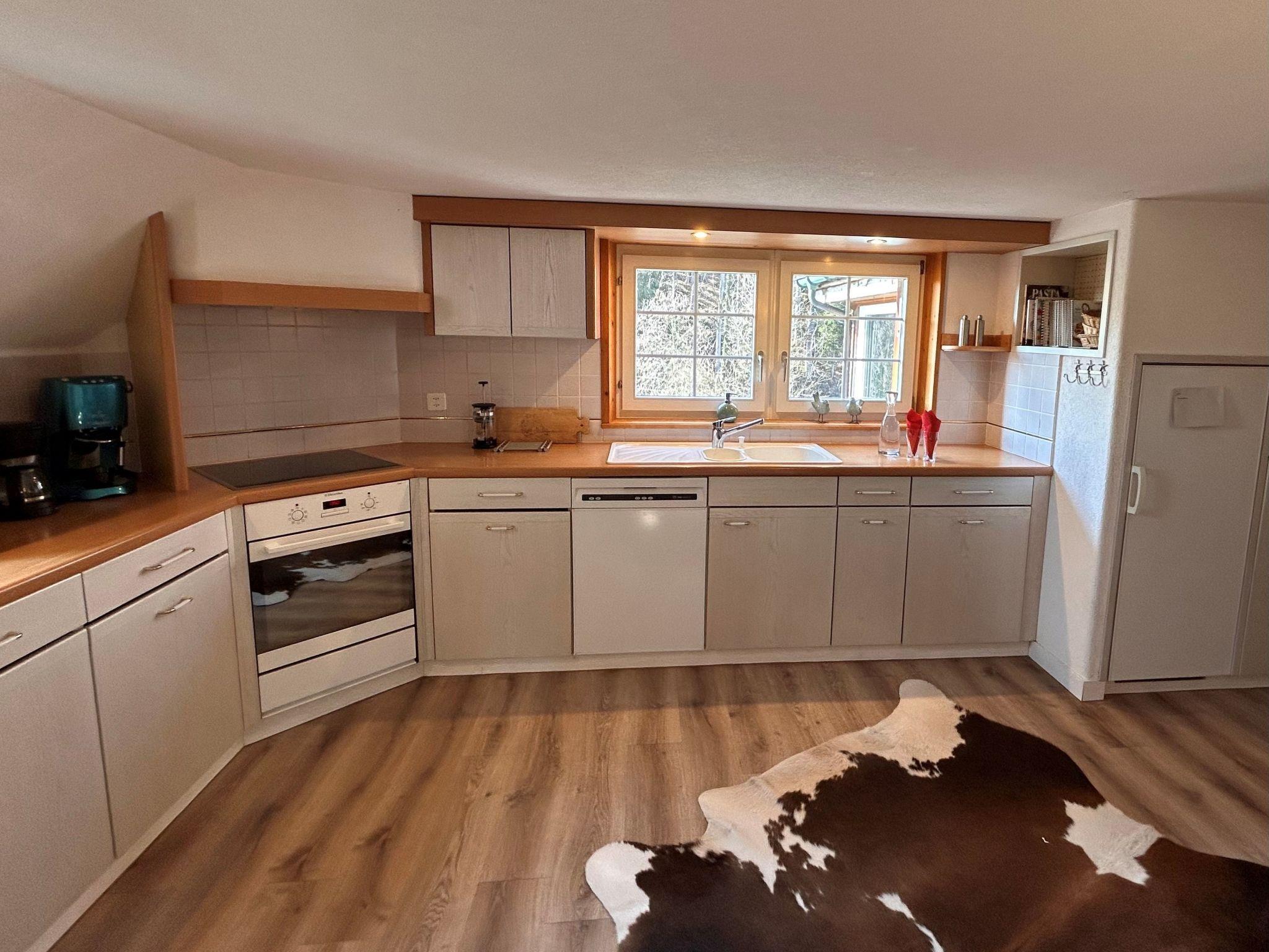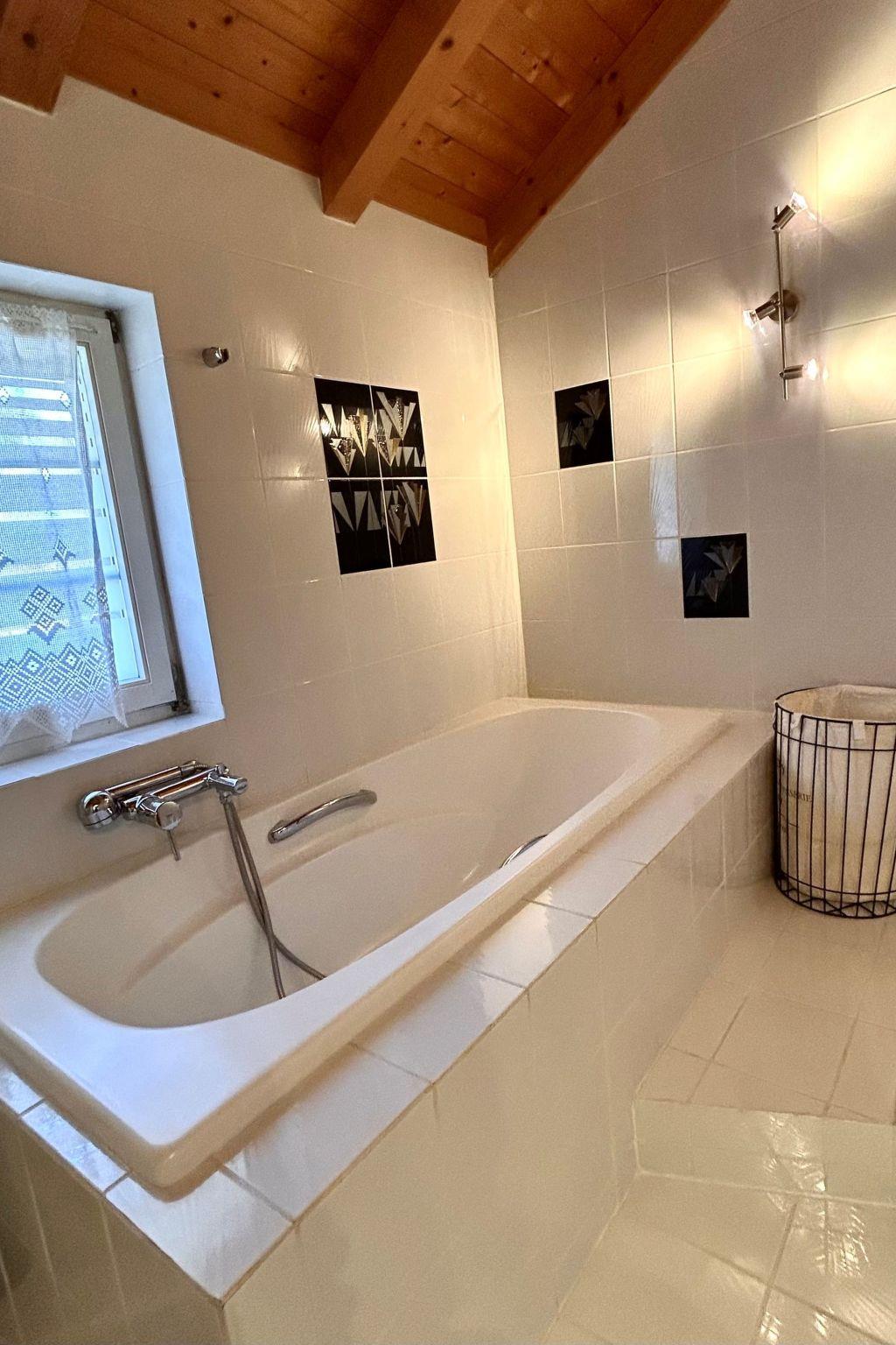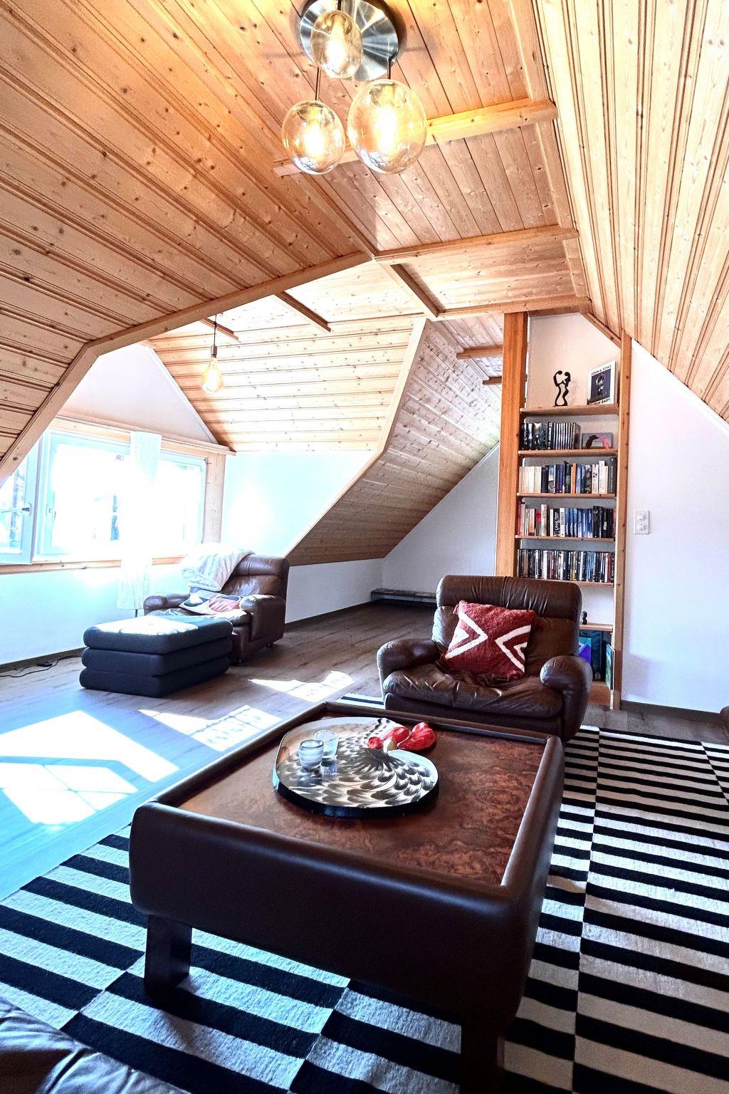 Im Inneren erwartet Sie eine uswahl an Annehmlichkeiten, die Ihren Urlaub so bequem wie möglich gestalten. Drei individuell eingerichtete Schlafzimmer bieten Platz für unterschiedliche Bedürfnisse: ein Zimmer mit Doppelbett und grossem Einbauschrank, ein Zimmer mit Twin-Betten, die zu einem Doppelbett zusammengefügt werden können und ein Zimmer mit einem Einzelbett sowie einem kleinen Arbeitsplatz. Die grosszügige Küche ist komplett ausgestattet - von einem Induktionsherd, Backofen, Geschirrspüler und Kühlschrank, bis hin zu einem Toaster, Wasserkocher, Mixer, Eierkocher, Racletteofen und vielfältigen Kaffeezubereitungen. Am Schiefertisch im lichtdurchfluteten Wintergarten können Sie mit Blick ins Grüne Ihre Mahlzeiten oder ein Glas Wein geniessen. In der Dachetage findet sich neben einer bequemen Couch, Kabel-TV, Blueray-DVD und Surroundsound-Anlage auch eine Bücher-Austauschbibliothek, DVD's, Brett- und Gesellschaftsspiele sowie ein Kickertisch.