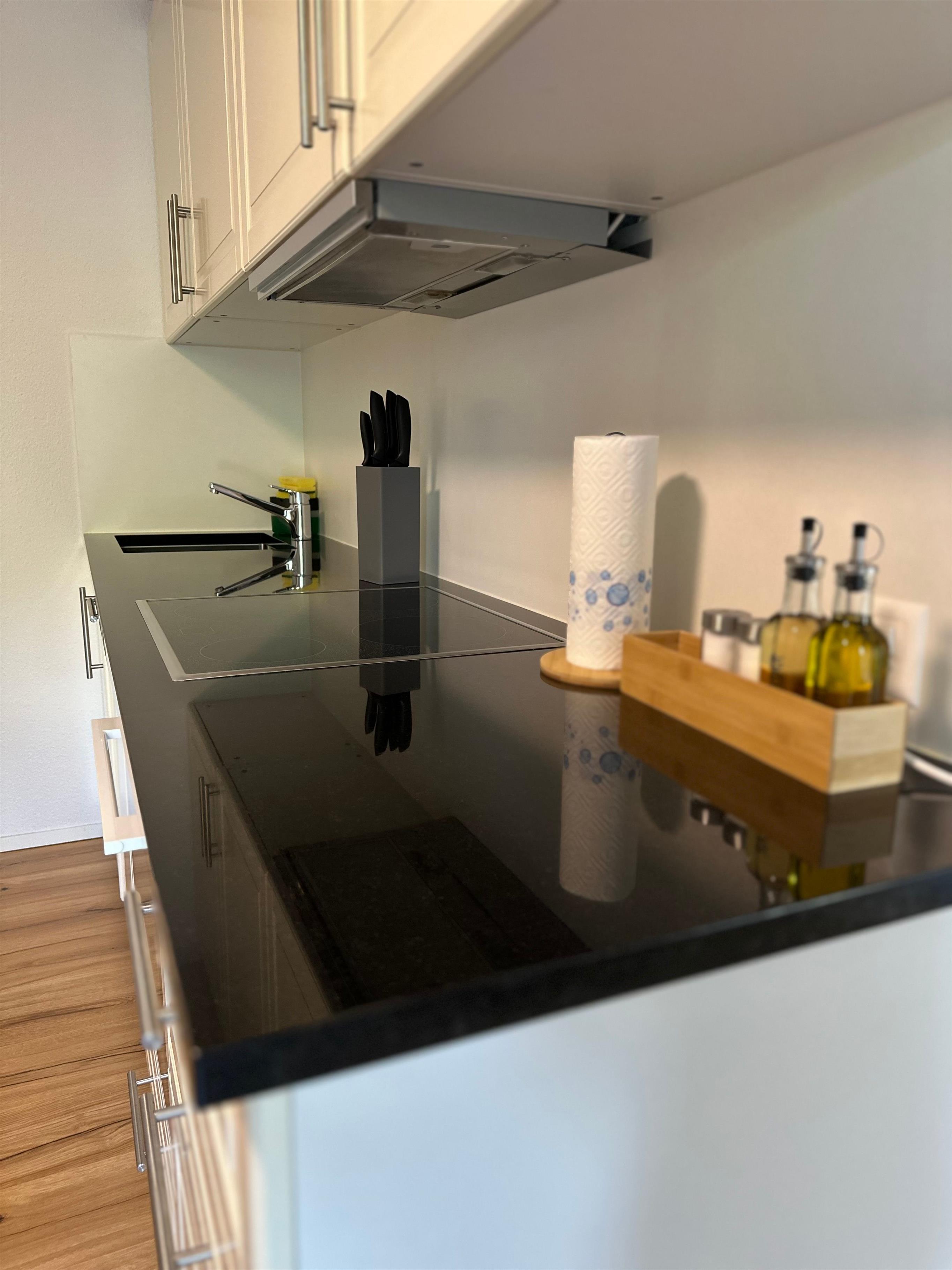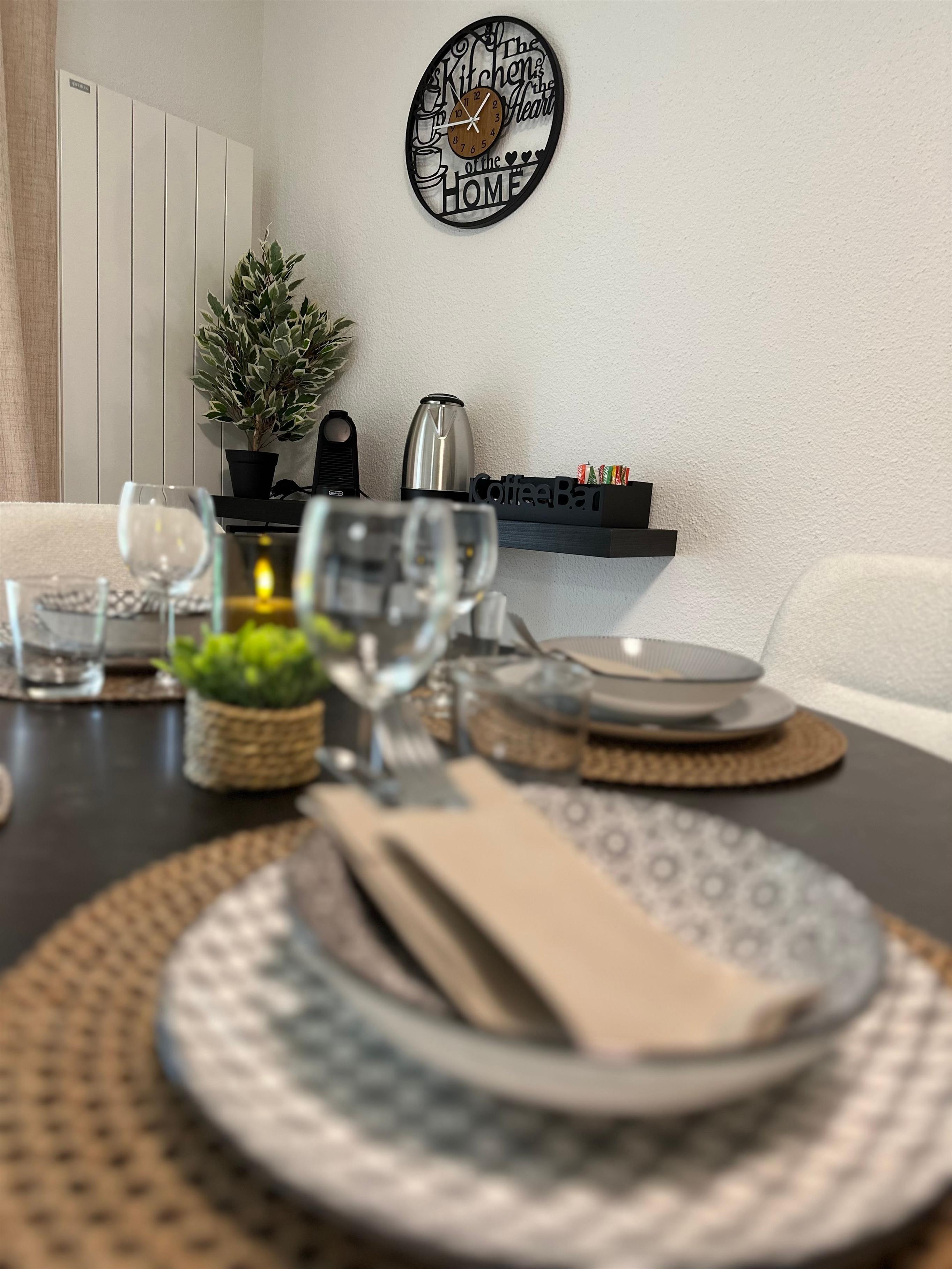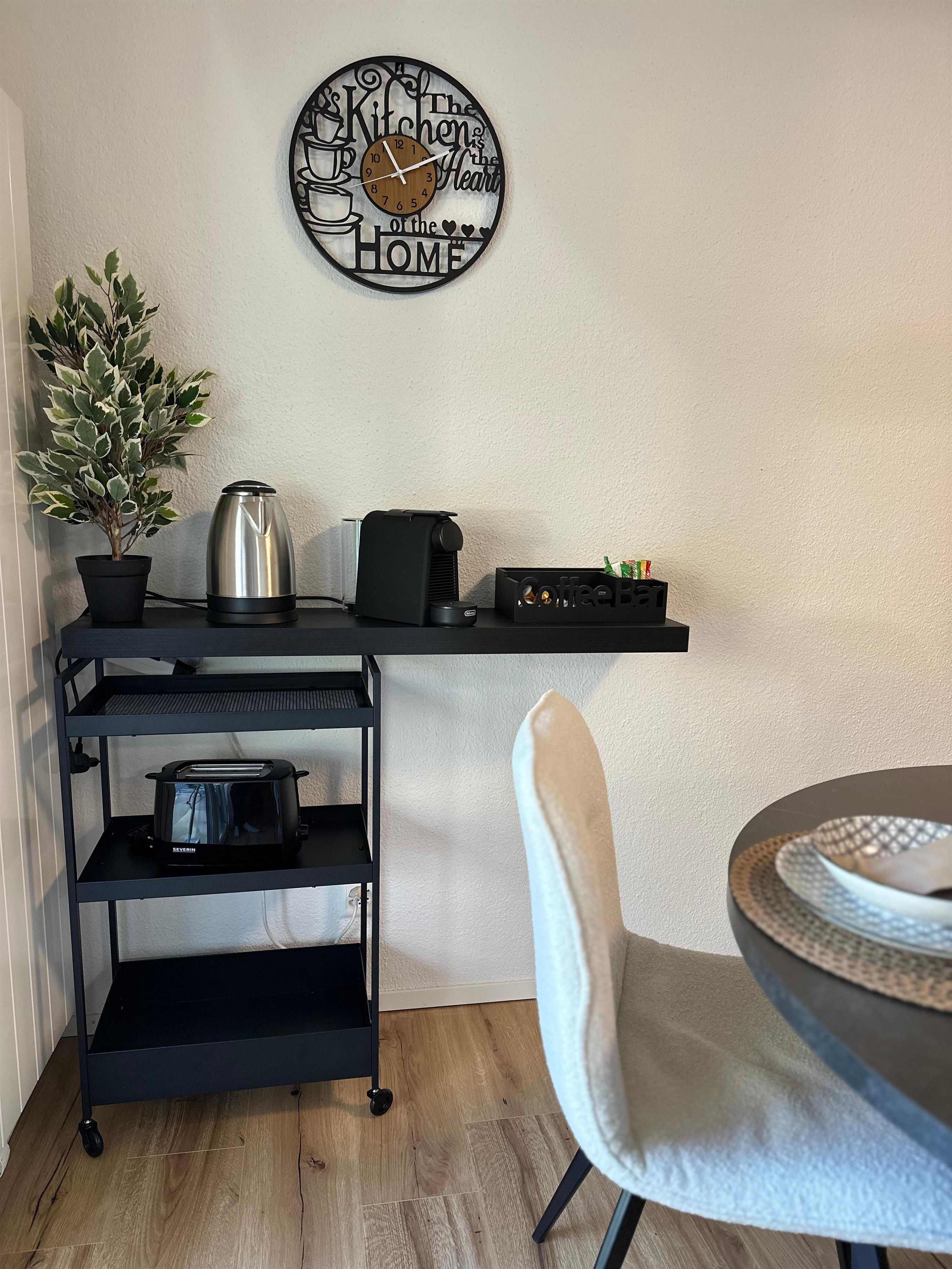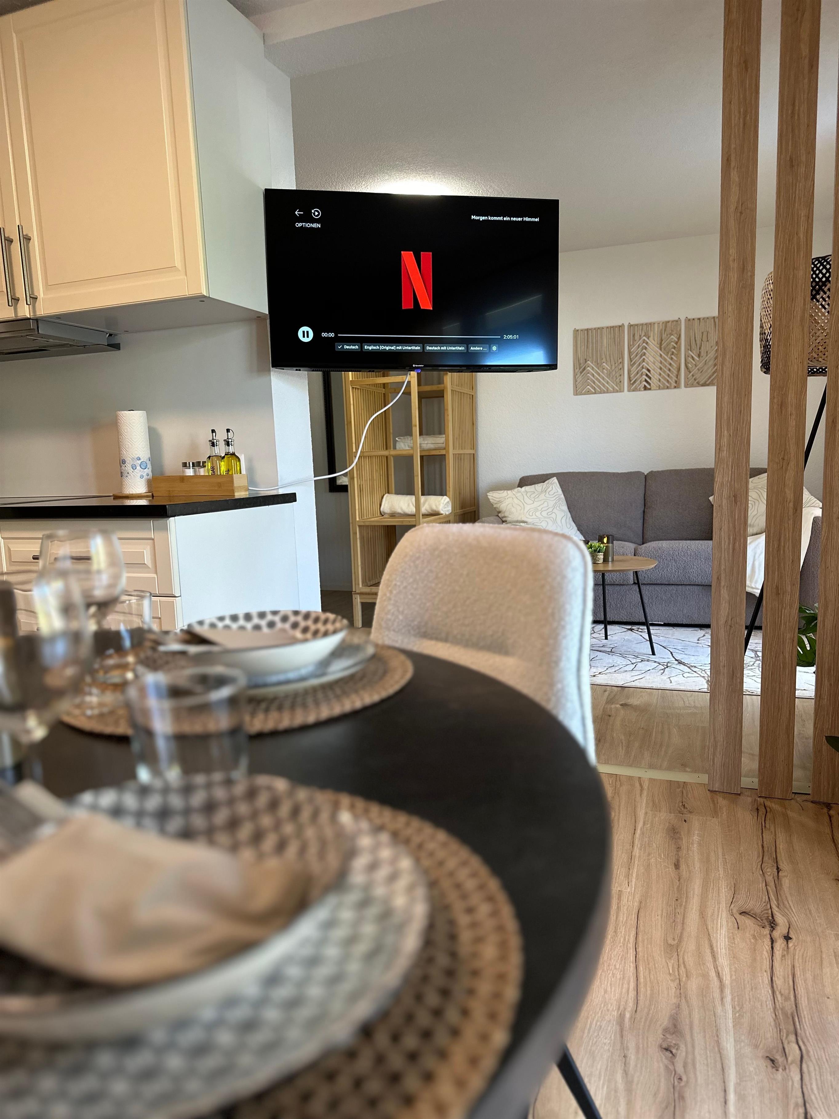 Das Innere der Wohnung ist praktisch ausgestattet, um Ihren Aufenthalt so angenehm wie möglich zu gestalten. Ein wichtiges Merkmal ist die voll ausgestattete Küche mit Cerankochfeld, Kapsel-Kaffeemaschine, Spülmaschine und Wasserkocher, die keine Wünsche offen lässt. Die Annehmlichkeiten und die wohl durchdachte Aufteilung sorgen dafür, dass sich kleine Familien oder Gruppen hier sofort zu Hause fühlen können.