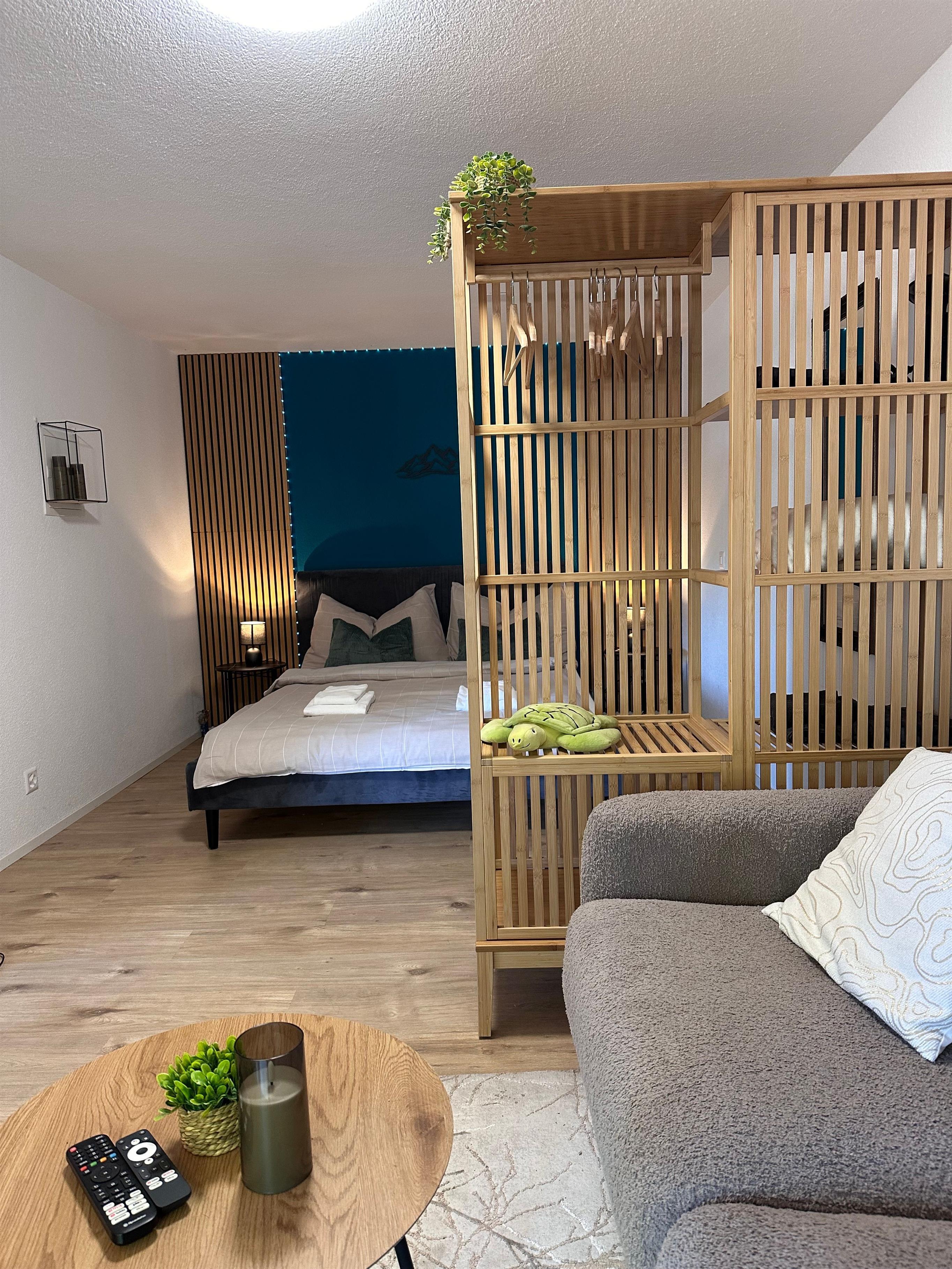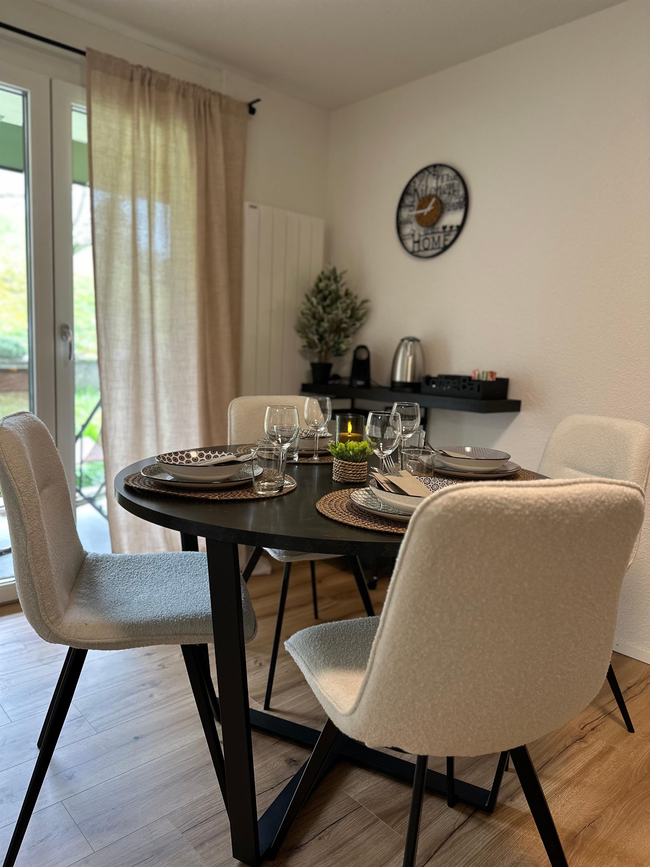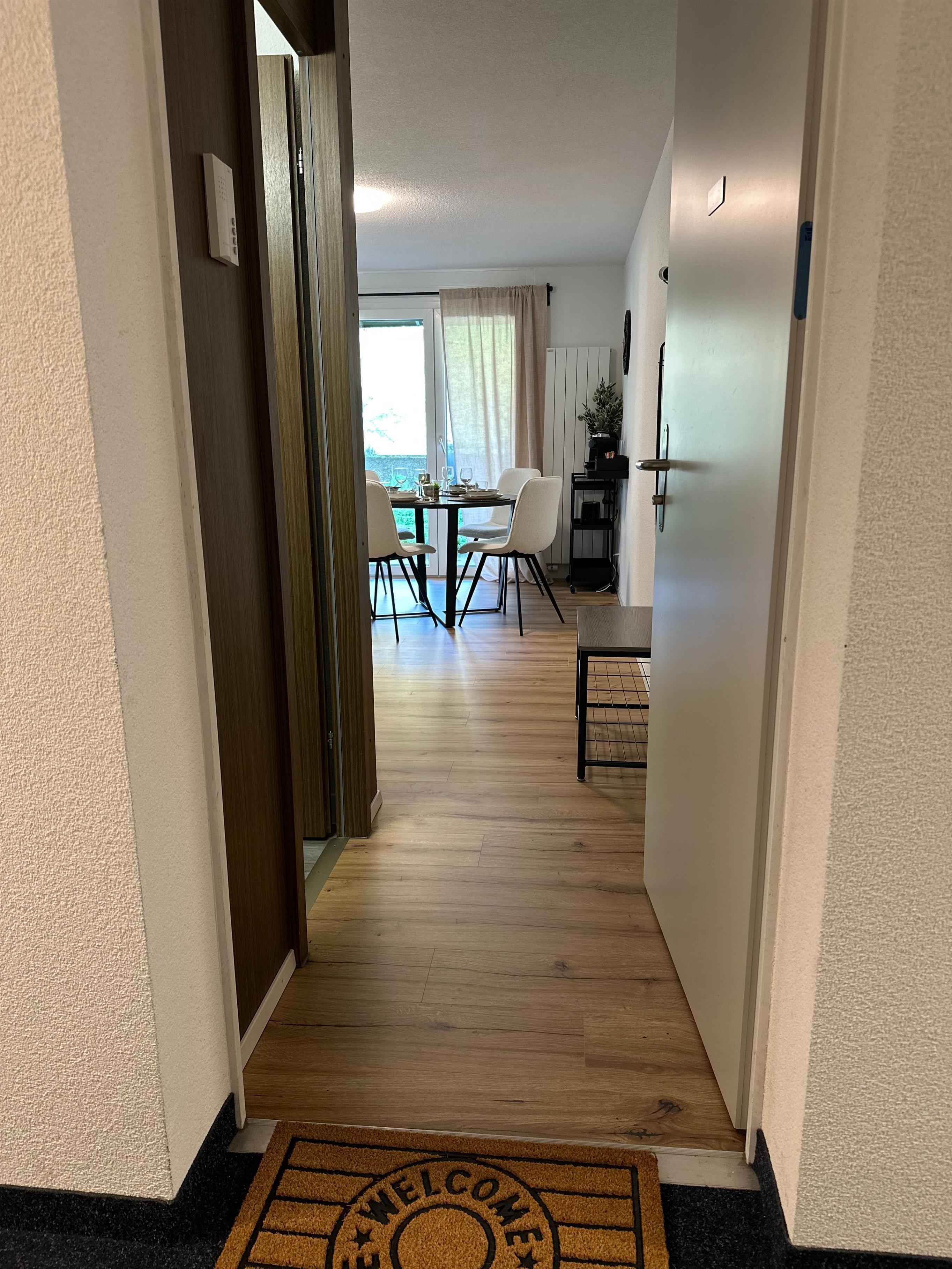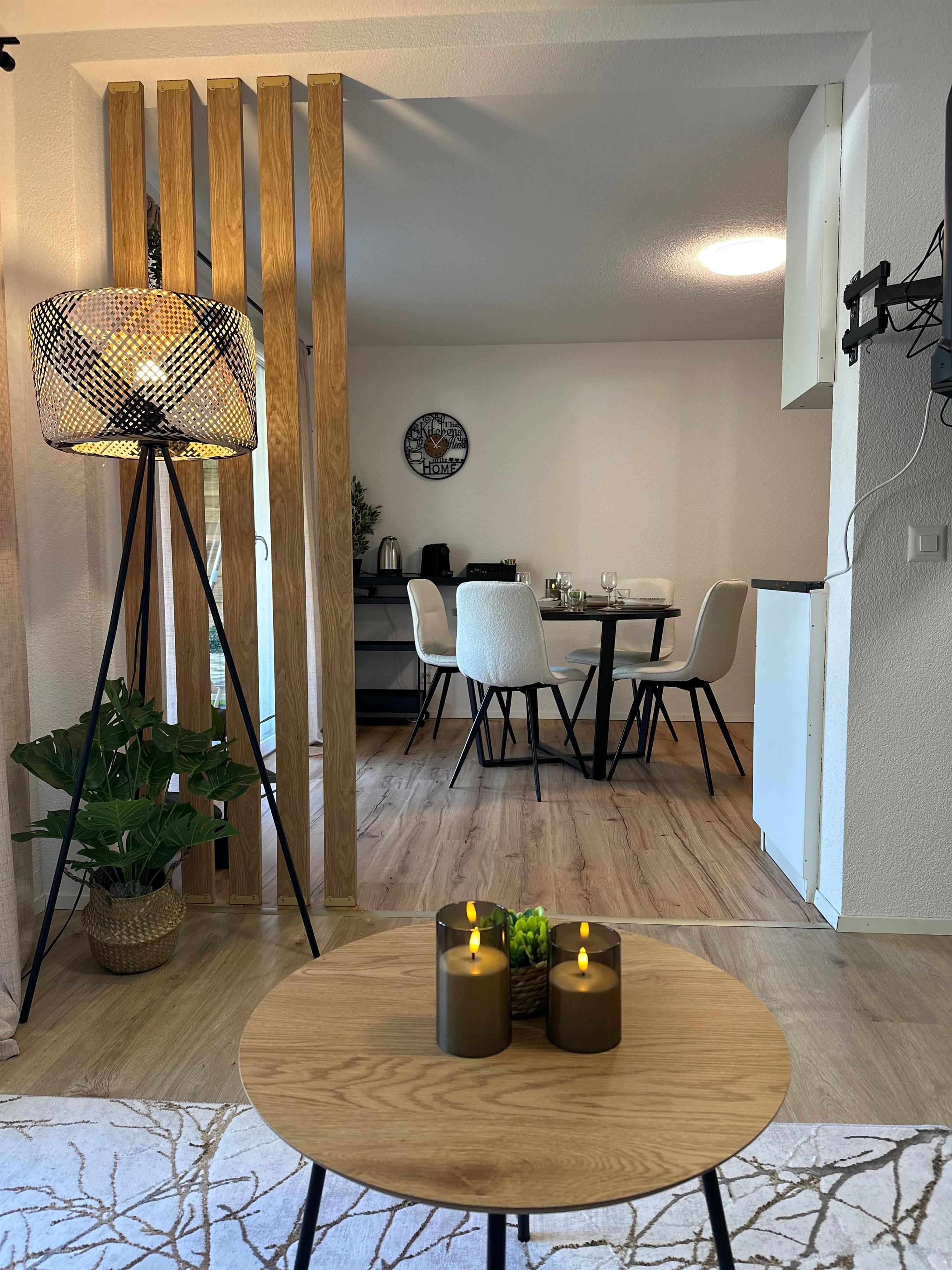 Das Innere der Wohnung ist praktisch ausgestattet, um Ihren Aufenthalt so angenehm wie möglich zu gestalten. Ein wichtiges Merkmal ist die voll ausgestattete Küche mit Cerankochfeld, Kapsel-Kaffeemaschine, Spülmaschine und Wasserkocher, die keine Wünsche offen lässt. Die Annehmlichkeiten und die wohl durchdachte Aufteilung sorgen dafür, dass sich kleine Familien oder Gruppen hier sofort zu Hause fühlen können.