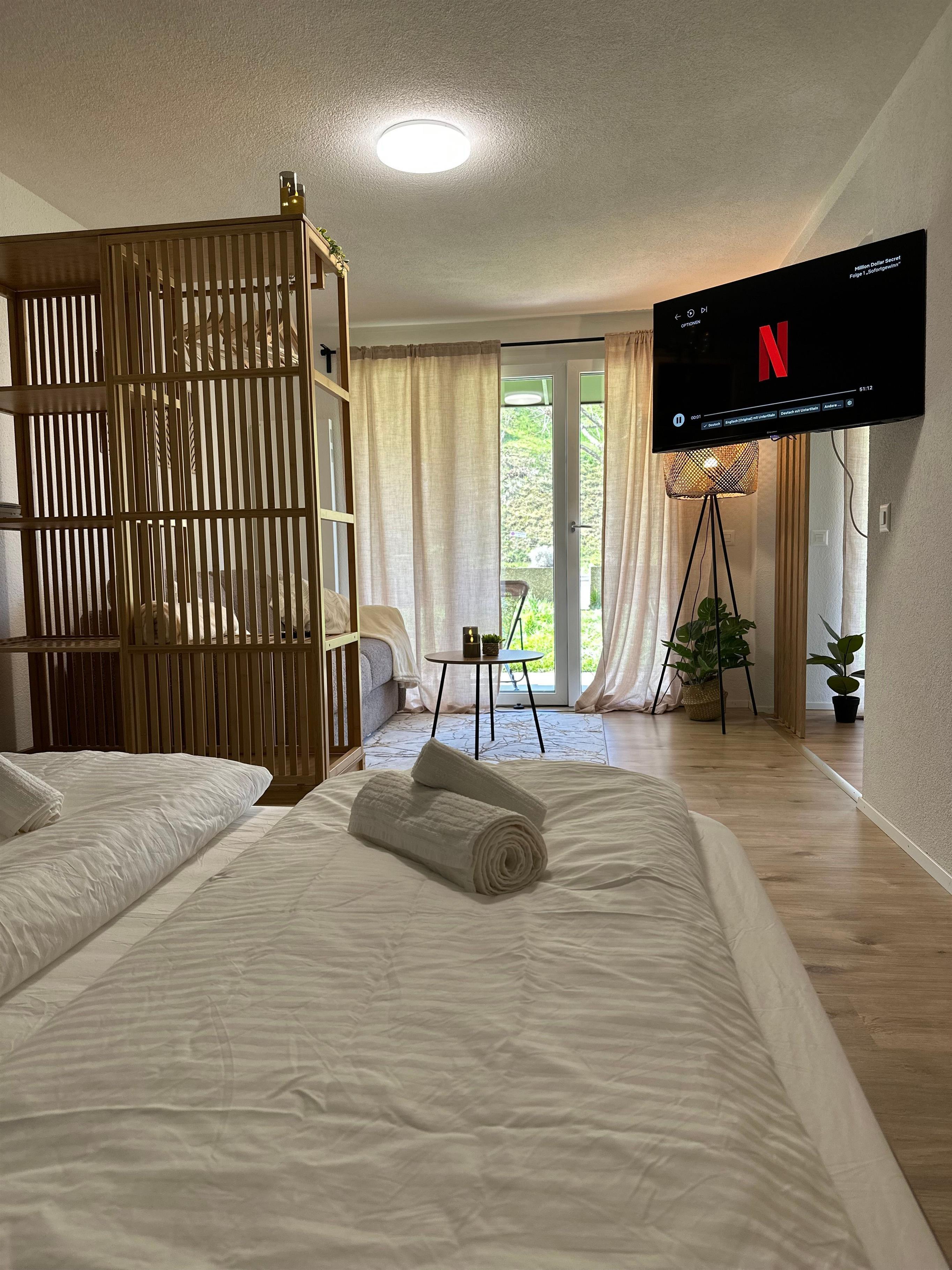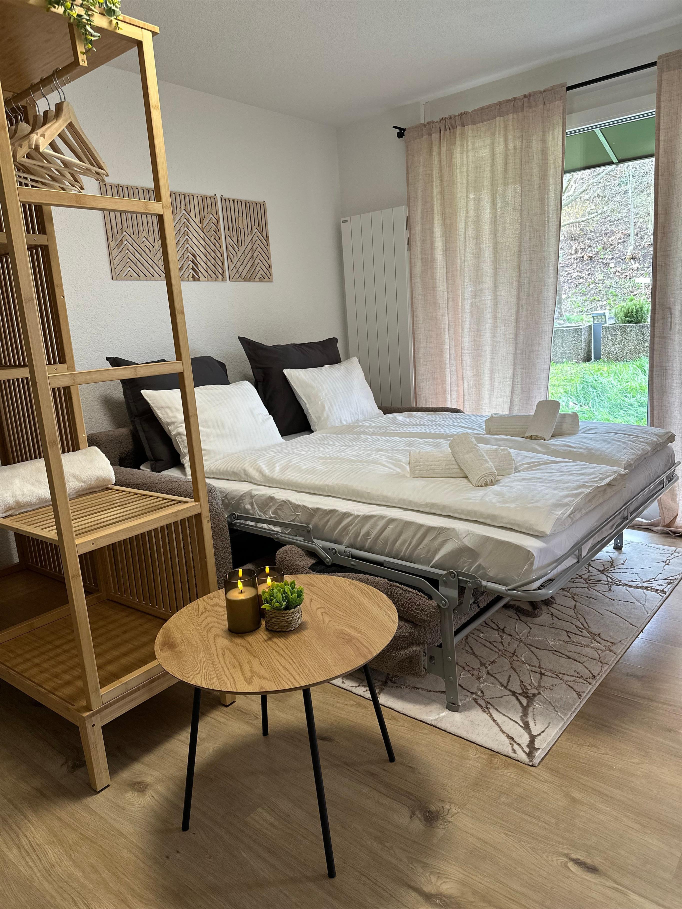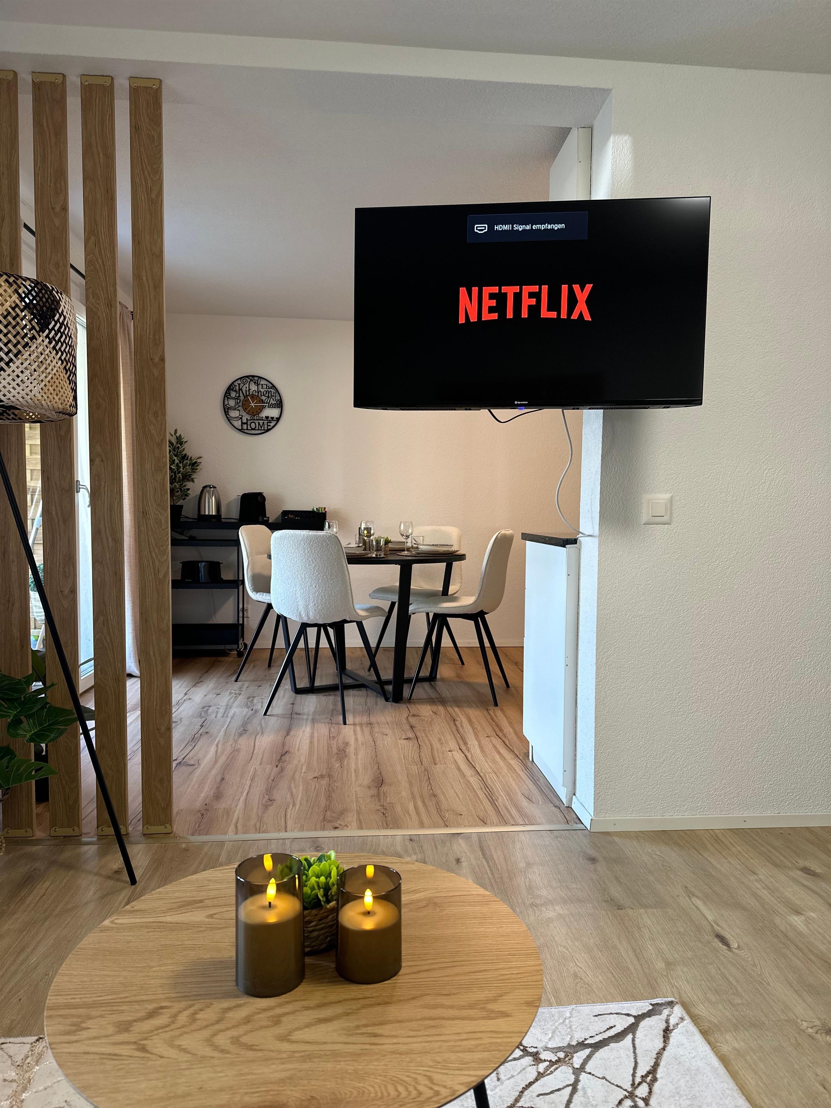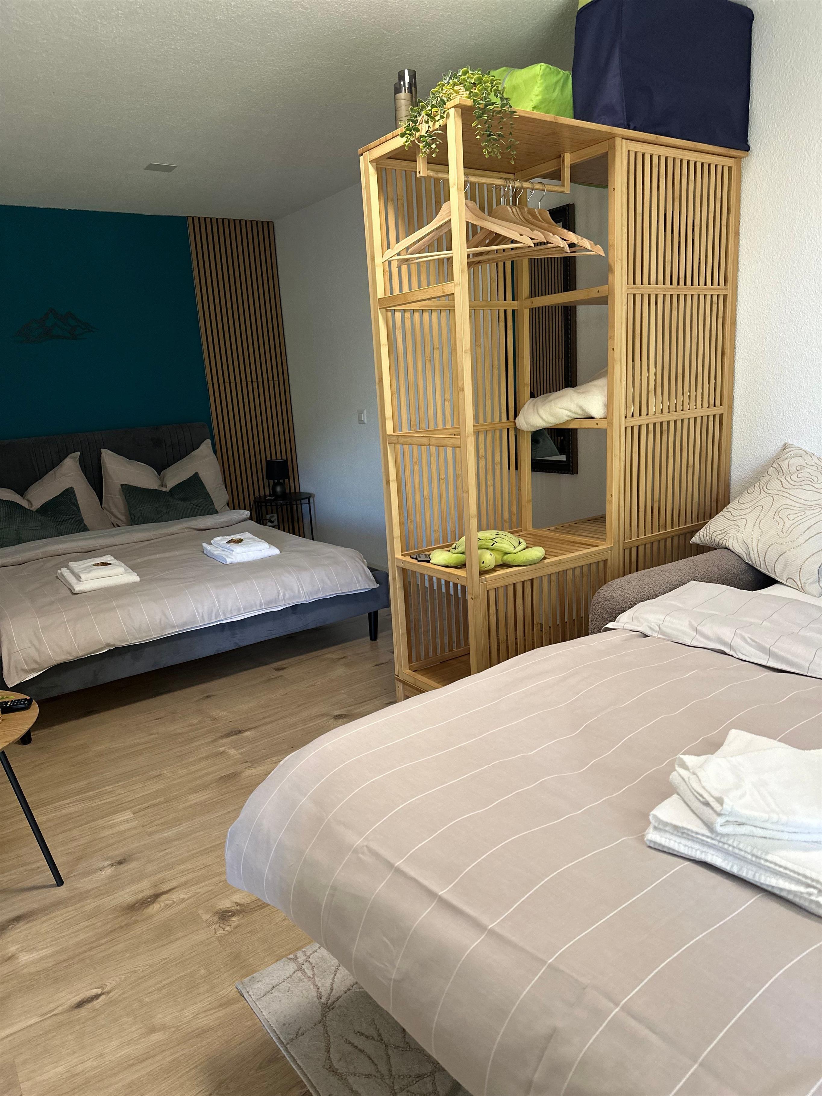 Das Innere der Wohnung ist praktisch ausgestattet, um Ihren Aufenthalt so angenehm wie möglich zu gestalten. Ein wichtiges Merkmal ist die voll ausgestattete Küche mit Cerankochfeld, Kapsel-Kaffeemaschine, Spülmaschine und Wasserkocher, die keine Wünsche offen lässt. Die Annehmlichkeiten und die wohl durchdachte Aufteilung sorgen dafür, dass sich kleine Familien oder Gruppen hier sofort zu Hause fühlen können.