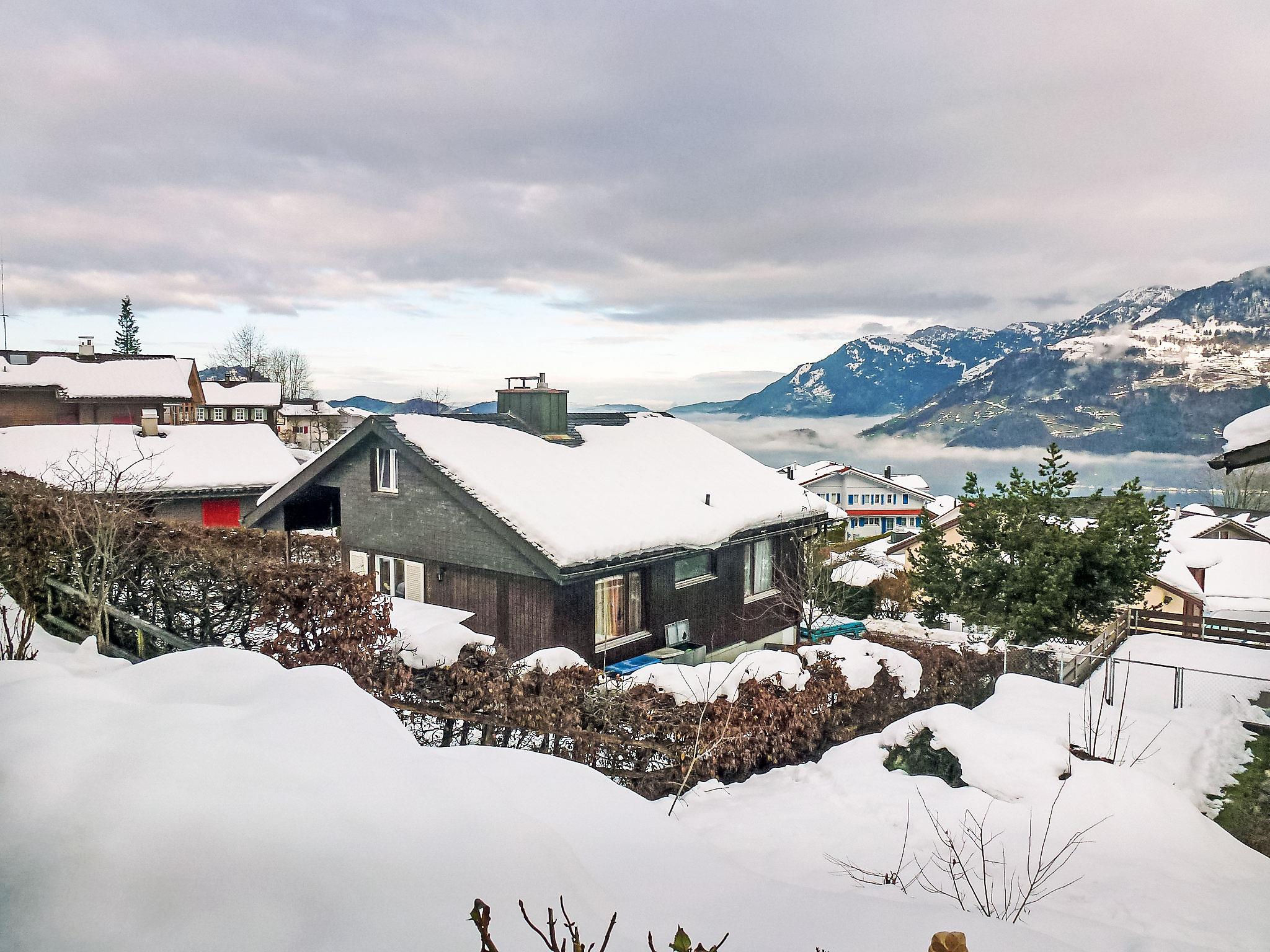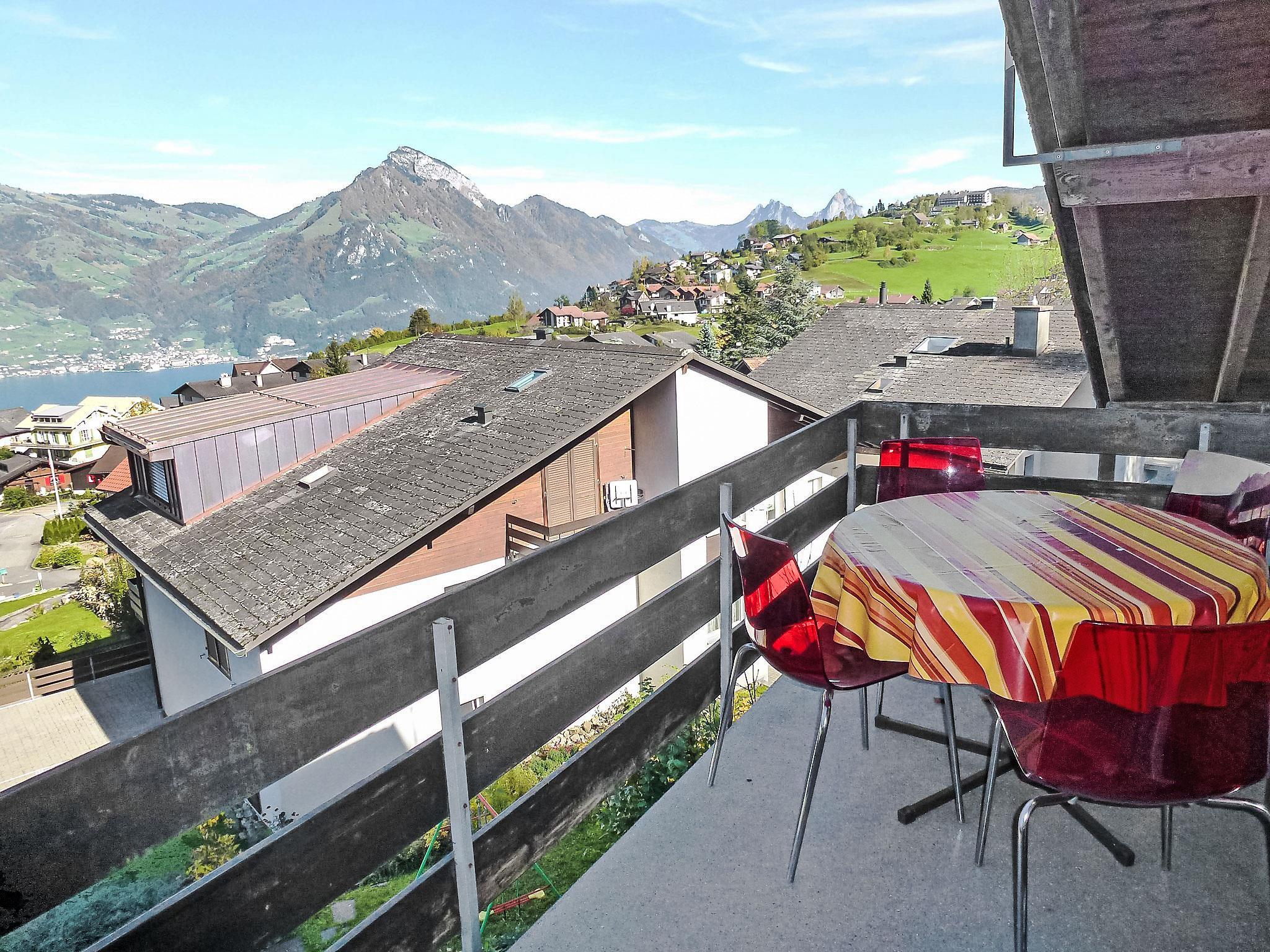 "Flodana", 3-Zimmer-Wohnung 58 m2 im 1. Stock, Südlage. Schön und geschmackvoll eingerichtet: offenes grosses Wohn-/Esszimmer mit 1 Diwanbett, Schwedenofen, Esstisch, Essecke und Kabel-TV (Flachbildschirm). Ausgang zum Balkon. 1 abgeschrägtes Doppelzimmer mit 1 franz. Bett (160 cm, Länge 200 cm). 1 abgeschrägtes Kinderzimmer mit 2 Betten (90 cm, Länge 200 cm). Offene Küche (Backofen, Geschirrspüler, 4 Glaskeramikplatten, Mikrowelle, Grill, elektrische Kaffeemaschine, Racletteofen, Fondue Set (Käse)). Ausgang zum Balkon. Bad/WC. 2 Balkone. Terrassenmöbel, Liegestühle (2), Sitzplatz. Herrliche Panoramasicht auf den See, die Berge, das Tal, die Landschaft und auf den Vierwaldstättersee. Zur Verfügung: Bügeleisen, Kinderhochstuhl, Babybett bis 2 Jahre (extra), Haartrockner. Internet (Wireless LAN, gratis). Parkplatz (1 Auto) beim Haus. Bitte beachten: Nichtraucher-Unterkunft.