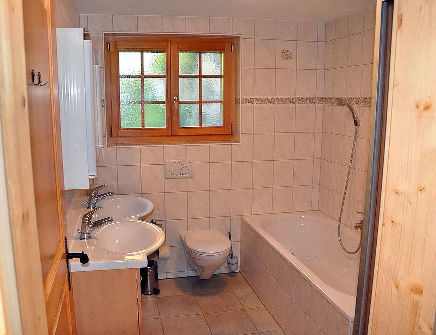 Zweites Badezimmer mit Badewanne, Waschbecken und Toilette – liegt im Erdgeschoss.