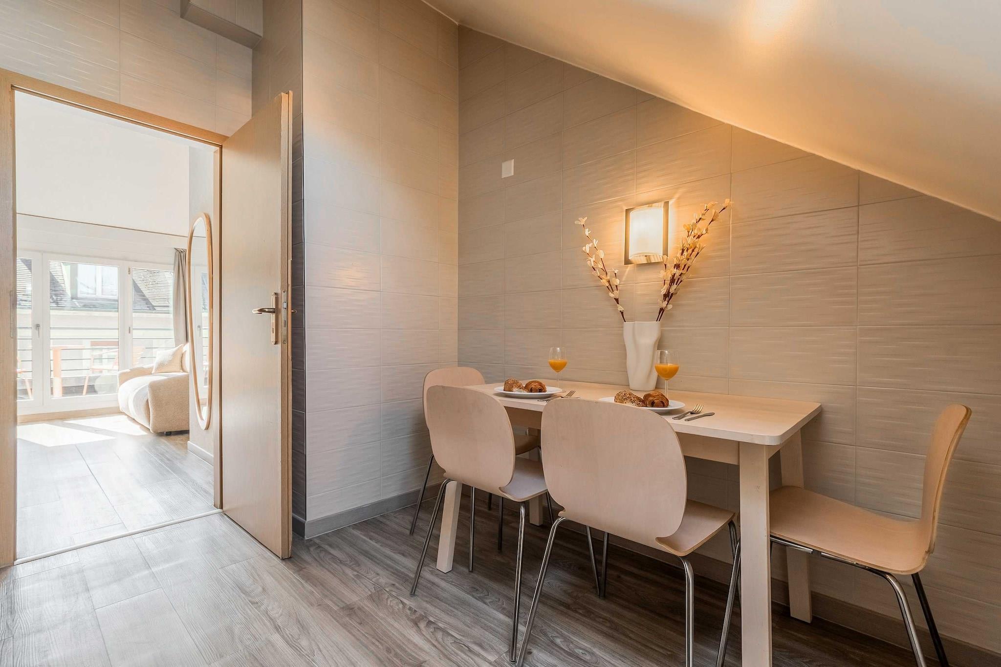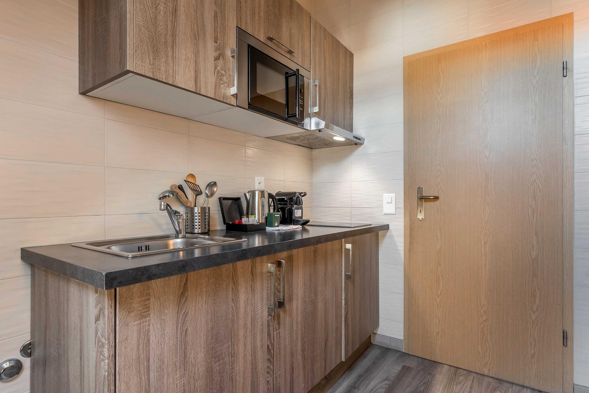 In der 6. Etage: (Küche(Kochplatte, Wasserkocher, Kaffeemaschine, Mikrowelle, Kühlschrank, elektrische Kochplatten, , , Wine glasses), Wohn-/Schlafzimmer(Schlafcouch 1 Pers., Doppelbett, TV(Flatscreen)), Badezimmer(Dusche, Toilette, Föhn, , , ))