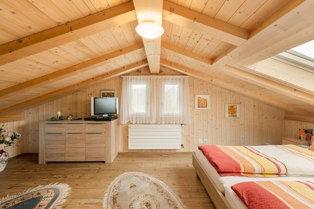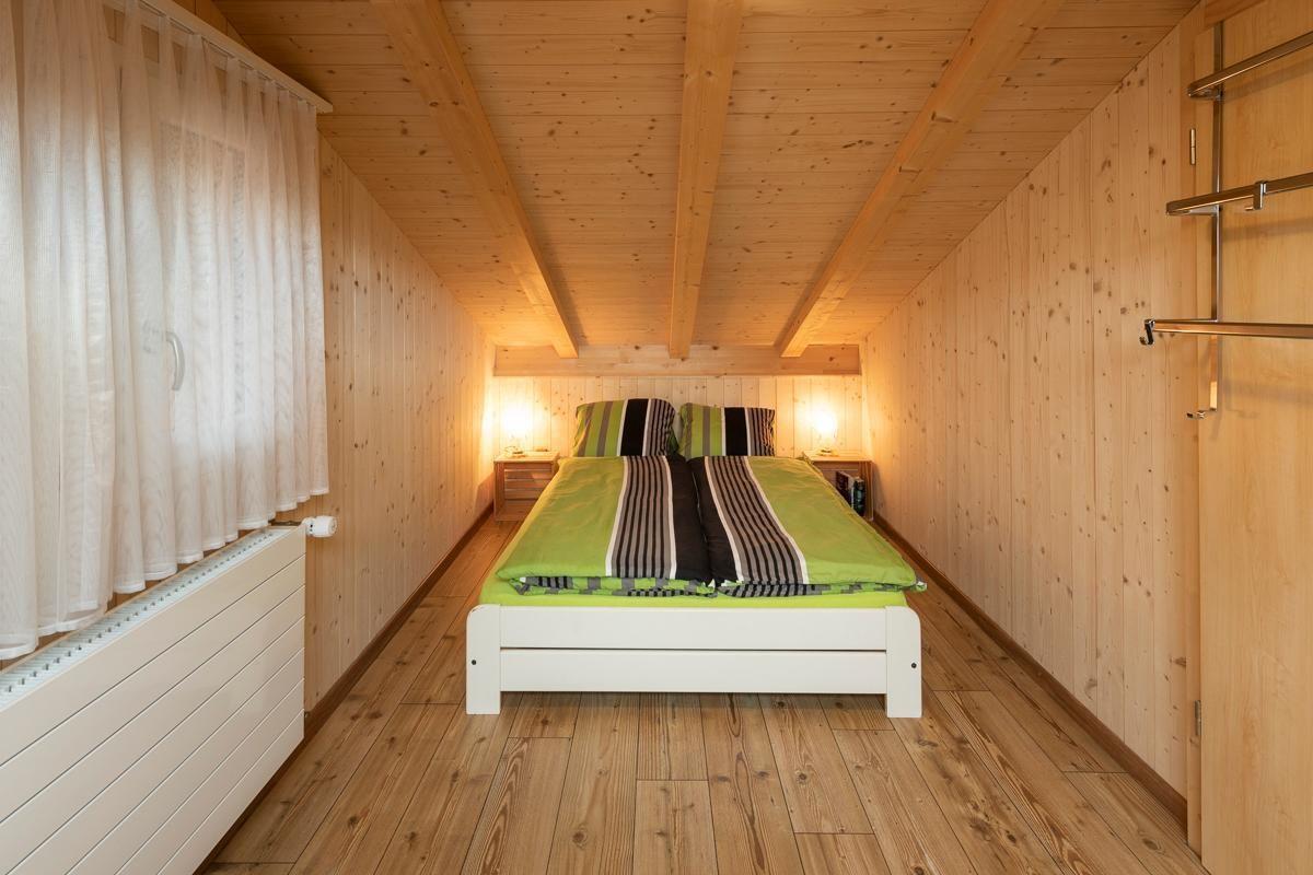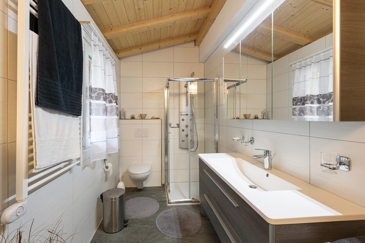 Im Parterre ist eine offene Küche mit Vorraum, sowie das Wohn- und Esszimmer mit Fernseher. Im Anbau befindet sich das Badezimmer mit einer Dusche, WC, Lavabo und Waschmaschine sowie Tumbler. Die Warmwasseraufbereitung wird mit einer Luft Wärmepumpe ausgeführt, weshalb der ganze Parterre-Bereich mit Bodenheizung und Keramikplatten ausgestattet ist.