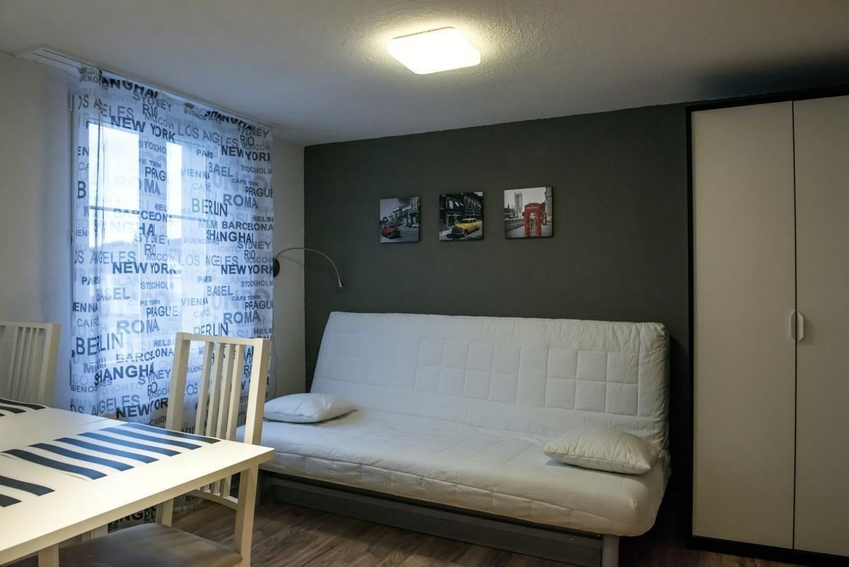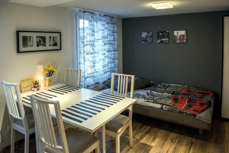 Sonstige Wohnzimmerausstattung (Wohnzimmer1): Der Raum ist als Studio eingerichtet. - Schlafsofa mit einer Liegefläche von 1,6 x 2 Meter- Esstisch mit 4 bis 6 Stühlen, je nach Belegung.- Kleiderschrank- Komplett eingerichtete Küche, Kaffeemaschine, Microwelle, Geschirrspühler.- Curved HD-TV 40" mit Hispeed Internet, ca. 250 TV-Sender, Streamingdienste, Salt TV