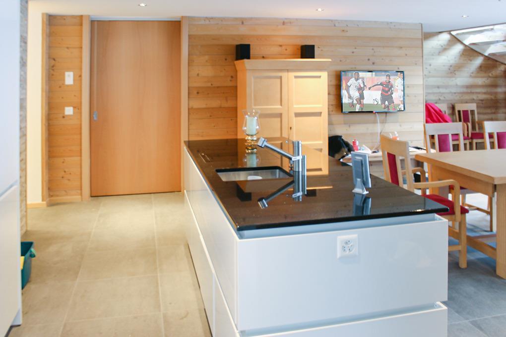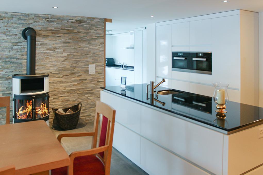 Parterre: Großer Küchen-/Essraum (50 qm) mit Kaminofen, Smart-TV, Esstisch, moderner Einbauküche (Kochinsel, Backofen, Dampfgarer, Mikrowelle, Spülmaschine). Zwei Doppelzimmer. Bad: Bw, Wb, WC. Weiteres Bad: Dusche, 2 Wb, WC.