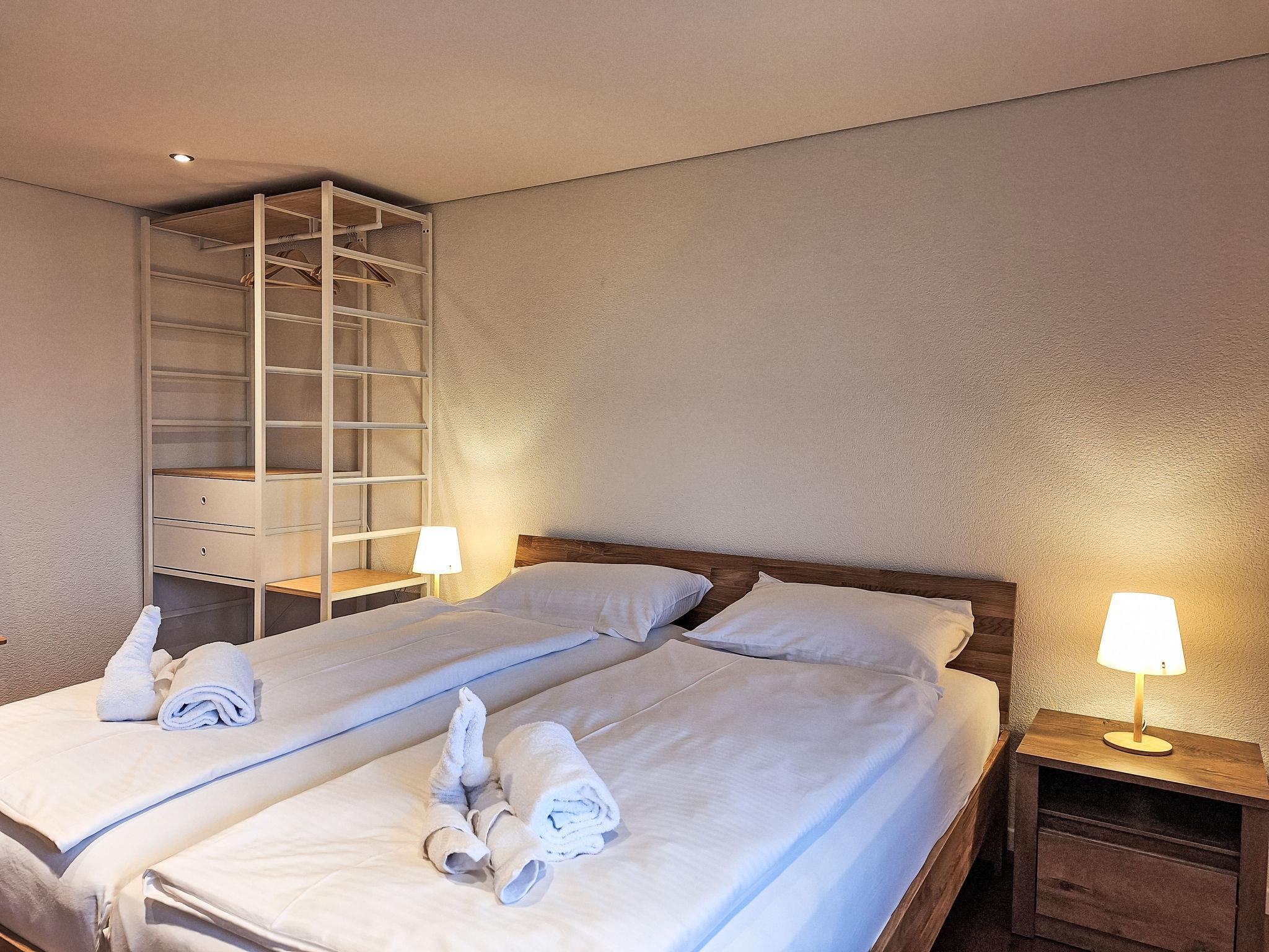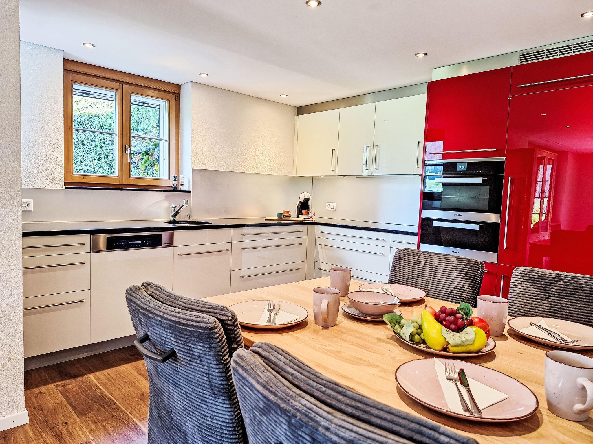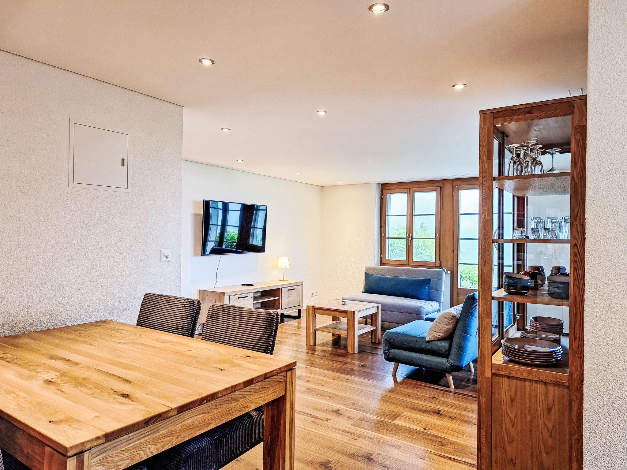 "Chalet Adlerhorst EG", 3-Zimmer-Wohnung im Erdgeschoss, Südlage. Geräumig und hell, sehr komfortabel und geschmackvoll eingerichtet: offenes grosses Wohnzimmer mit Kabel-TV und Flachbildschirm. Ausgang zur Terrasse. 2 Zimmer, jedes Zimmer mit 1 Doppelbett (2 x 90 cm, Länge 200 cm). Grosse, offene Küche (Backofen, Geschirrspüler, 4 Glaskeramikplatten, Toaster, Wasserkocher, Mikrowelle, elektrische Kaffeemaschine, Kapseln für die Kaffeemaschine (Dolce Gusto) extra) mit Esstisch. Bad/WC. Fussbodenheizung. Grosse Terrasse, Südlage. Terrassenmöbel. Herrliche Panoramasicht auf die Berge, das Tal und die Landschaft. Zur Verfügung: Haartrockner. Internet (WLAN, gratis). Parkplatz. Bitte beachten: Nichtraucher-Unterkunft. Rauchmelder, Feuerlöscher.
