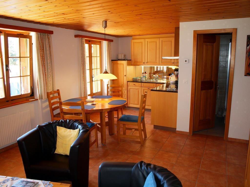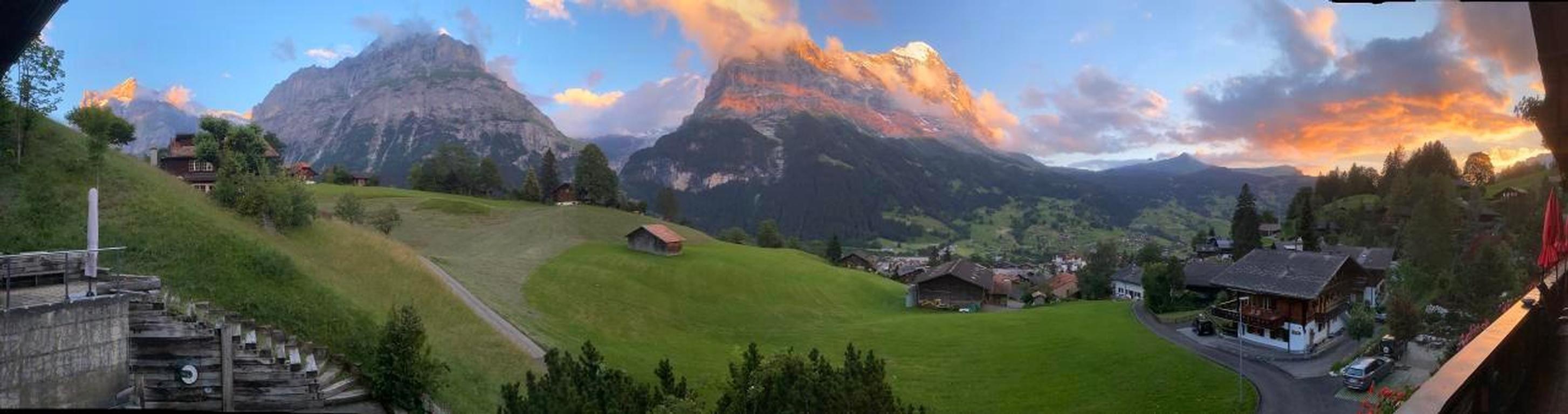 Helle, 37 m2 grosse 2-Zimmerwohnung in einem heimeligen Einfamilien-Chalet an ruhiger und sonniger Lage. 300° Sicht auf die einzigartige Grindelwalderbergwelt (Wetterhorn, Mettenberg, Eismeer, Fiescherhorn Eiger, Eigernordwand, Tschuggen und Männlichen). Balkon/Liegewiese mit Liegestühlen und Brunnen sowie Ratan-Lounge auf der grossen Terrasse.